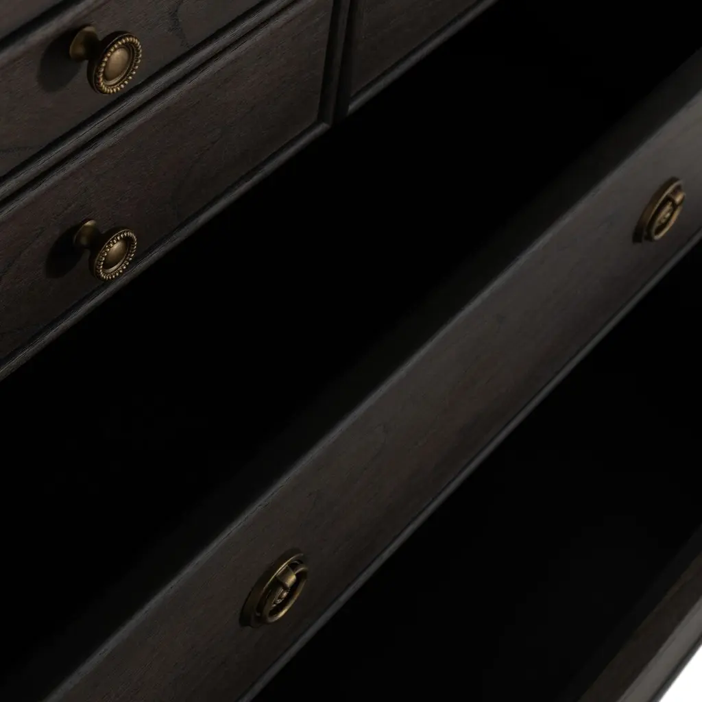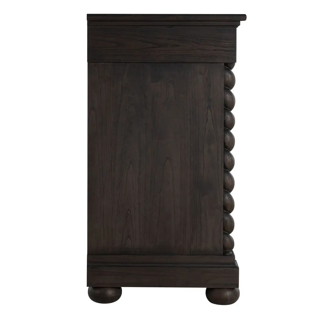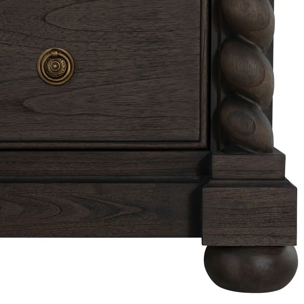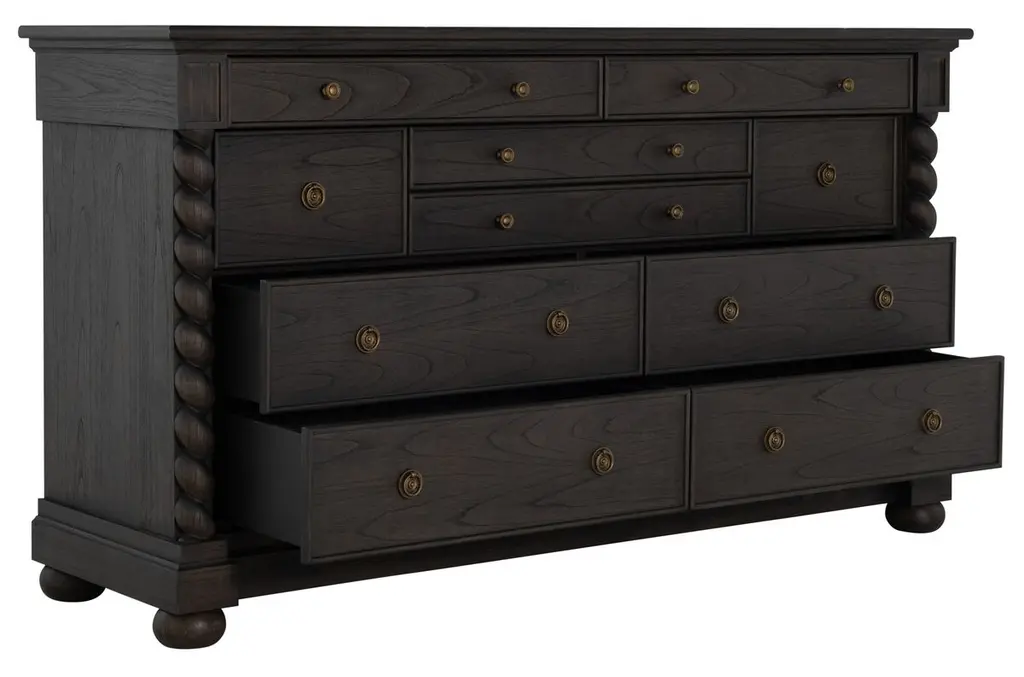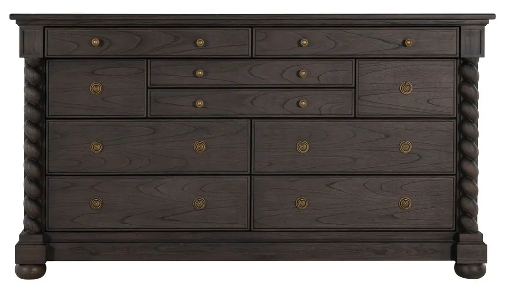 The Burkhardt Dresser is a bold statement piece, embodying traditional design elements with a grand presence. It offers ample storage through its variously sized drawers, combining both functionality and intricate design. The standout features include barley twist columns and layered trim detailing, lending a timeless elegance to the piece. Crafted from durable mindi wood, this dresser is perfect for those who value both classic style and practical storage solutions, making it an elegant and functional addition to any space.