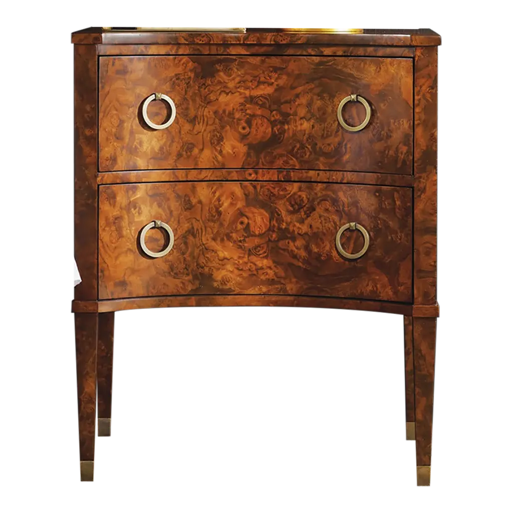 Its incurved front and tapered legs create a refined silhouette, while the burl wood grain adds depth and character. Designed for both traditional and modern spaces, it blends function with luxury. Antique brass hardware enhances its vintage charm, and two spacious drawers provide ample storage. Whether in a master suite or entryway, this piece elevates any space with its distinguished elegance. Dimensions: 40" W x 18.5" D x 34" H