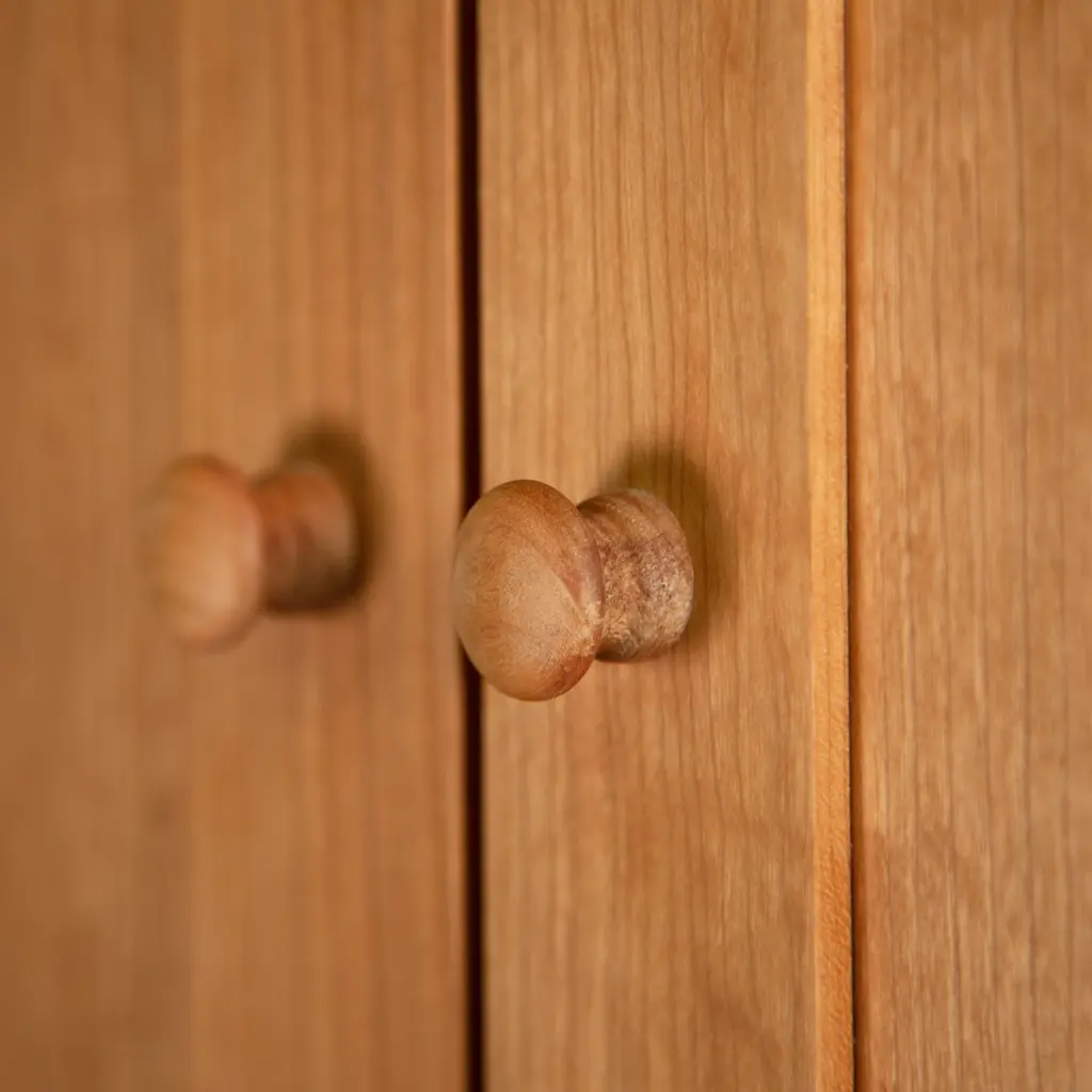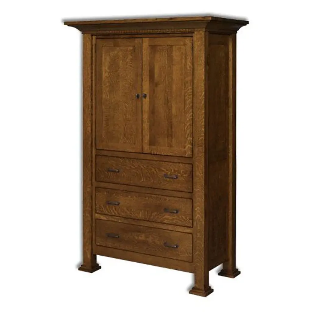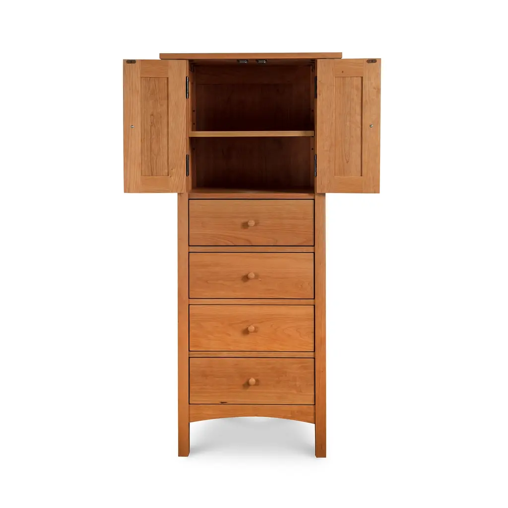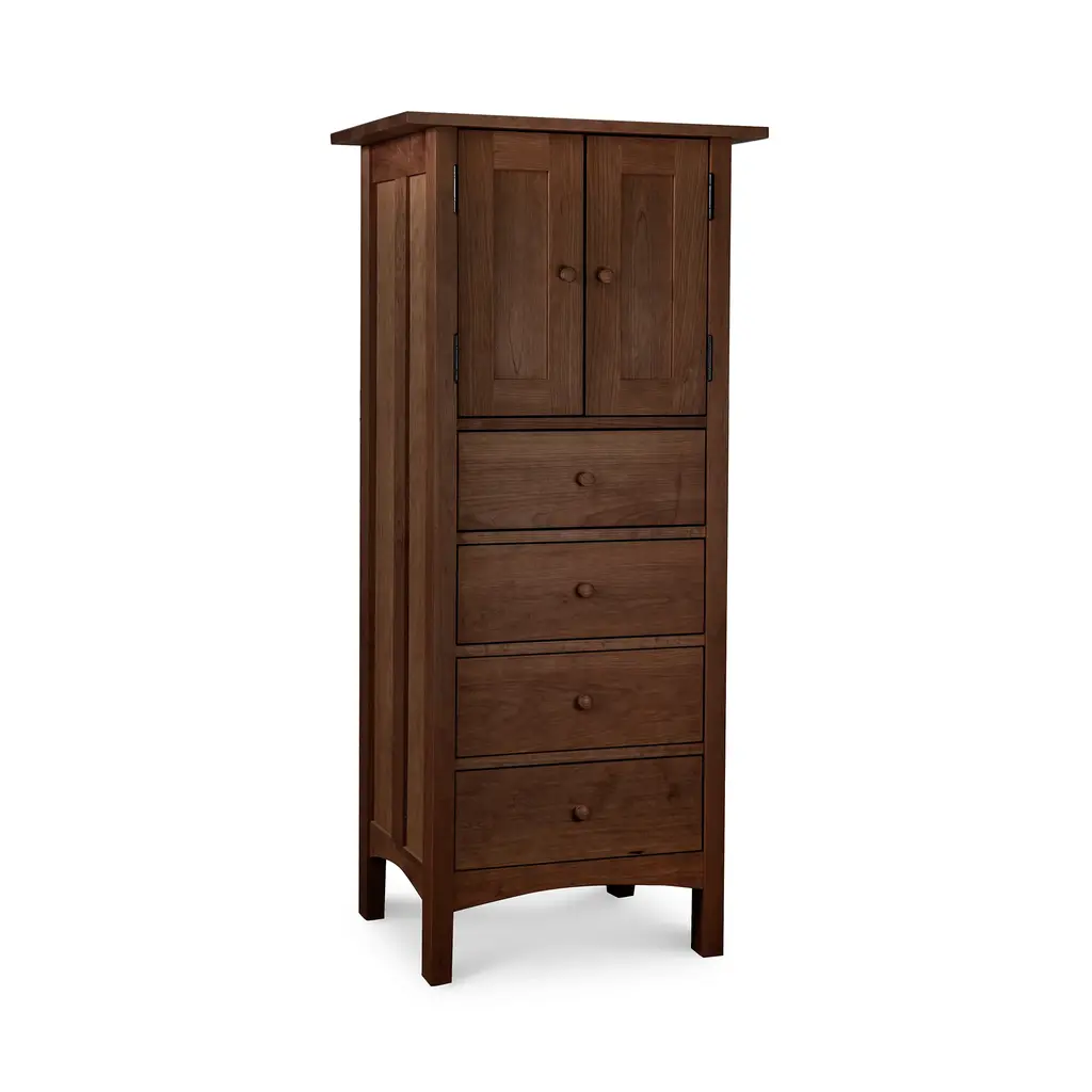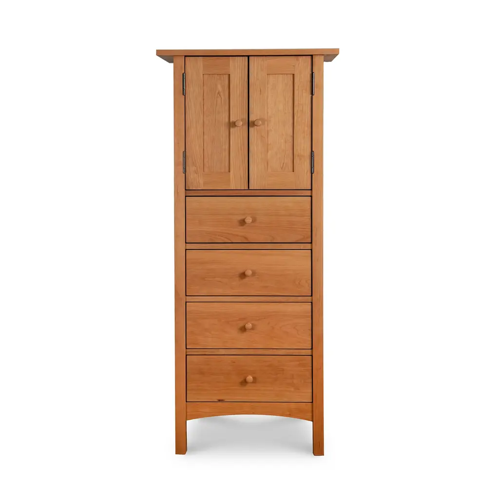 Our high-end solid wood Burlington Shaker Style Tall Storage Chest features four drawers and a two doored cabinet. It's narrow armoire design makes a great storage solution for a small space in the contemporary bedroom. With ample storage space and an adjustable shelf in the top cabinet section, this tall storage chest accommodates a wide range of storage needs. All our Burlington Shaker fine furniture collection is handcrafted to order in Vermont in your choice of solid cherry, maple, or walnut woods with an eco-friendly oil finish that not only protects but enhances the natural beauty of the wood. Heirloom quality built for generations of use.Base price represents chest in natural cherryShown in natural cherry wood with straight edge profileMatching furniture available in our Burlington Shaker Furniture Collection