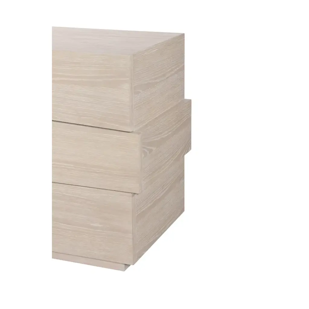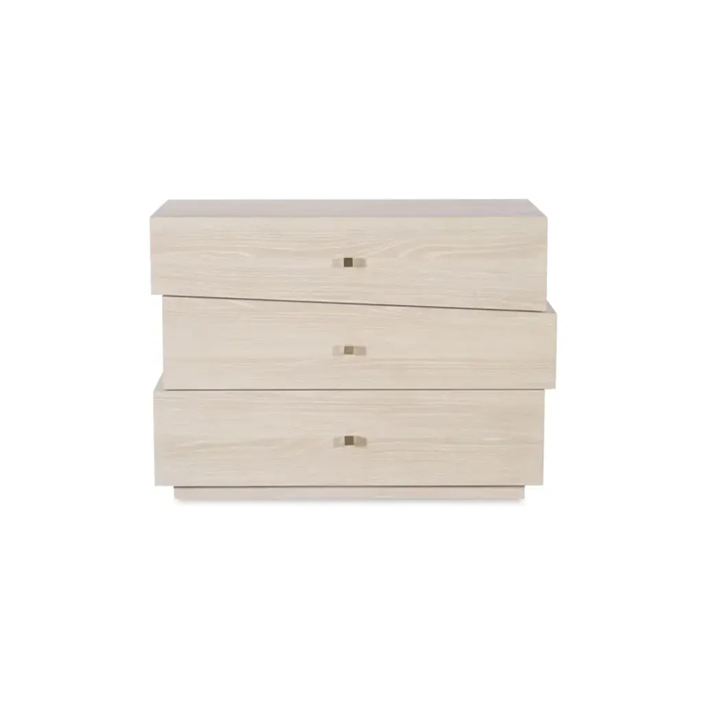 The Cadence Three Drawer Chest features an asymmetrical, stacked drawer formation all resting on a plinth base. Each of the three push latch drawers is cut slightly off square adding to the sculptural quality of the chest which is yet also functional. Crafted in oak solids and narrow heart oak veneer on top, this chest is a true work of art.