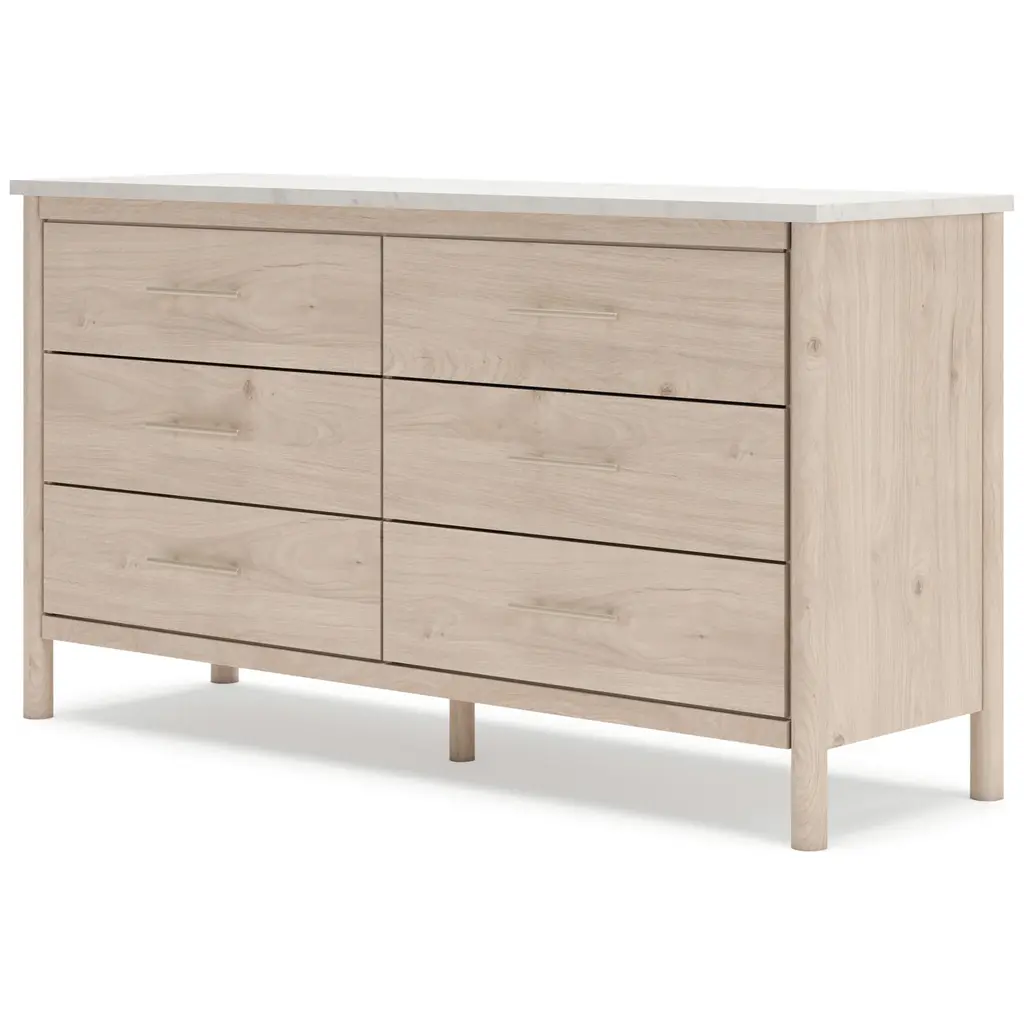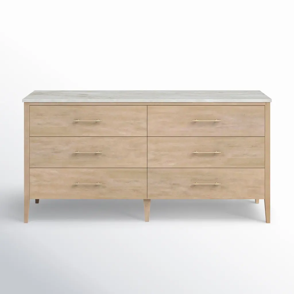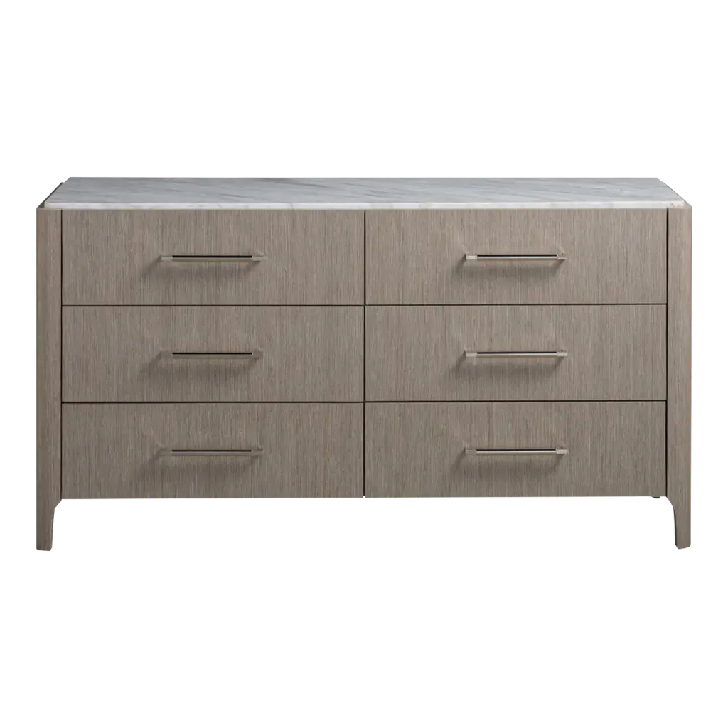 A casual contemporary design with a smooth, light finish and white marble top. 6 Drawers feature smooth side roller glides and champagne colored finished handles. - Product Details provided by Manufacturer, Slumberland not responsible for errors in information.