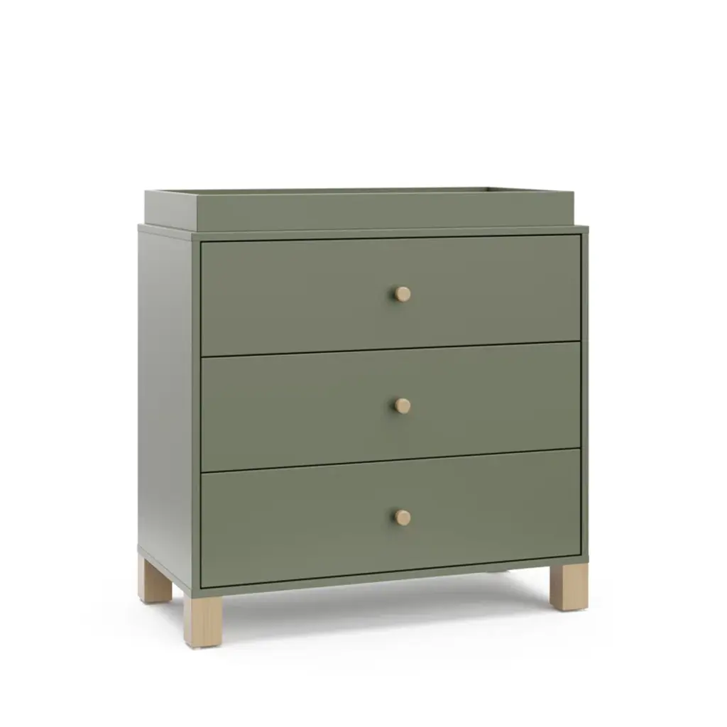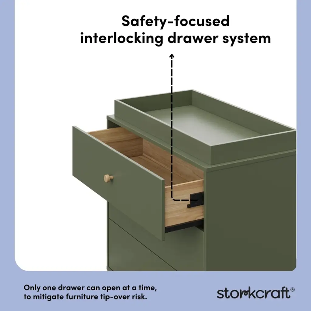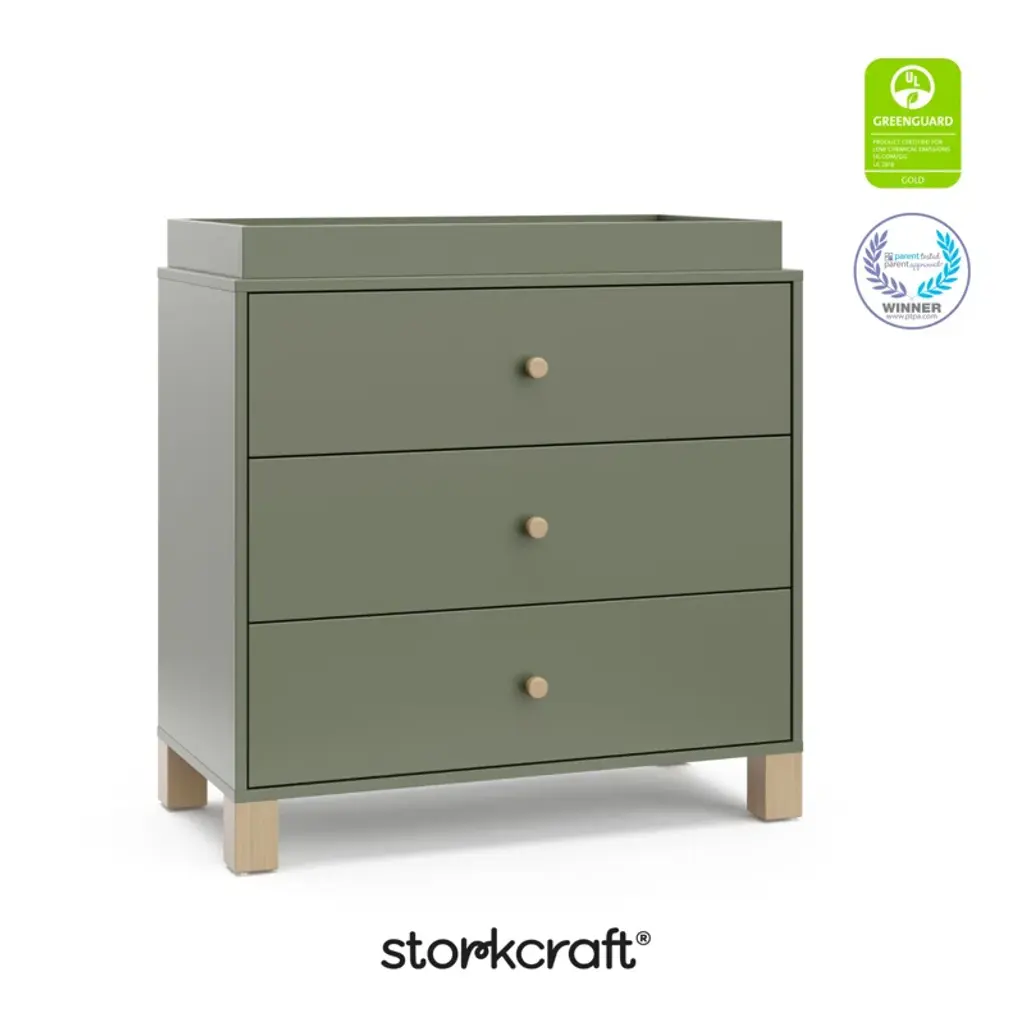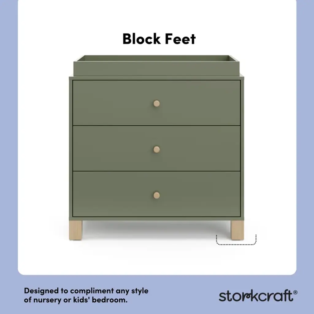 Introducing the Storkcraft California 3-Drawer Chest with Topper – the latest addition to our stylish signature Storkcraft California collection. This modern, minimalist chest is designed to complement any nursery or kids' bedroom with its clean lines, stylish block feet, and spacious drawers. Its sleek look ensures it blends seamlessly with a variety of décor styles, adding both charm and functionality. The California Chest features three roomy drawers for organizing essentials and comes with a removable changing topper that fits any standard-size baby changing pad (not included). Once your child outgrows the nursery stage, simply remove the topper, and it transitions into a modern 3-drawer chest that suits any room in your home, offering longevity and versatility far beyond the early years. For easy assembly, we’ve pre-installed the drawer tracks, ensuring a smooth, hassle-free, easy assembly experience. The innovative interlocking drawer system adds extra safety by allowing only one drawer to open at a time, minimizing the risk of tip-over when paired with the included furniture restraint kit.