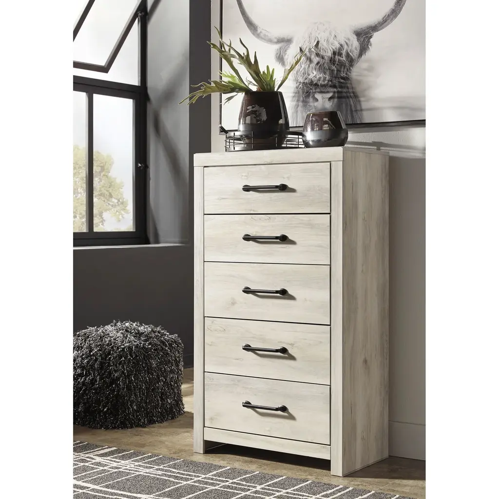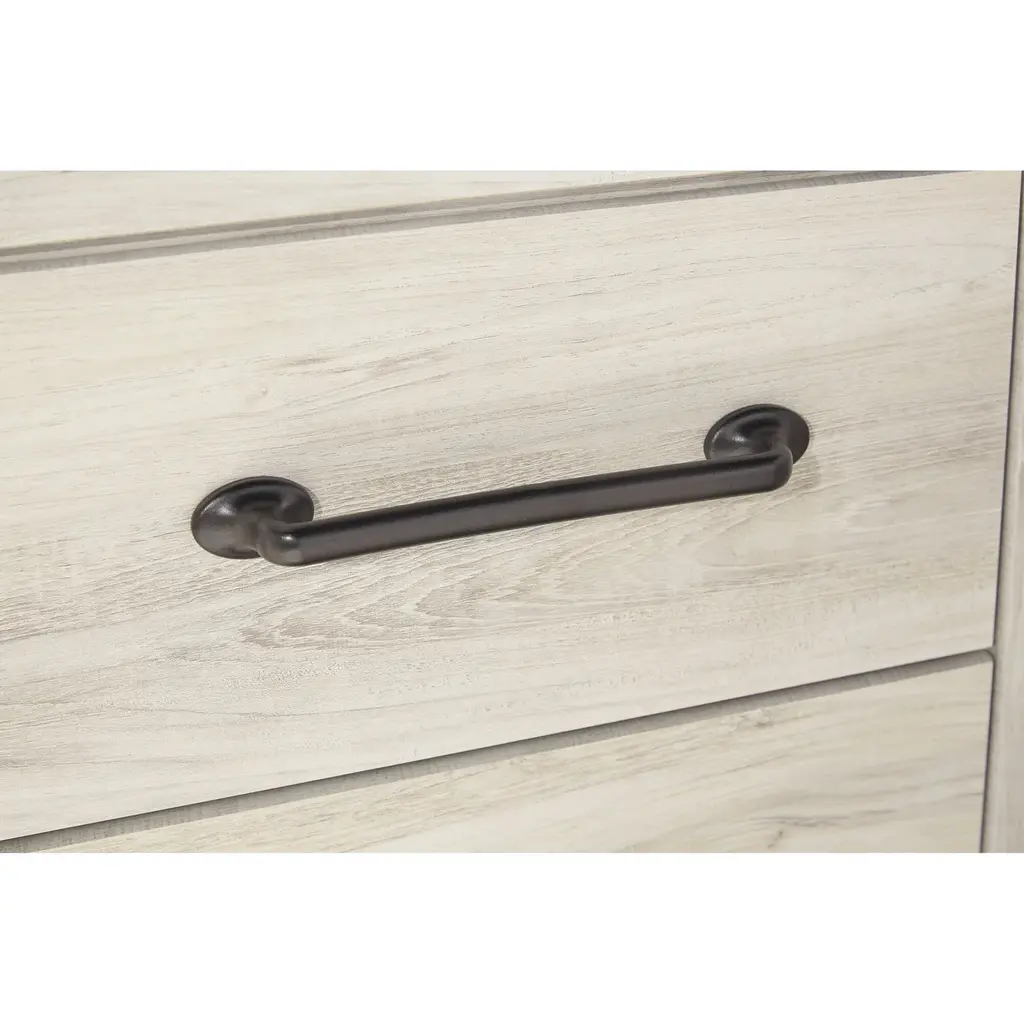 The Cambeck 5-drawer chest is all sleek, modern lines with a hint of farmhouse influence in the faux whitewash finish. Dark, oversized drawer pulls add the element of the unexpected to this transitional look. Side roller glides assure smooth drawer operation, and drawer interiors are laminated so there's no snagging. Made of engineered wood, this chest has a replicated wood grain finish perfectly complemented by the whitewash finish. Add the rest of the Cambeck bedroom pieces for a coordinated look.