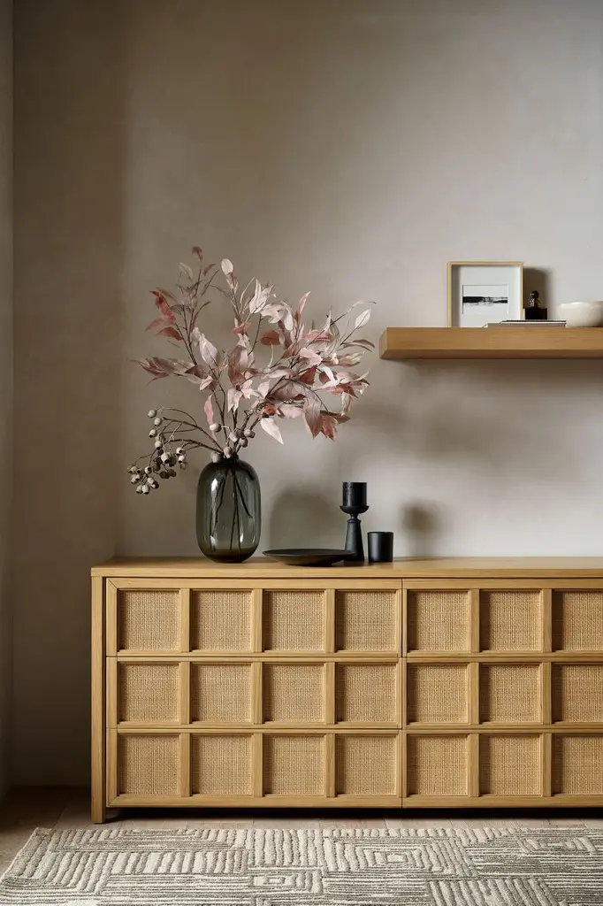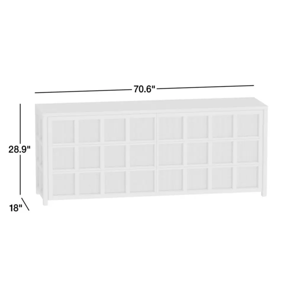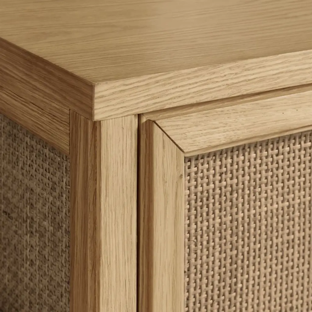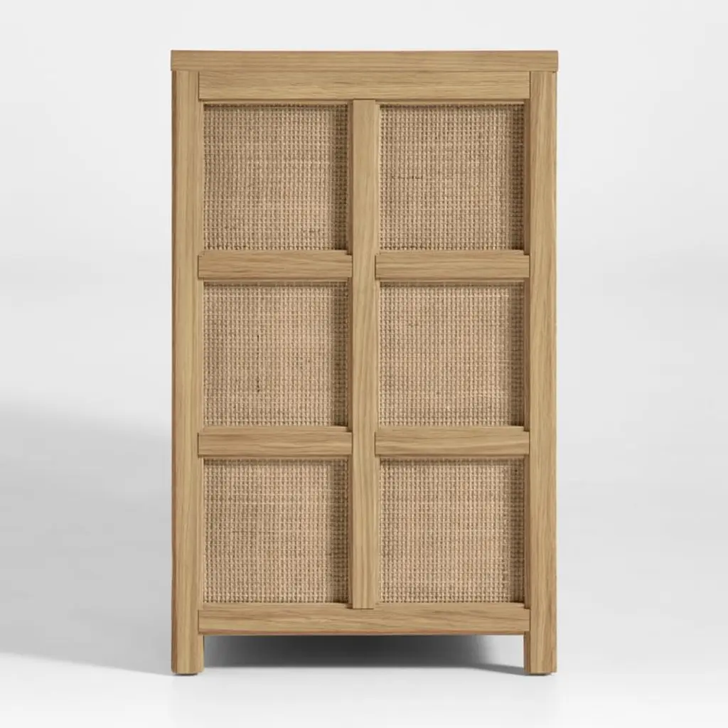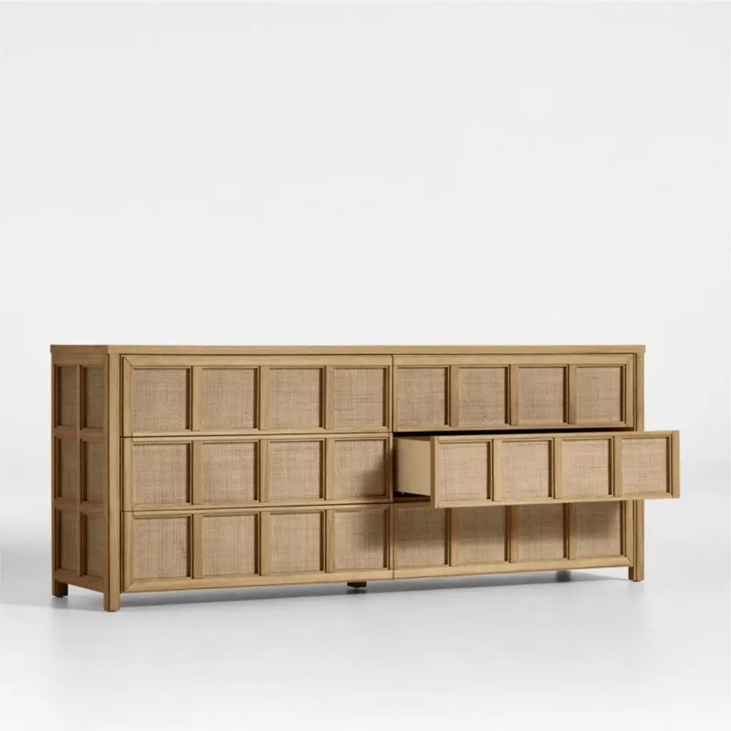 Simple symmetry and airy rattan caning keep our Campagna dresser looking fresh and timeless. For a view of fine craftsmanship from several angles, the dresser is wrapped from front to sides with a grid pattern made of woven rattan framed in solid oak. Hidden finger grooves on the six drawers maintain a seamless facade while providing access to lots of storage space. A natural oak finish ties it all together, complementing the natural hue of the rattan detailing.