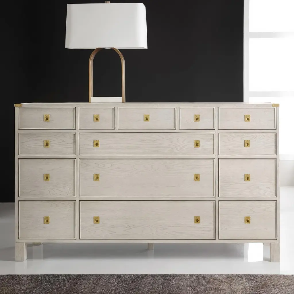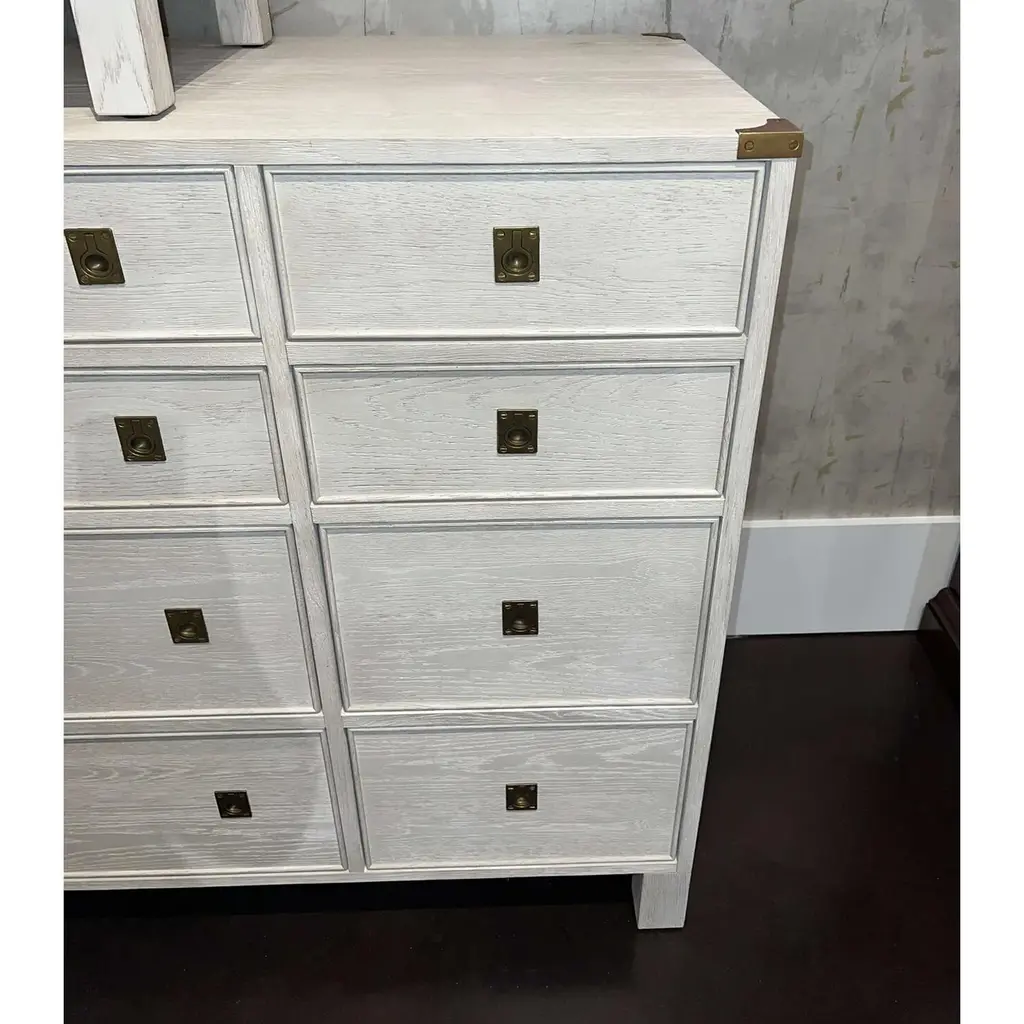Classic campaign furniture, this refined dresser combines traditional military aesthetics with contemporary craftsmanship. The white-painted oak construction features a carefully wire-brushed finish that emphasizes the wood's natural grain, while squared brass backplates and corner details pay homage to the original traveling furniture of British officers. The fourteen-drawer configuration provides versatile storage while maintaining the distinctive proportions of campaign-style furniture. The piece's architectural stance is supported by sturdy posted feet, making it equally suited for use as a bedroom dresser or dining room buffet. Dimensions: 72" W x 22" D x 42" H
