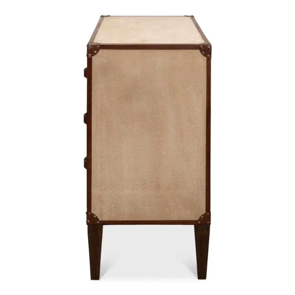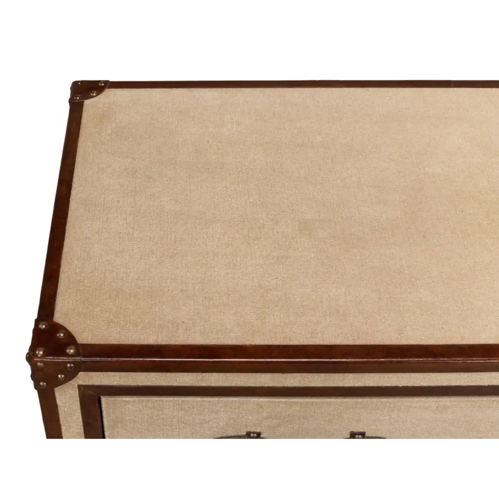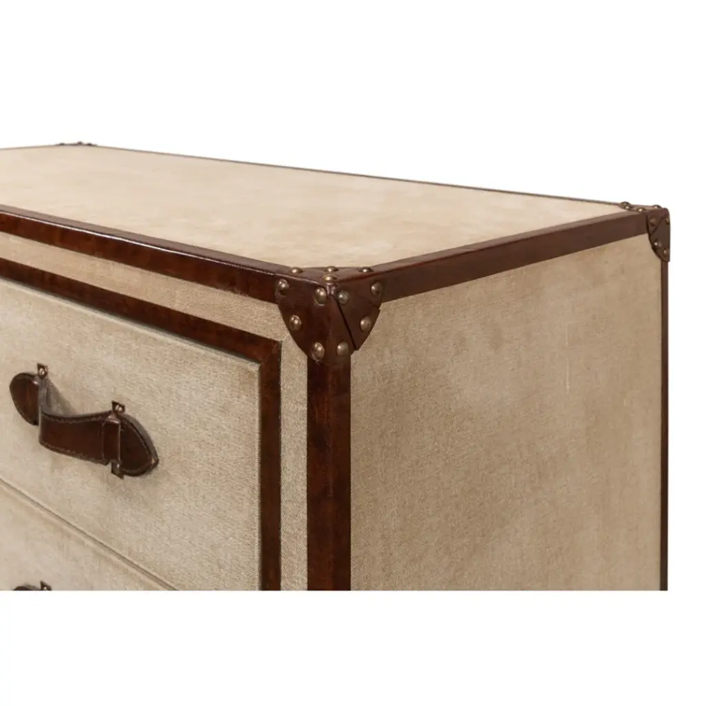 Details matter, and this french art deco 3-drawer chest checks all the boxes. Leather appointments adorn this gorgeous beige canvas chest. The waved bottom adds an unexpected feature.
