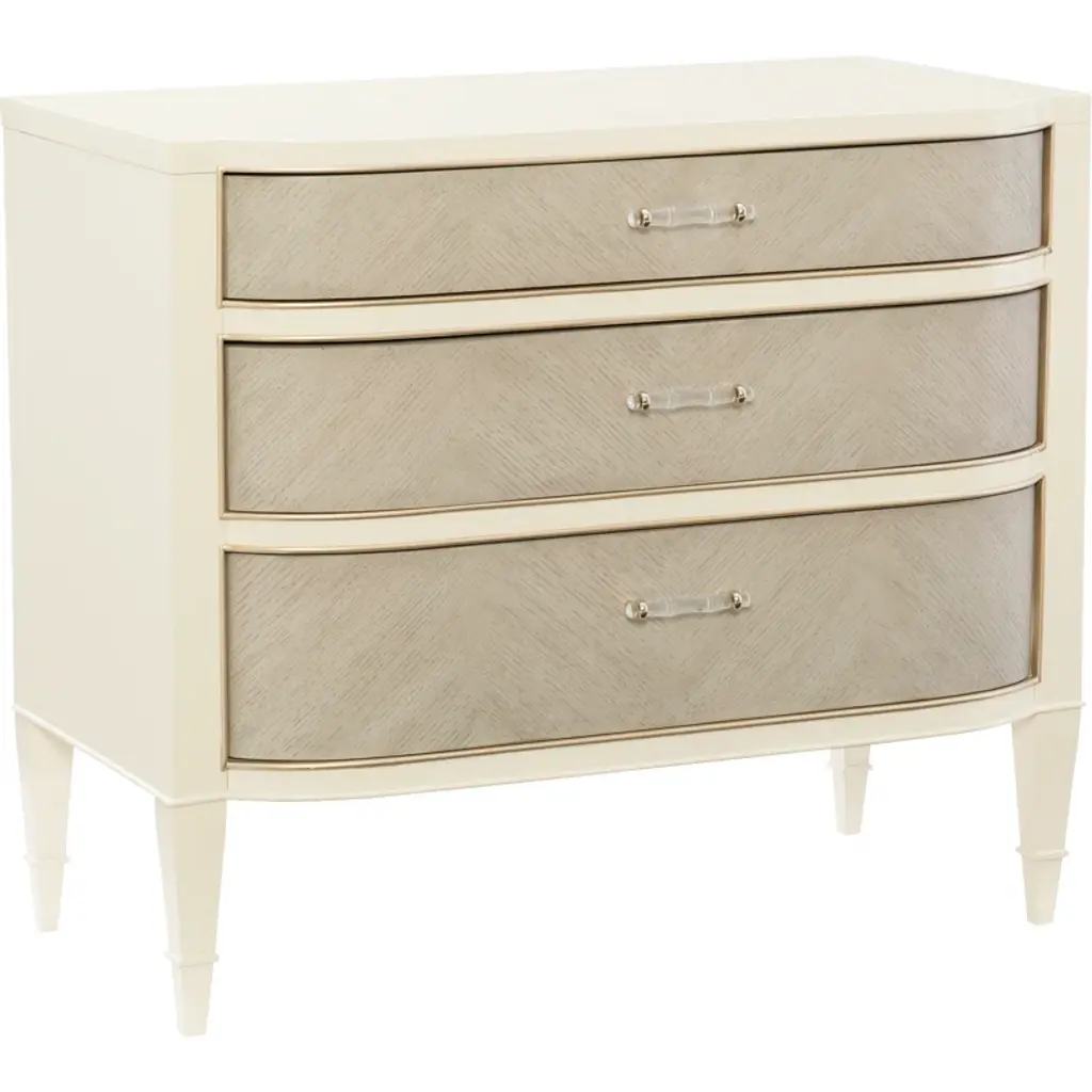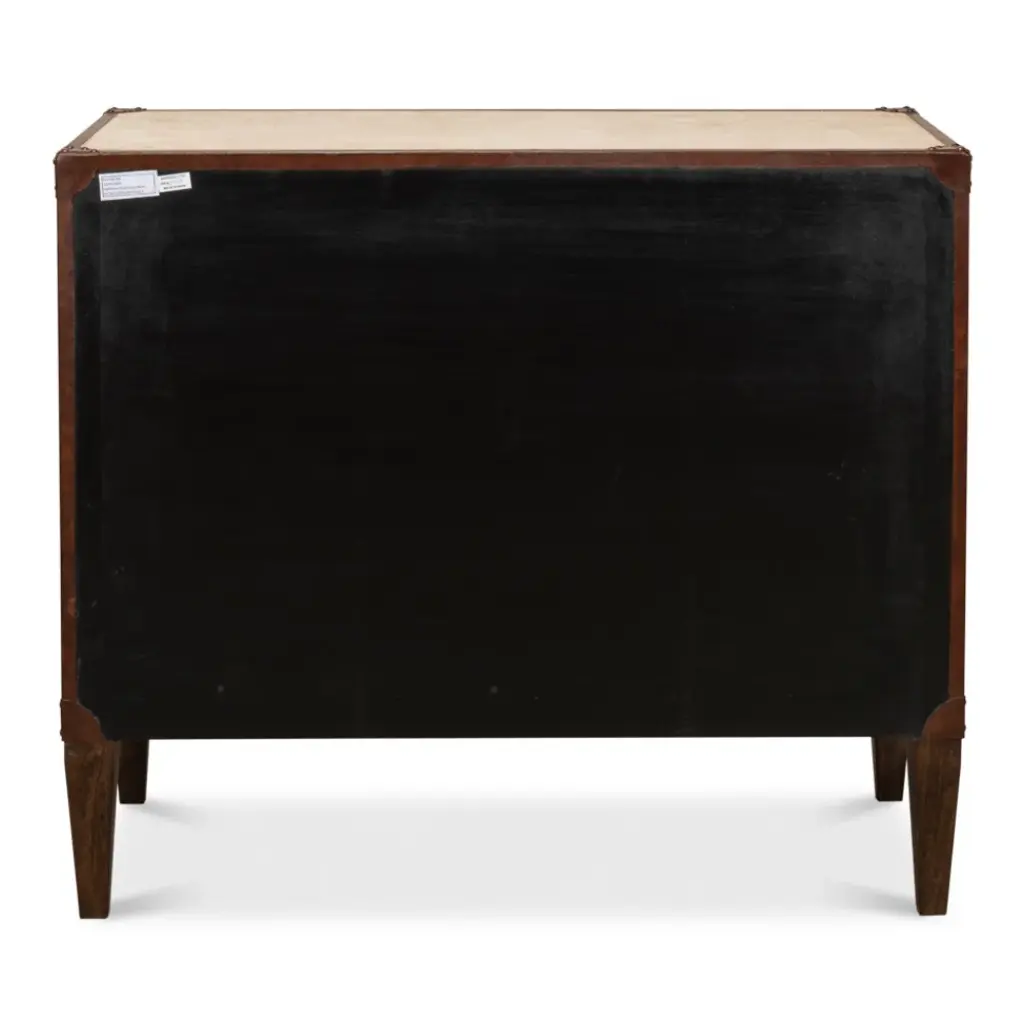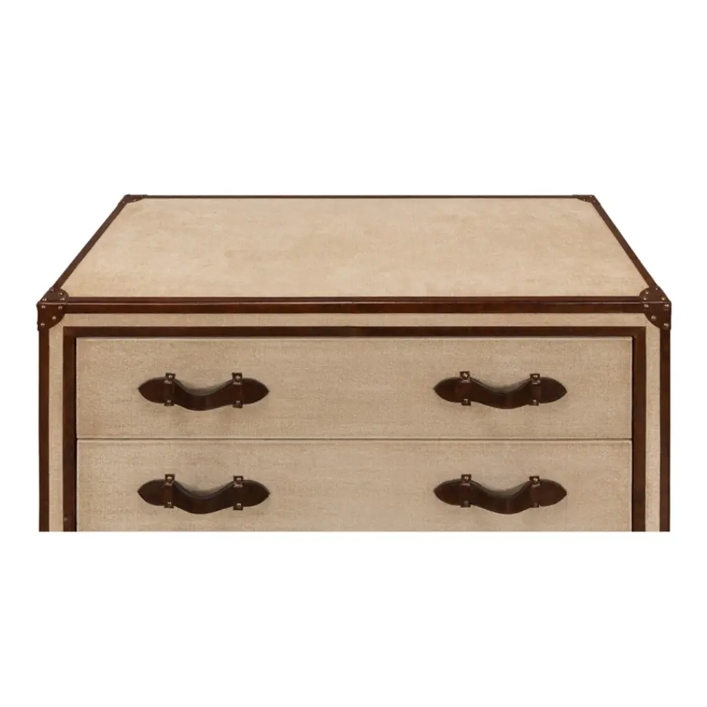 Details matter, and this french art deco 3-drawer chest checks all the boxes. Leather appointments adorn this gorgeous beige canvas chest. The waved bottom adds an unexpected feature.
