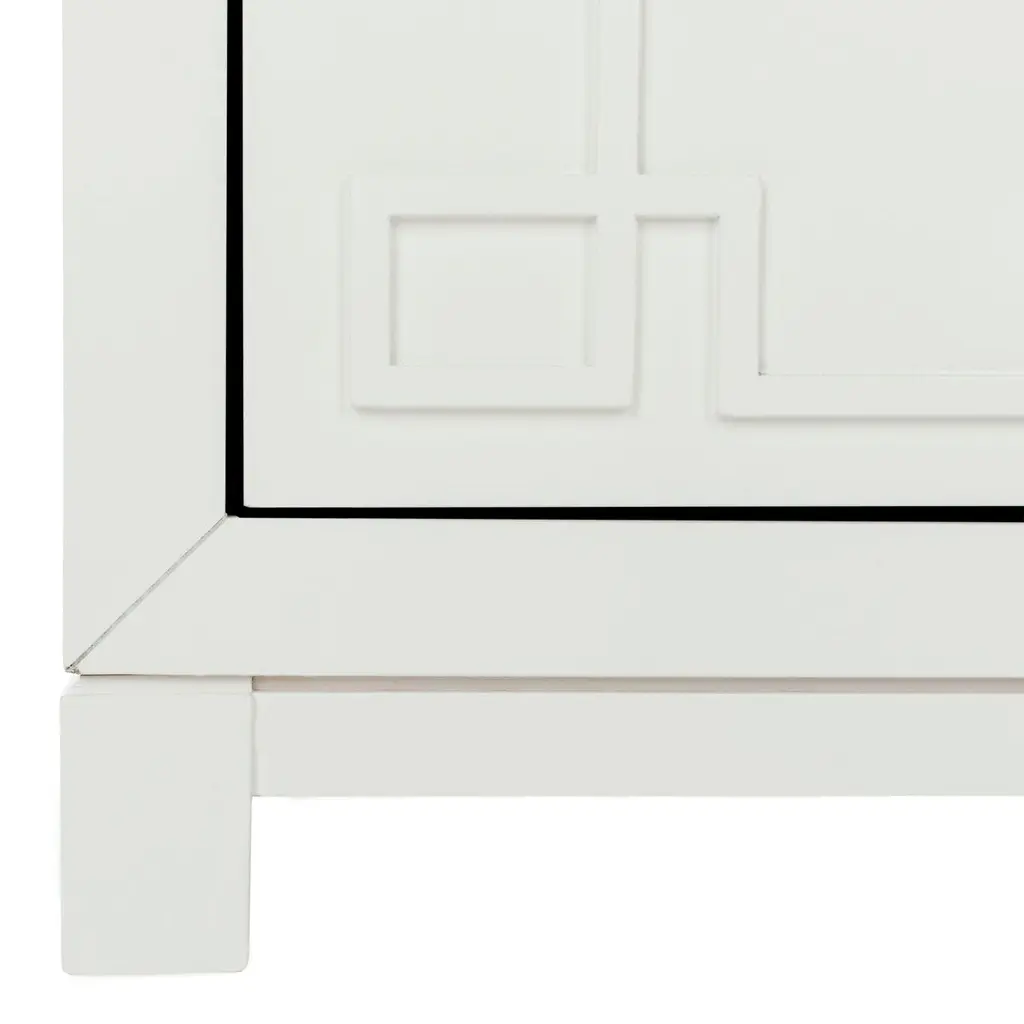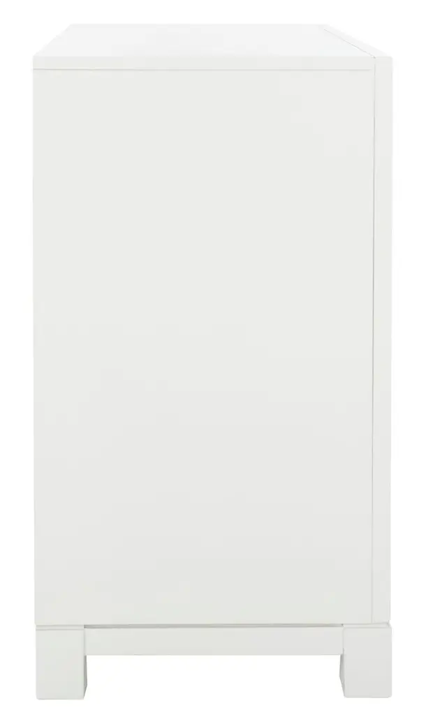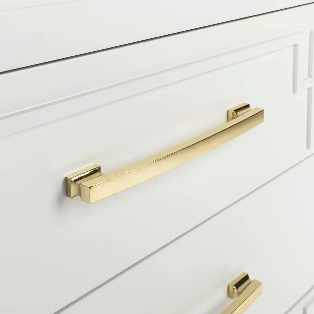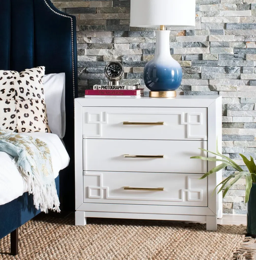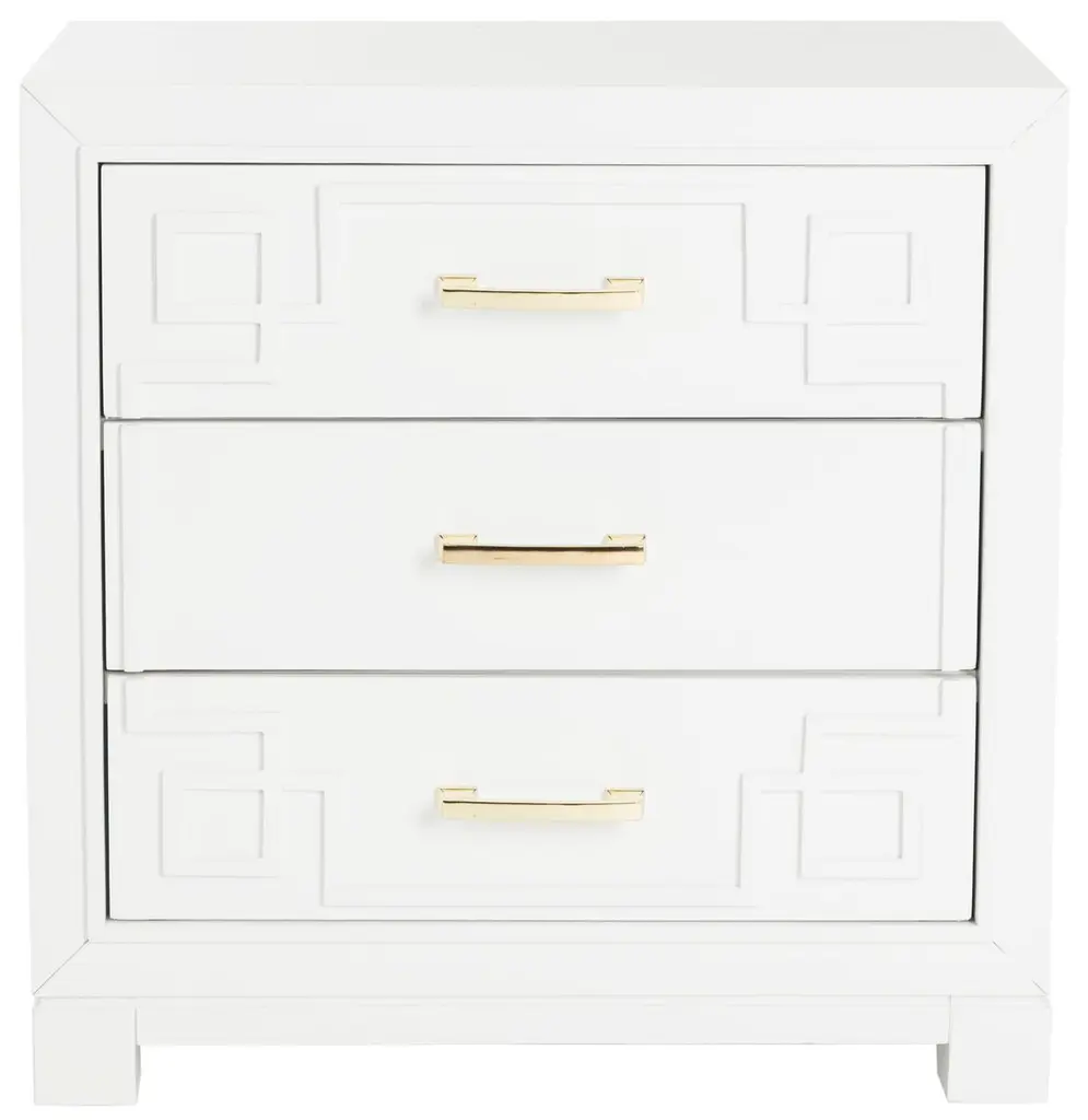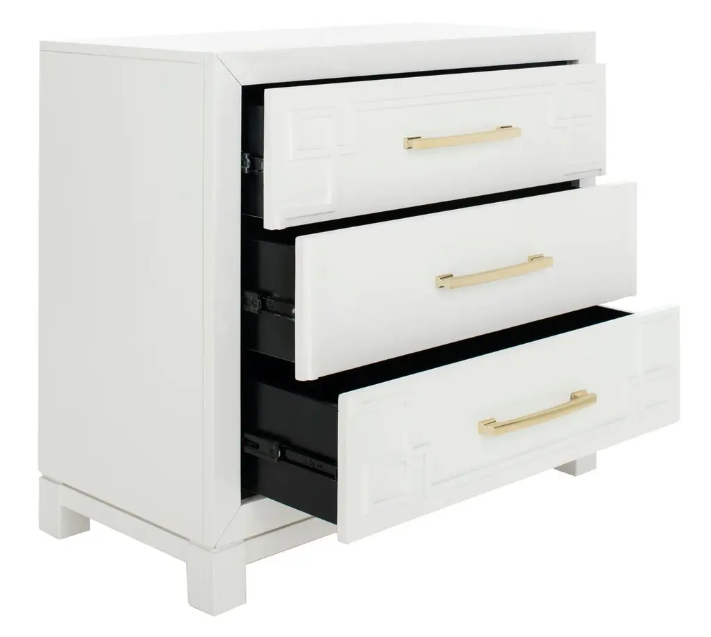 This clean and contemporary dresser is crafted of pine with Deco-inspired molding and linear brass hardware. Three sliding drawers offer plenty of bedside storage. An anti-tip kit is included to secure this piece to the wall and prevent tipping.