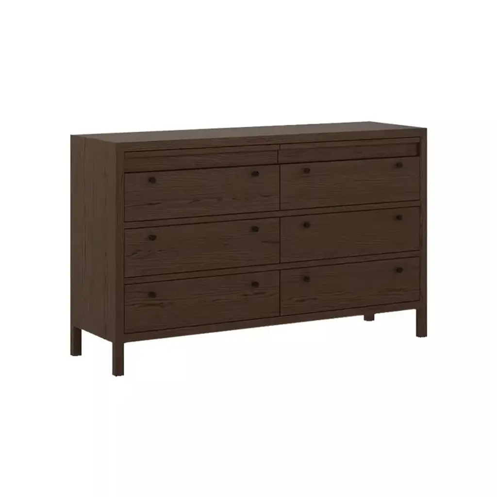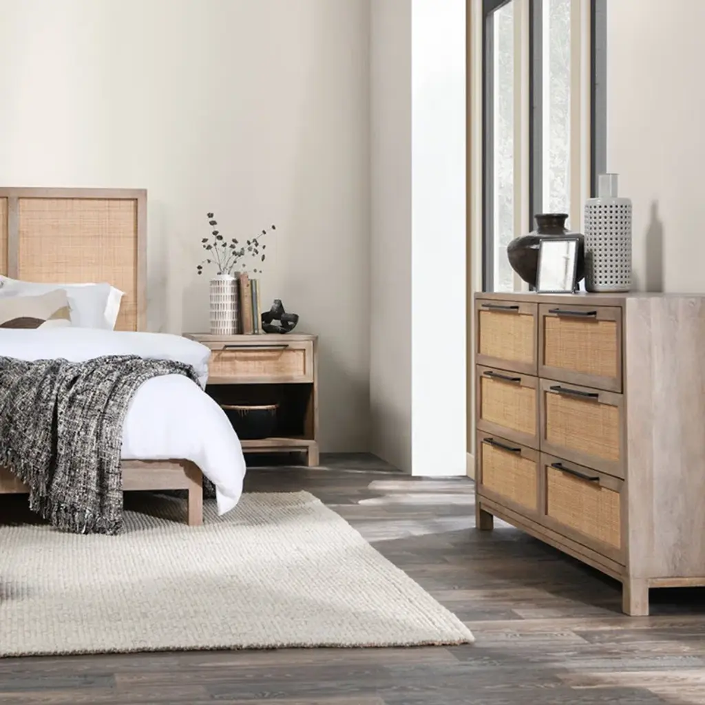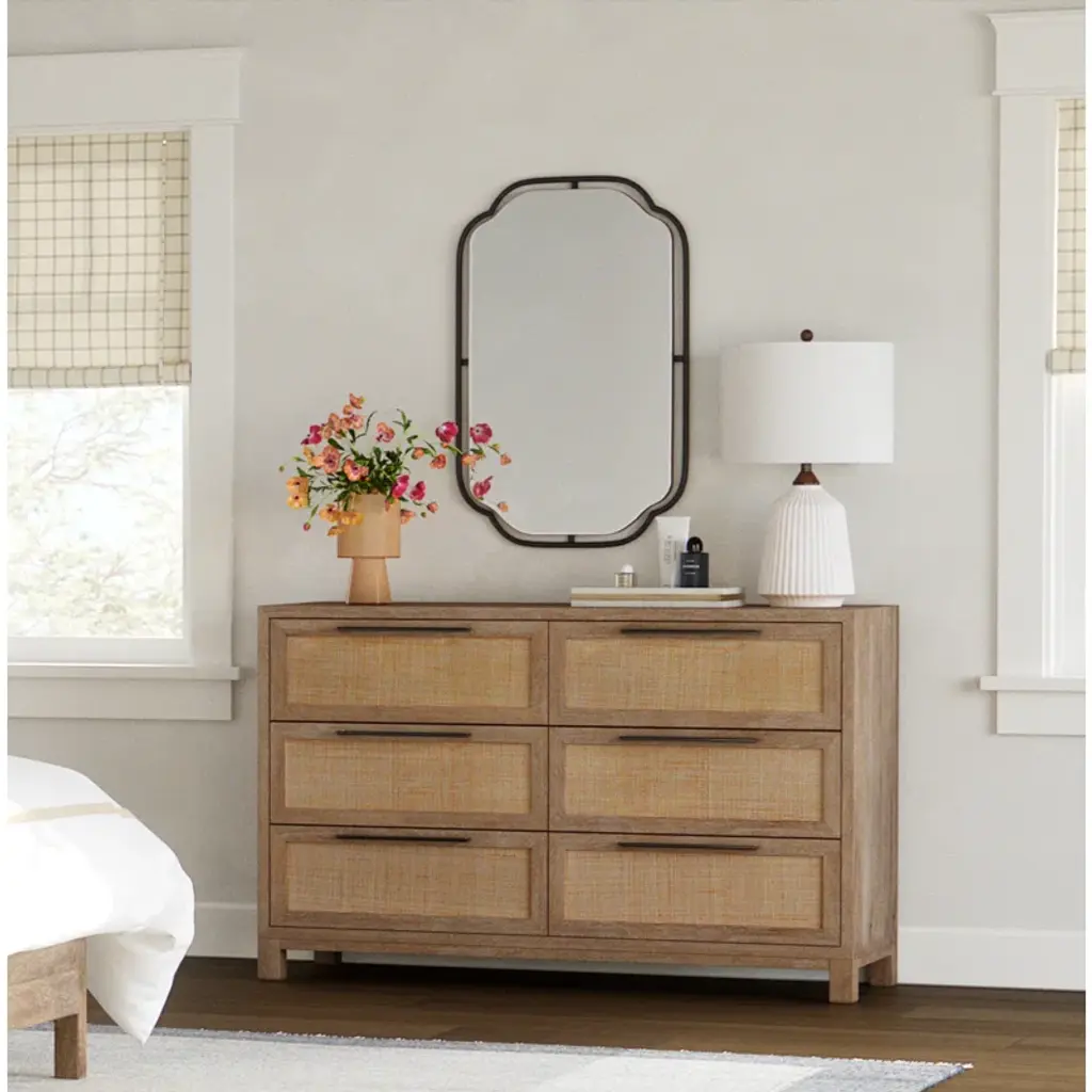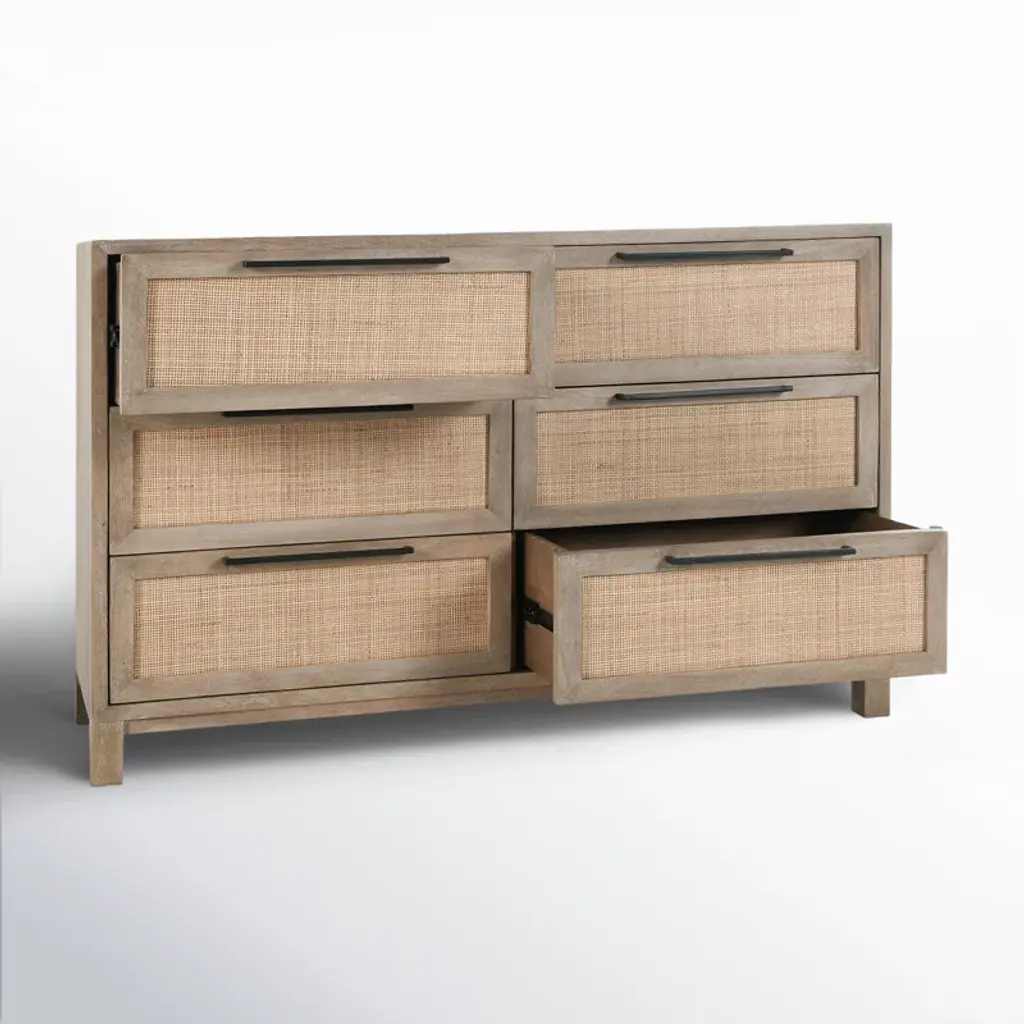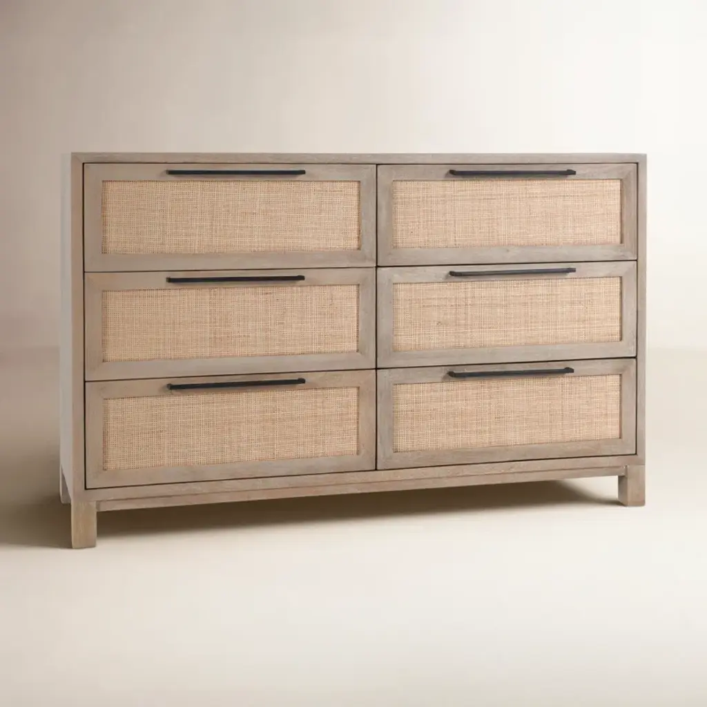 Caned drawer fronts make this 6-drawer dresser a standout, adding visual interest and plenty of texture to its straightforward silhouette. Crafted from solid mango wood, it has a soft taupe finish that accentuates the natural wood grain and knots. Black drawer pulls add a distinctive contrast. What’s more, levelers on the feet allow you to adjust for uneven floors.