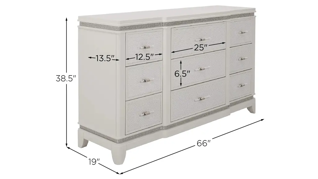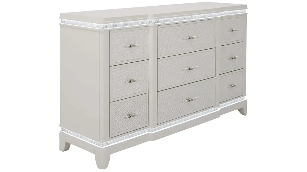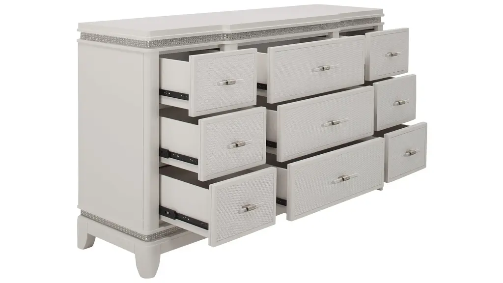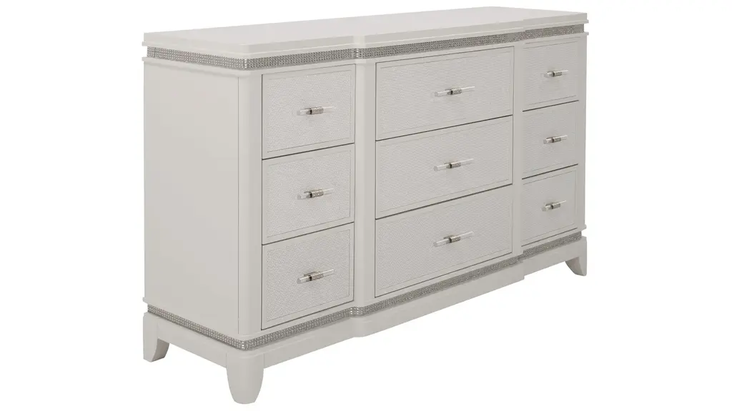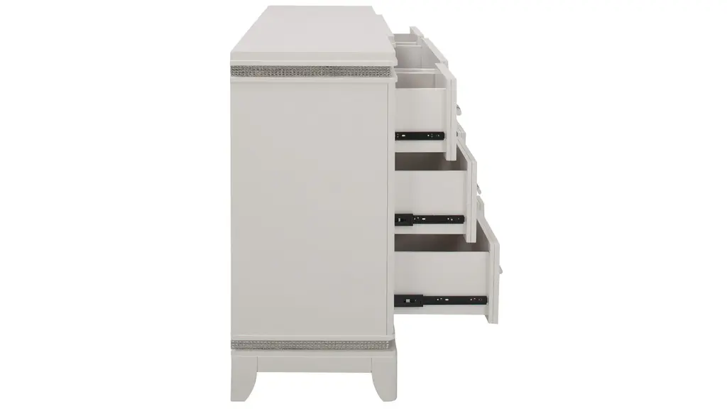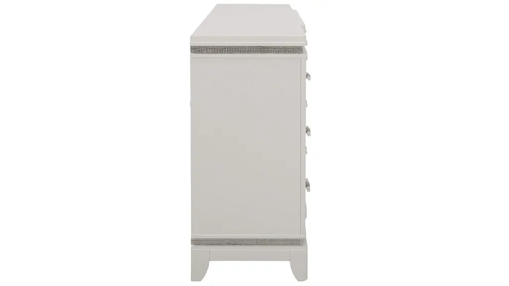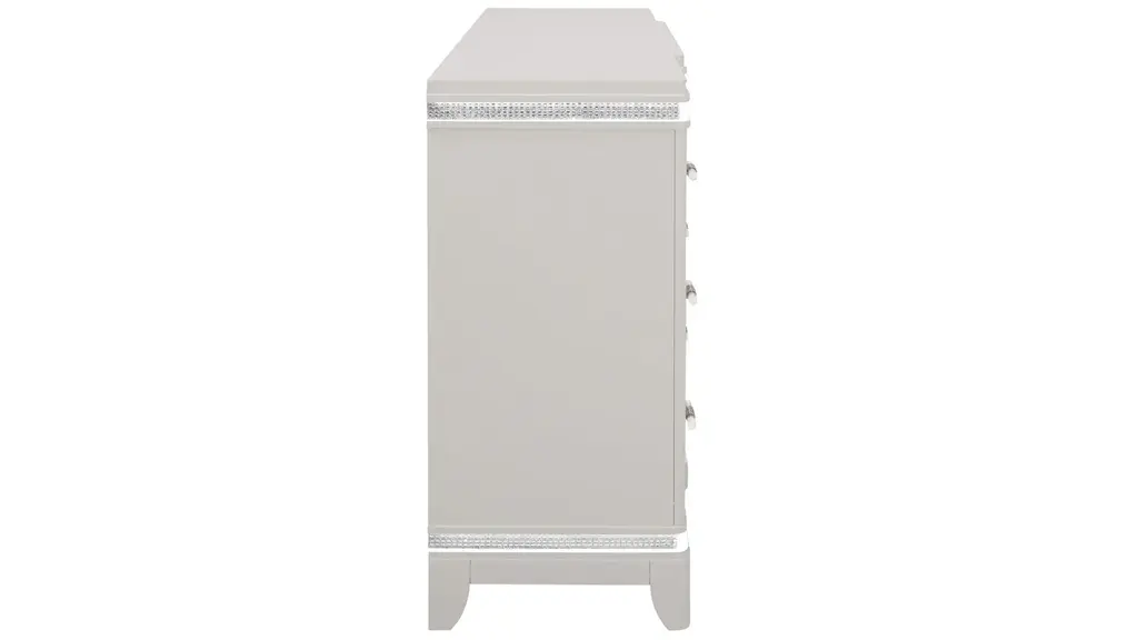 Transform your bedroom into a dazzling retreat with this modern glam collection. The Carmelita dresser plays a starring role in this stunning group, brilliant chrome and clear acrylic drawer pulls plus tiny rhinestones embedded around the frame. And there's more: LED lighting creates a shimmery, ambient glow that sets a dreamy mood with just a tap.