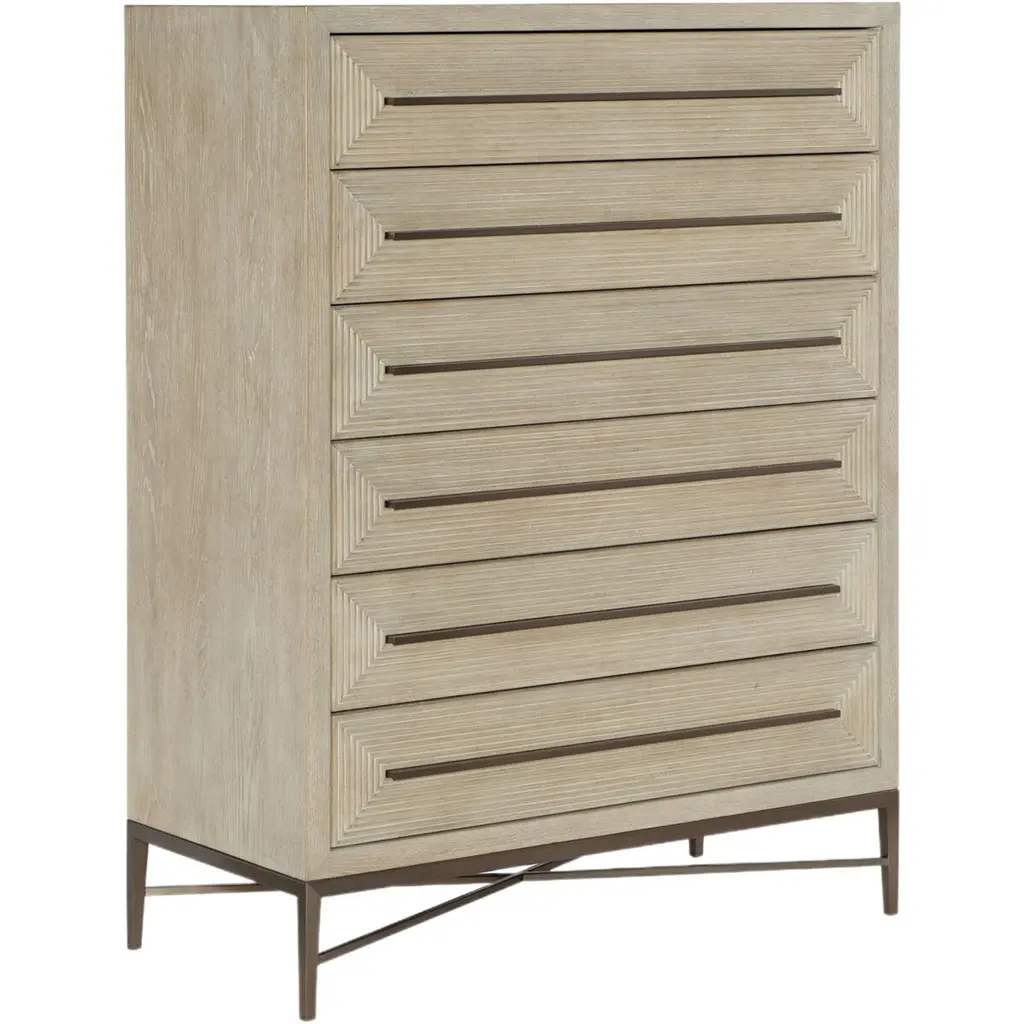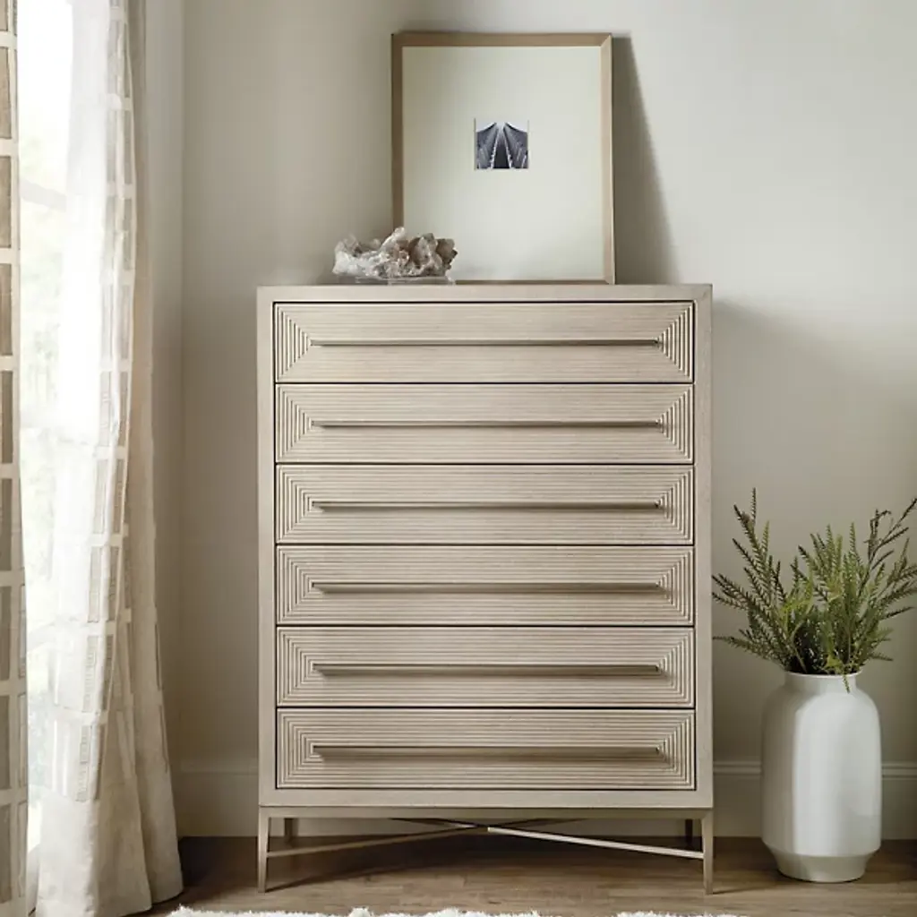 The Cascade Chest from Hooker Furniture pairs soft lines with subtle texture for a design that feels timeless and quietly refined. A layered design front and tactile reeded drawer faces bring a calming, sculptural note. In contrast, six self-closing drawers offer everyday storage with thoughtful touches—like a cedar-lined bottom drawer and a removable gray liner in the top. Finished in Terrain, a dry-brushed tone over oak veneers, the chest rests on slender metal legs with a champagne finish and X-stretcher detail, adding pleasant light colors to promote modern calm.