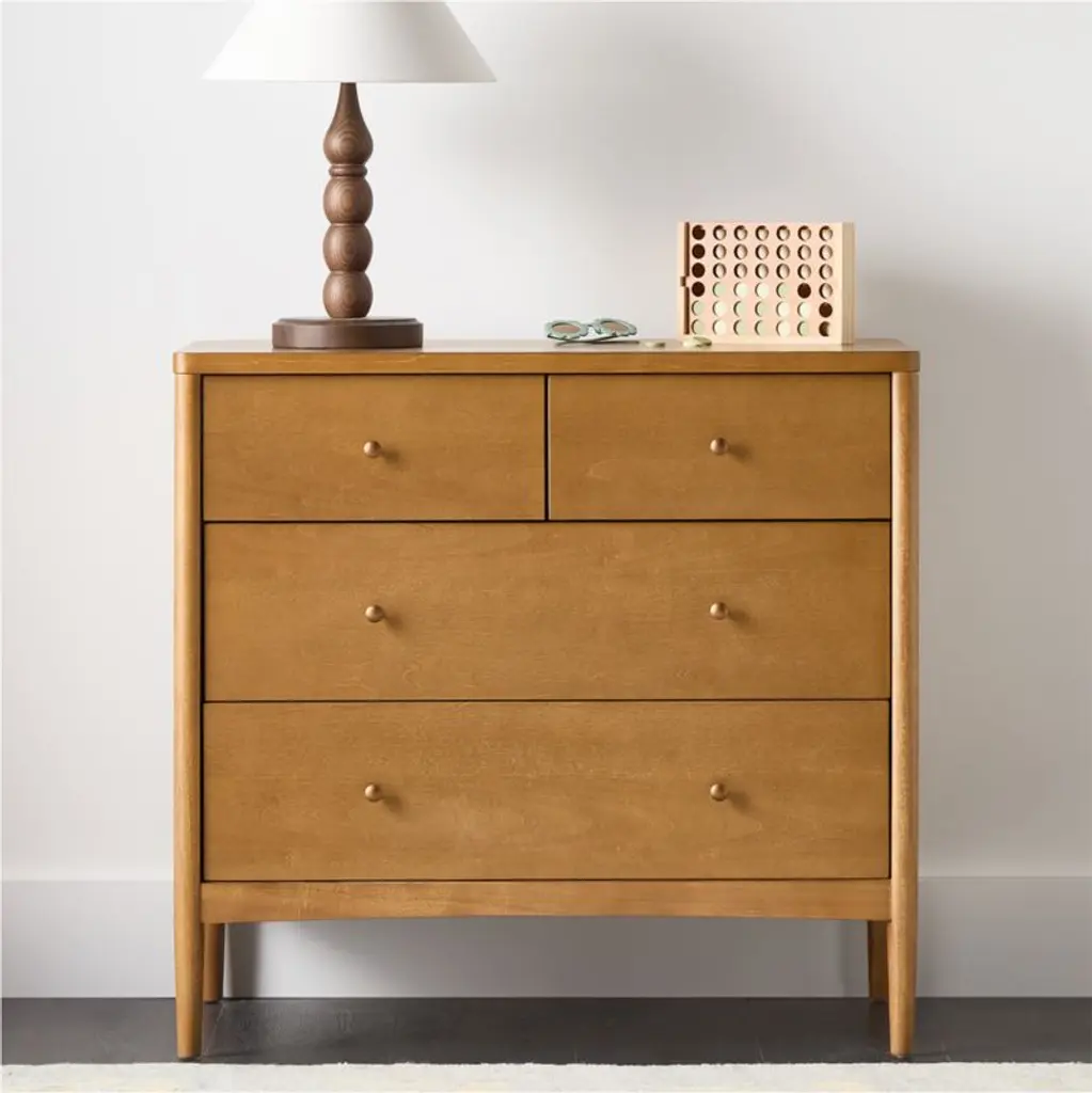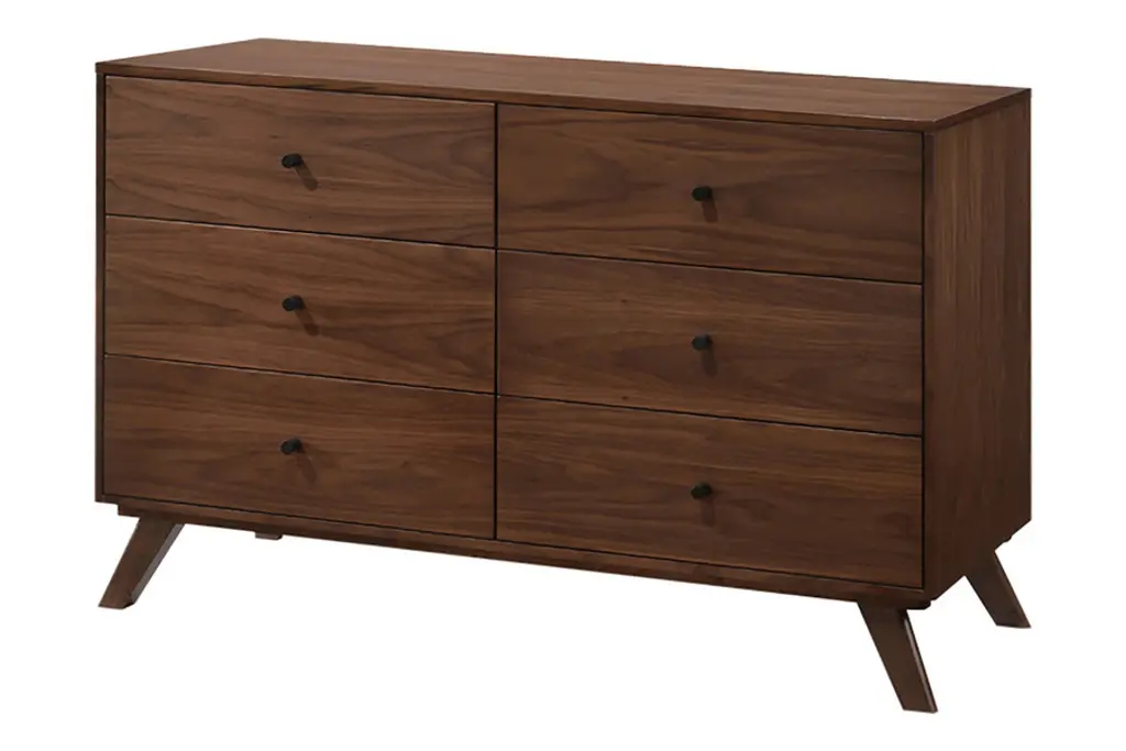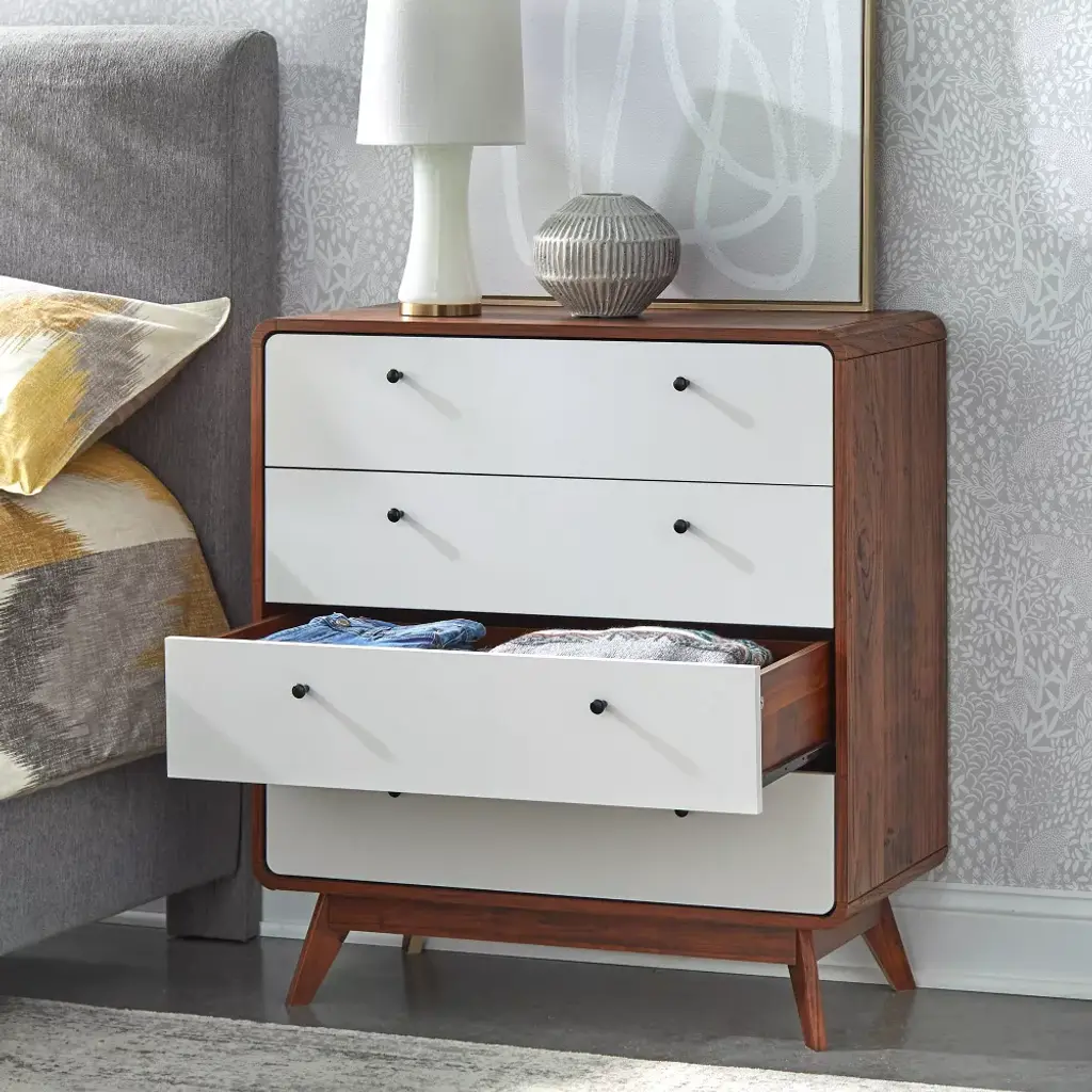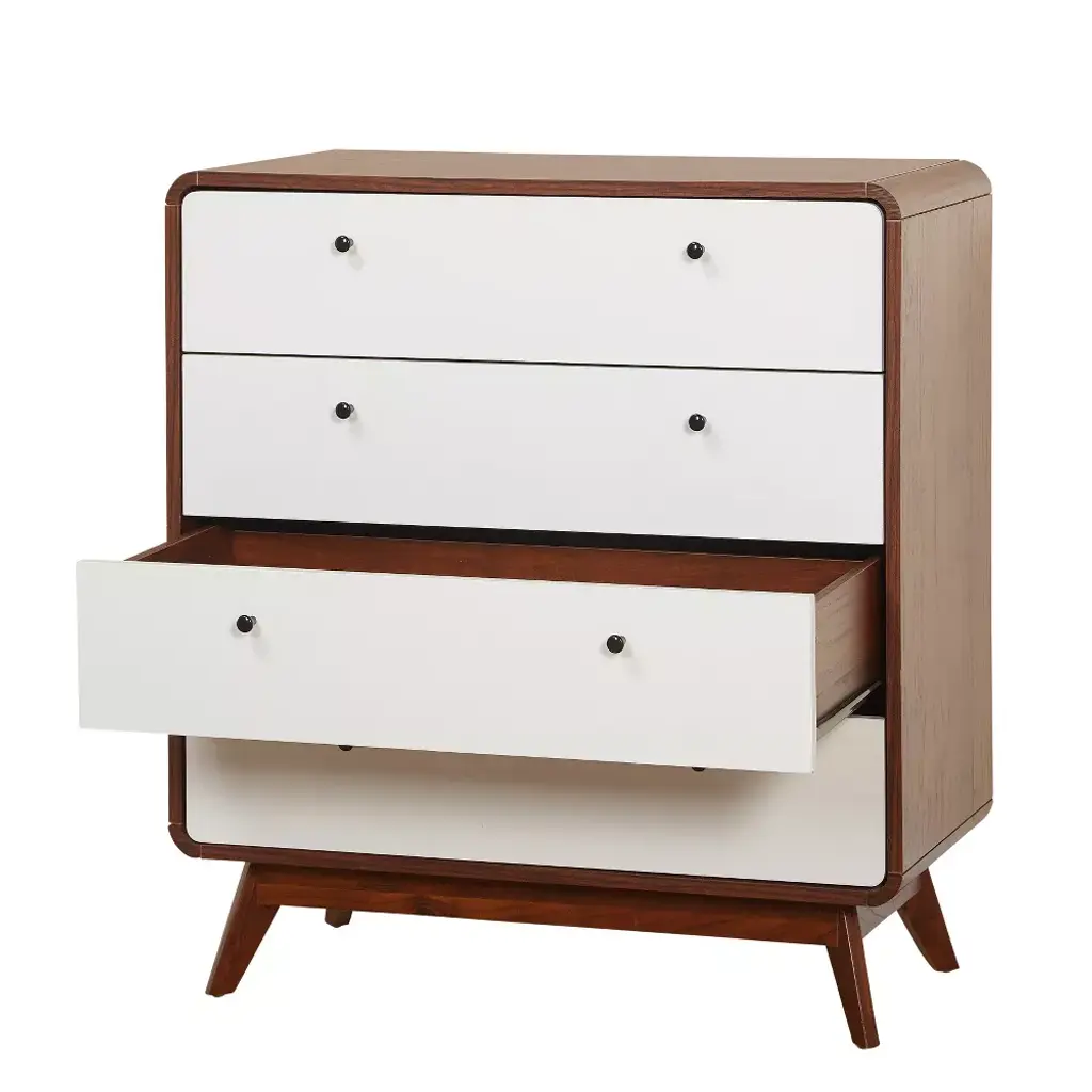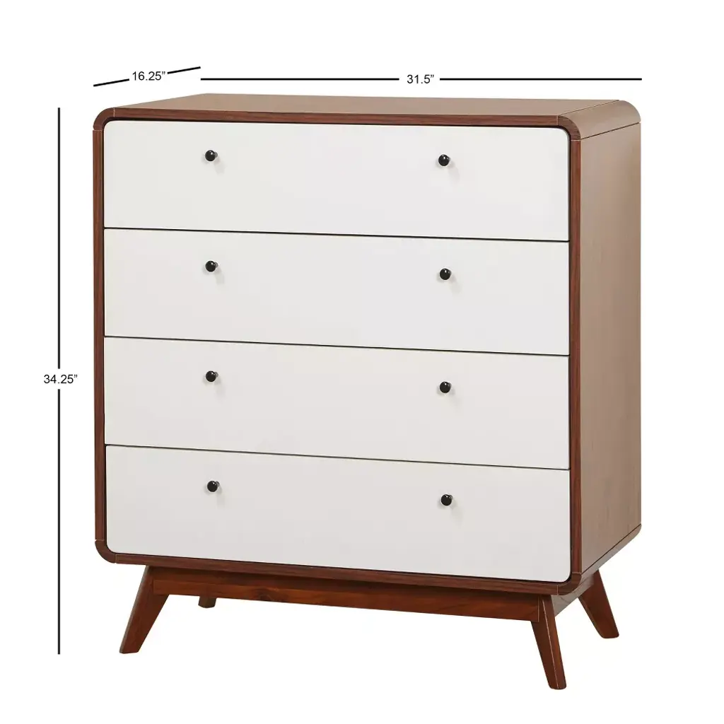 Lighten and brighten your bedroom with the Cassie Four Drawer Chest. Styled with a contemporary two-tone, Walnut with White finish. The rounded corners and angled legs are reminiscent of Mid-century design. Sleek and functional, the four spacious drawers provide all the room needed to organize your jeans, tees and more.Overall Width: 31.5 inchesOverall Height: 34.25 inchesOverall Depth: 16.25 inchesDrawer Width: 28.25 inchesDrawer Height: 4.5 inchesDrawer Depth: 12.75 inchesFloor to Bottom of Base Height: 5.9 inches