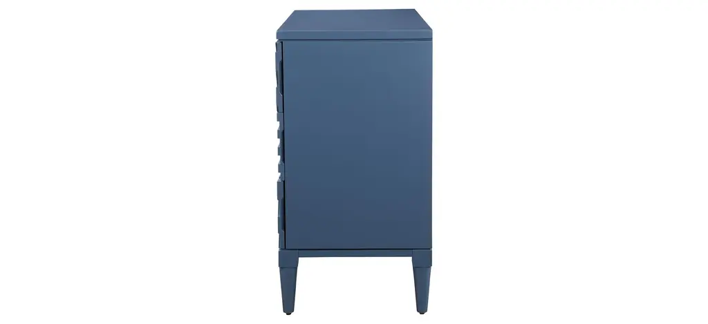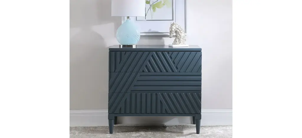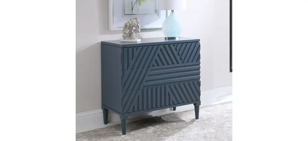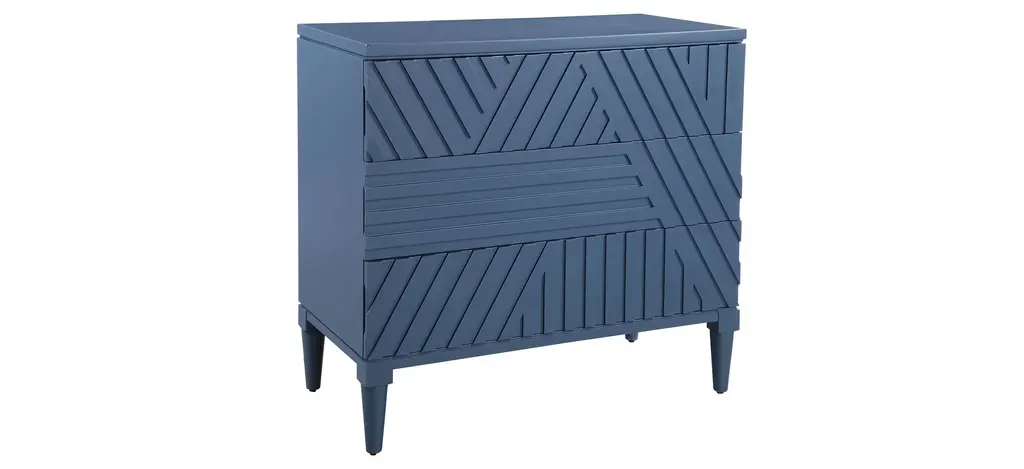Refreshingly modern, this geometric accent Caswell Drawer Chest features carved drawer fronts, creating a monochromatic statement in a deep sea blue finish.
