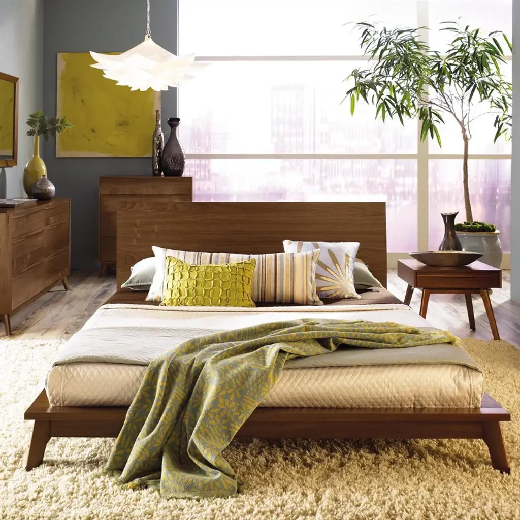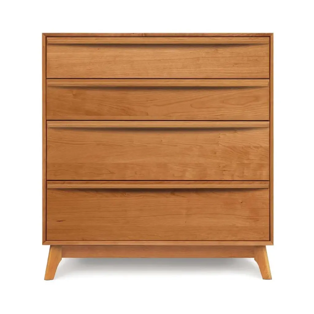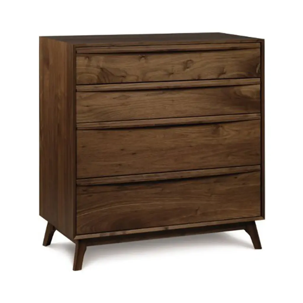 Combining the clean, unadorned lines of the International Modernists with organic and geometric forms. The years following WWII were a time of uncertainty but also of great hope and progress. Designs of the period reflected that sense of hope and the promise of an ideal future. In our current period, one finds comfort and nostalgia in Catalina's retro-modern shapes and sensibilities. The Catalina Bedroom is crafted in solid cherry hardwood or solid walnut hardwood.All pieces are either finished with pre-catalyzed lacquer which is the conventional top coat for Copeland Furniture or water borne finish that resists stains, moisture rings and spots, heat damage (from hot beverages, etc.), and abrasions. Features