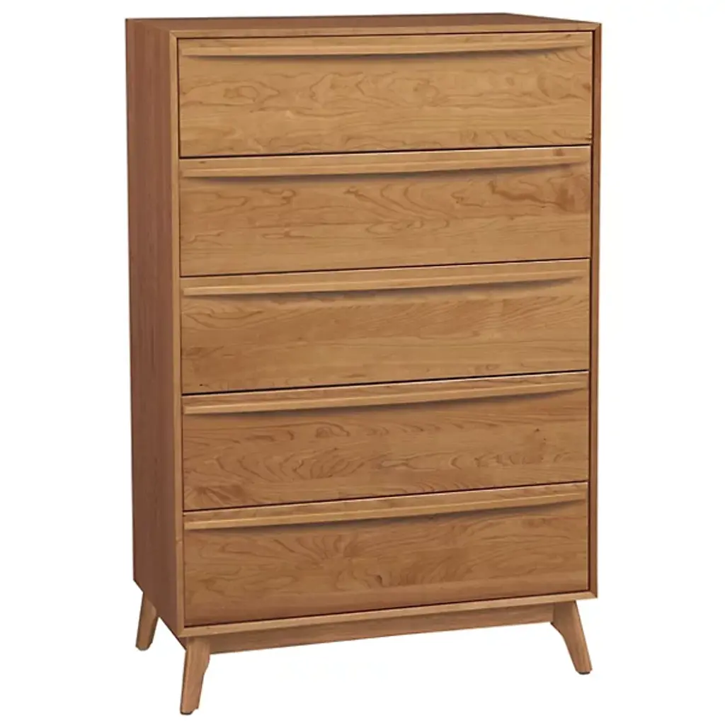 Gorgeous design with great effect. Standing tall and providing abundant storage space, the Copeland Furniture Catalina 5 Drawer Dresser - Wide helps you make the most out of your bedroom space. Five spacious drawers make room for an extensive wardrobe, with a wide body that allows for plenty of in-drawer organization. Each of the compartments comes with full extension and self-closing glides, adding a protective element to keep the Solid Hardwood in prime condition. The Wood, selected and prepared by hand in Vermont, delivers a strong, natural aesthetic to every inch of the dresser’s sizable frame. Built to work well and look good for years to come, this unit has everything needed to transform your bedroom.