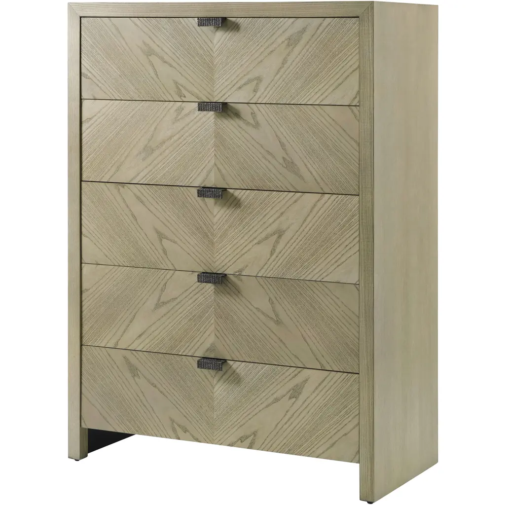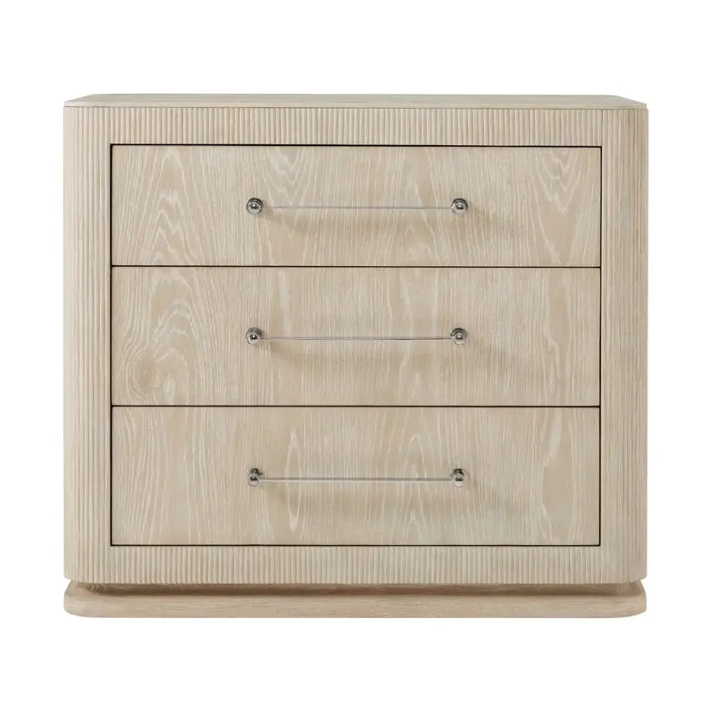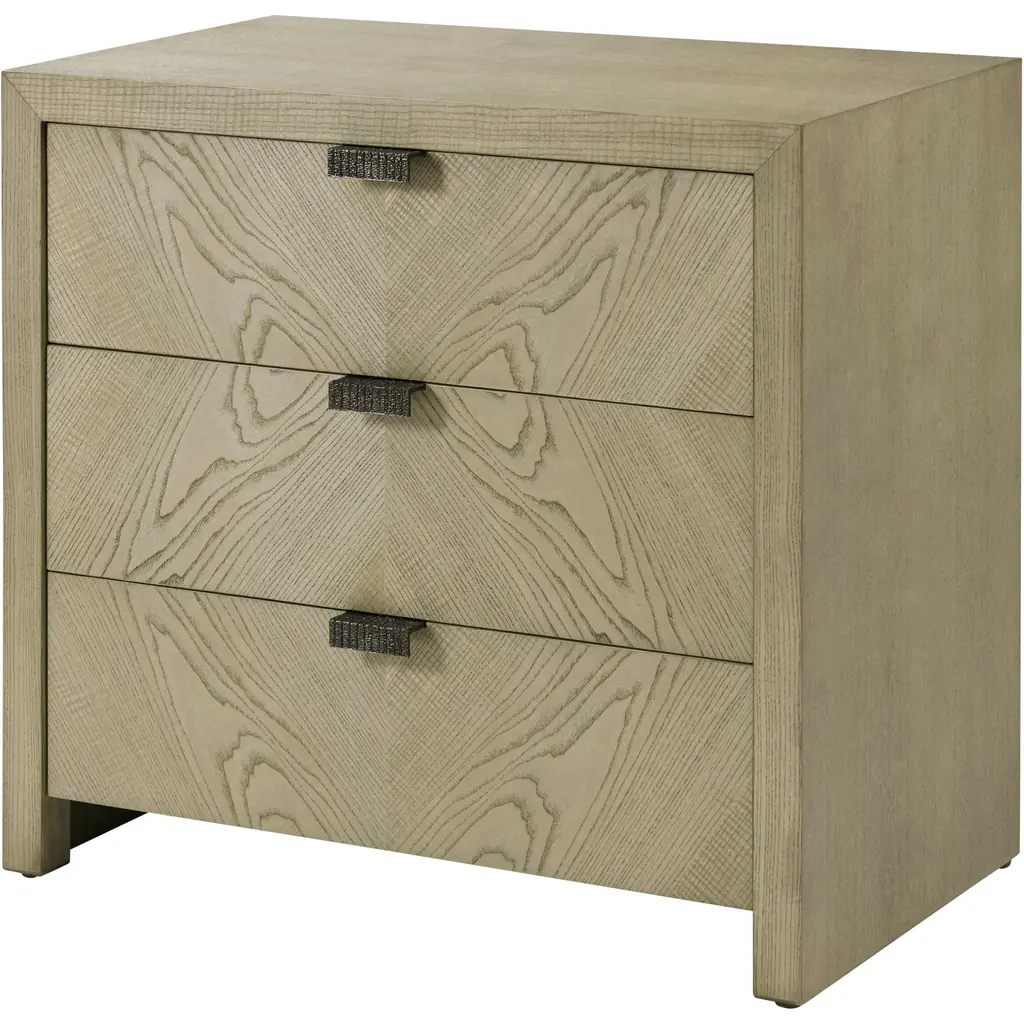Essential three drawer chest made of figured cathedral ash in an artful grain pattern with soft close drawers. Available in Dune or Earth with metal pulls in Ember finish and top is done in our exclusive porous Mineral finish.