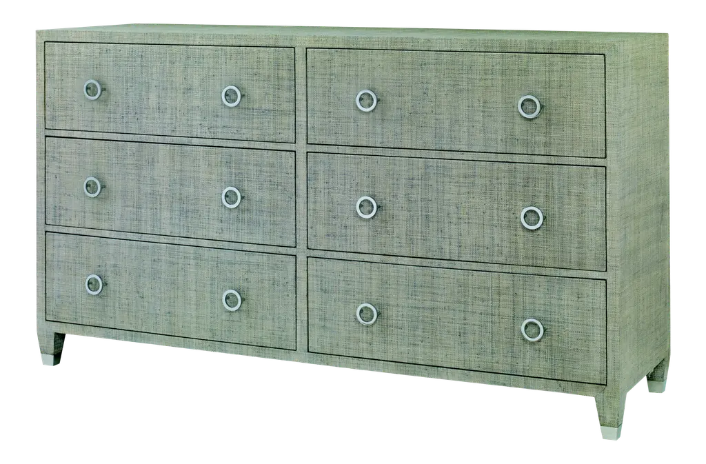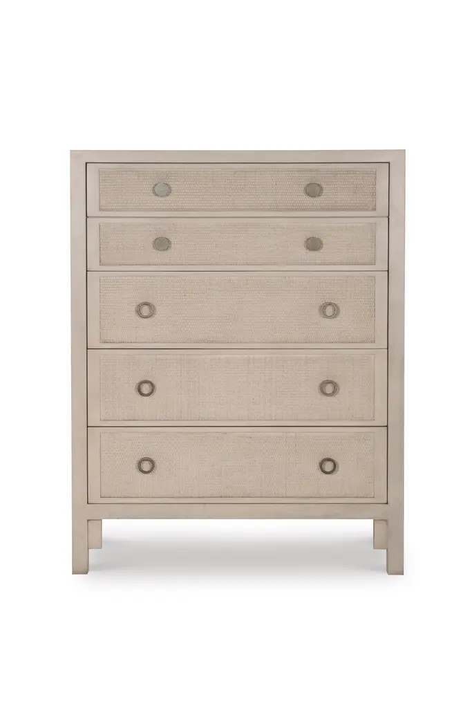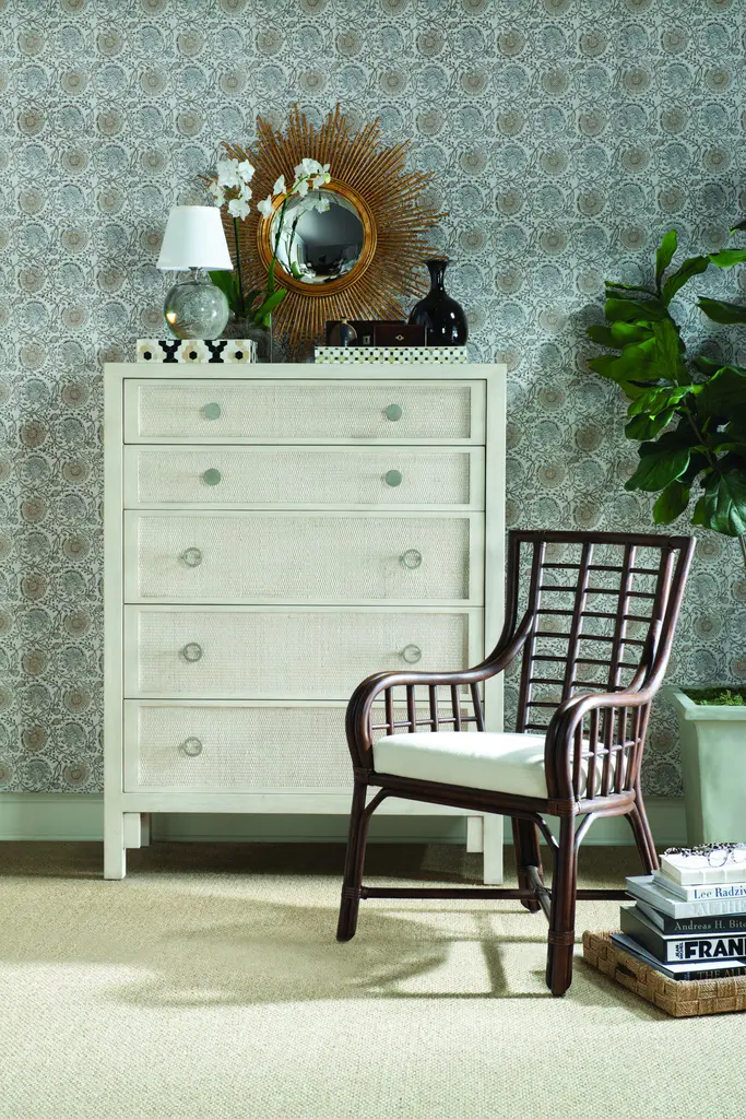This piece is available only as shown, and will ship in 2-3 weeks. This chest from the Century Furniture Leeward Collection is crafted of Mahogany solids and veneers with natural woven cane. Five soft-close drawers feature pewter finish hardware.