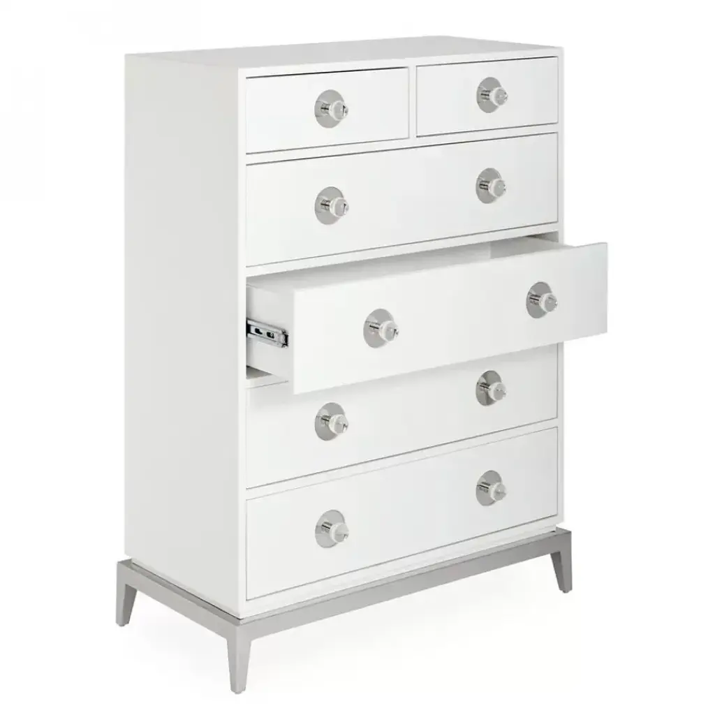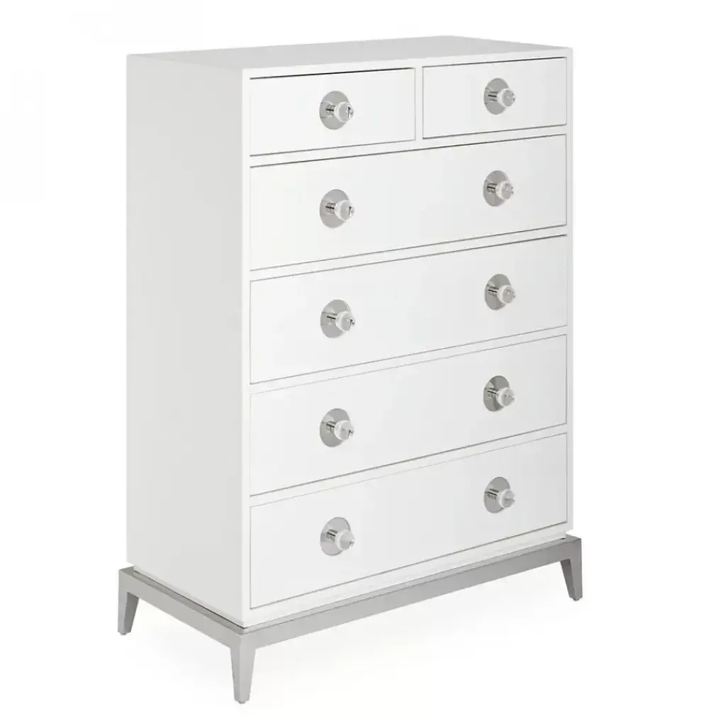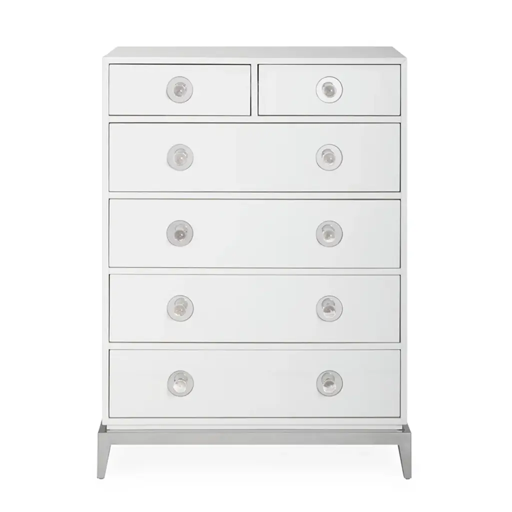 Neo-Classical lines, a dash of Hollywood glamour, and a top note of Mod moxie: that's our Channing Collection. Stash your stuff like a starlet in four generous drawers topped with two for your extras. Finished in glossy lacquer and featuring polished nickel accents with oversized acrylic knobs.
