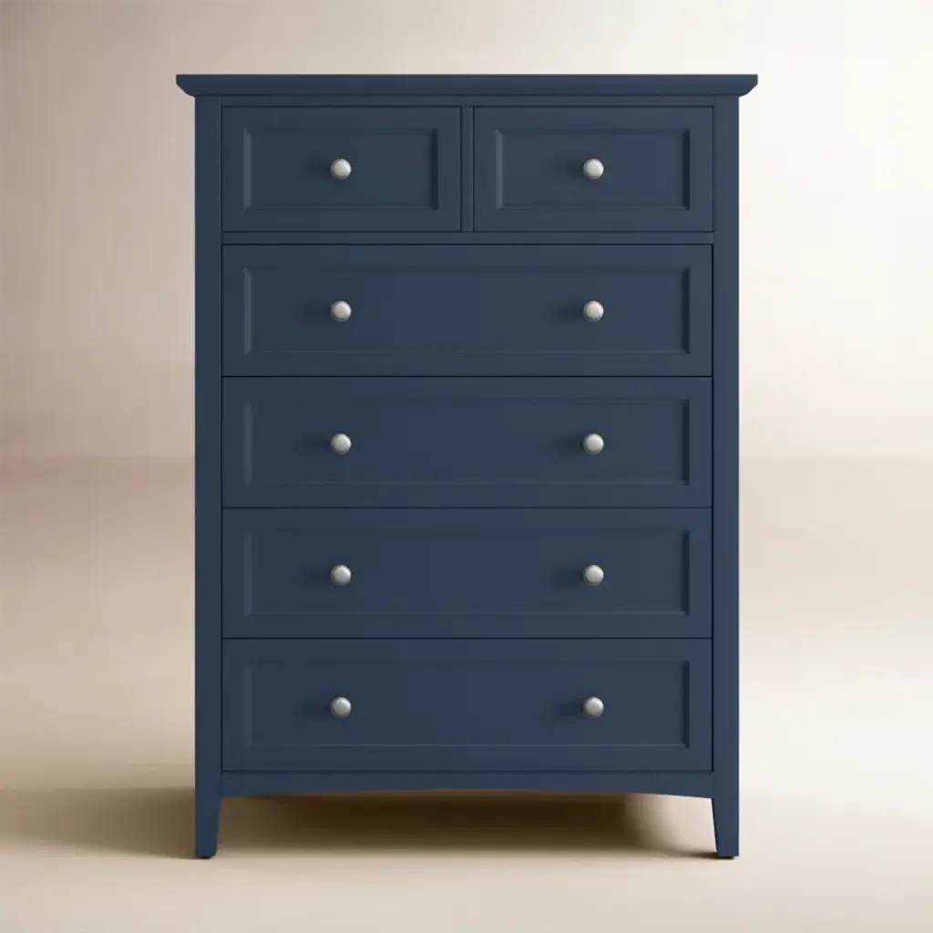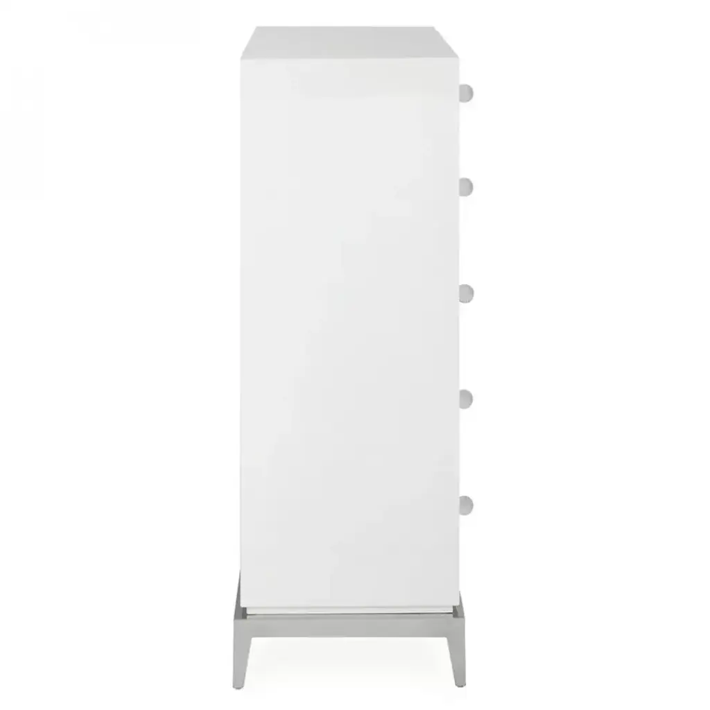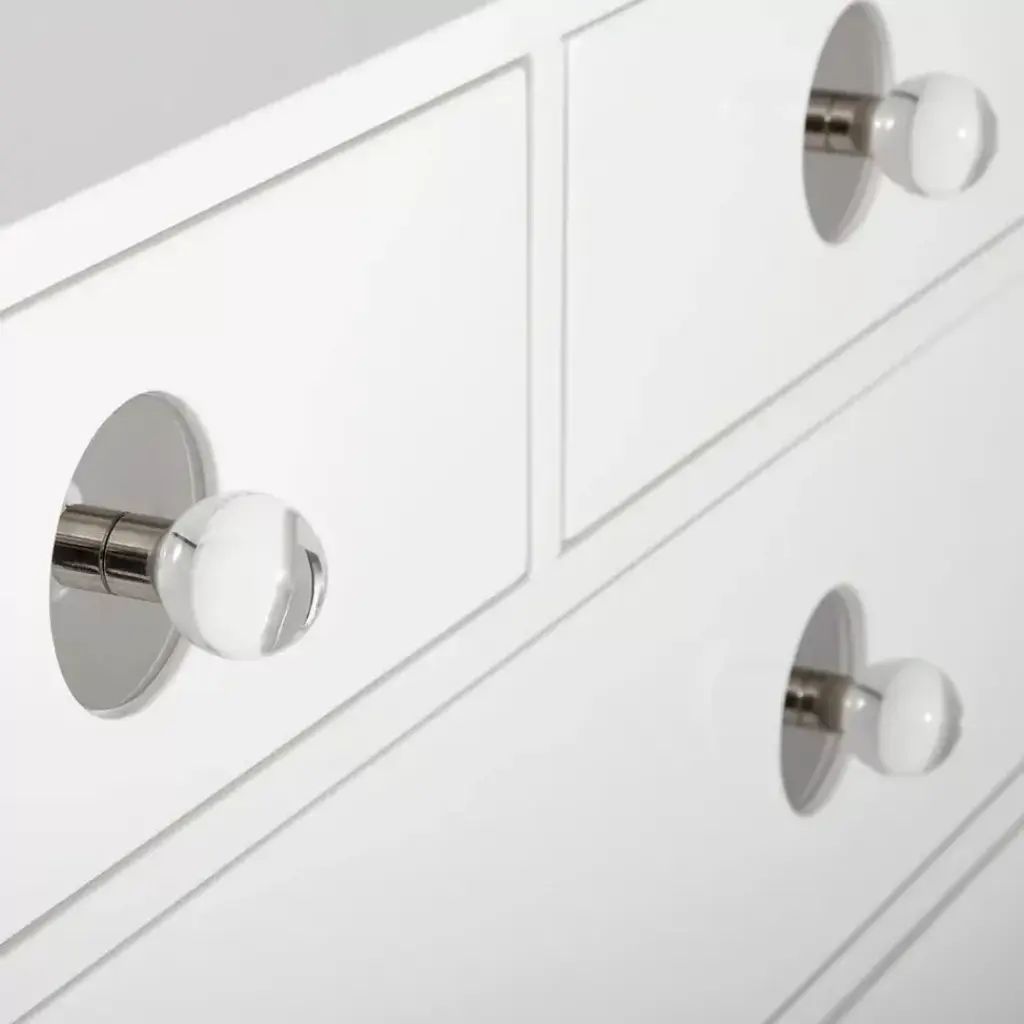 Neo-Classical lines, a dash of Hollywood glamour, and a top note of Mod moxie: that's our Channing Collection. Stash your stuff like a starlet in four generous drawers topped with two for your extras. Finished in glossy lacquer and featuring polished nickel accents with oversized acrylic knobs.