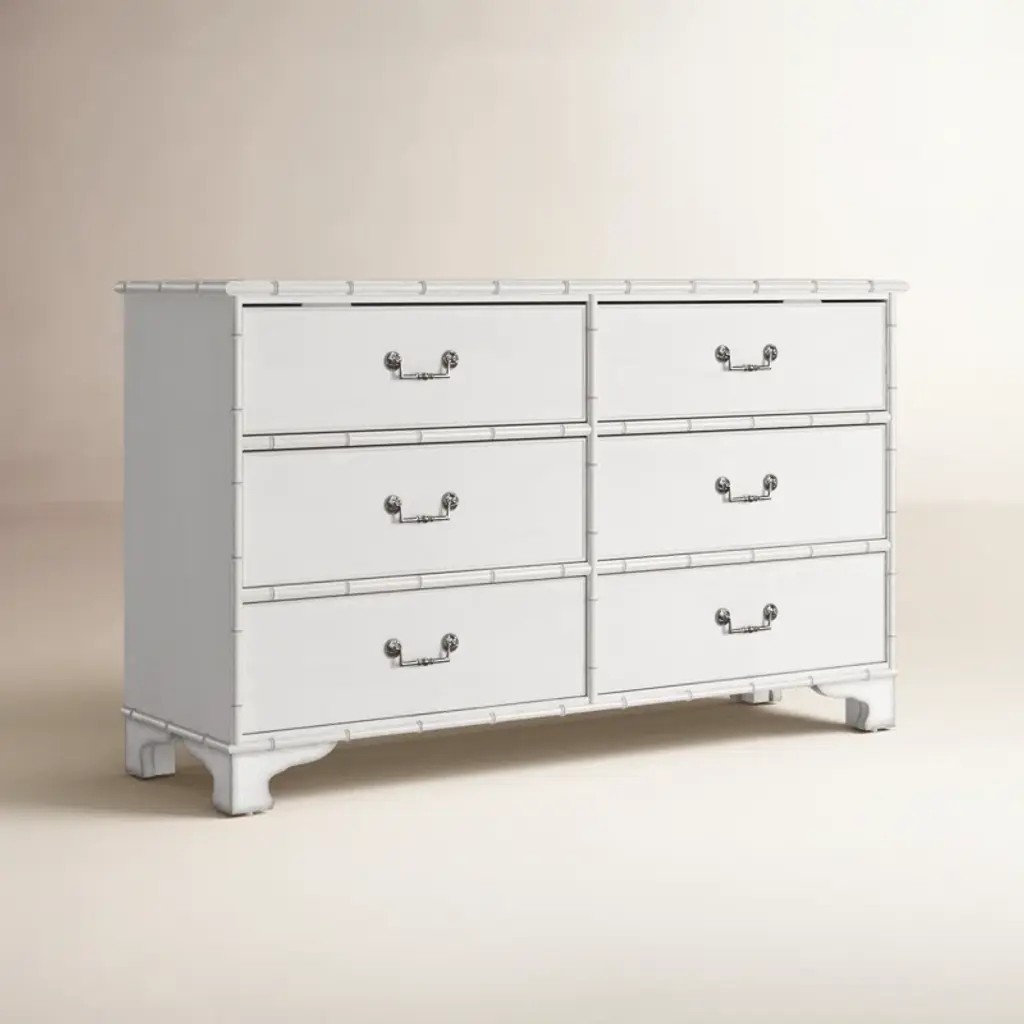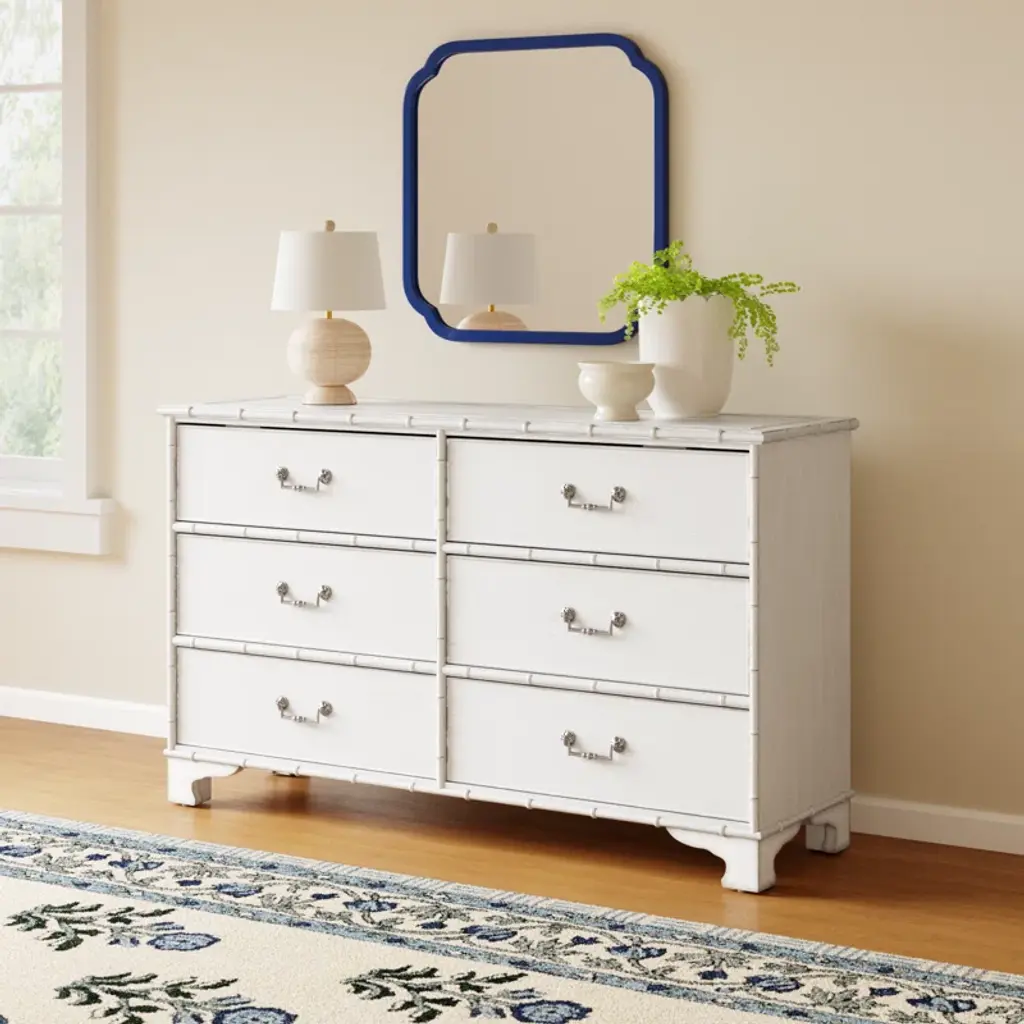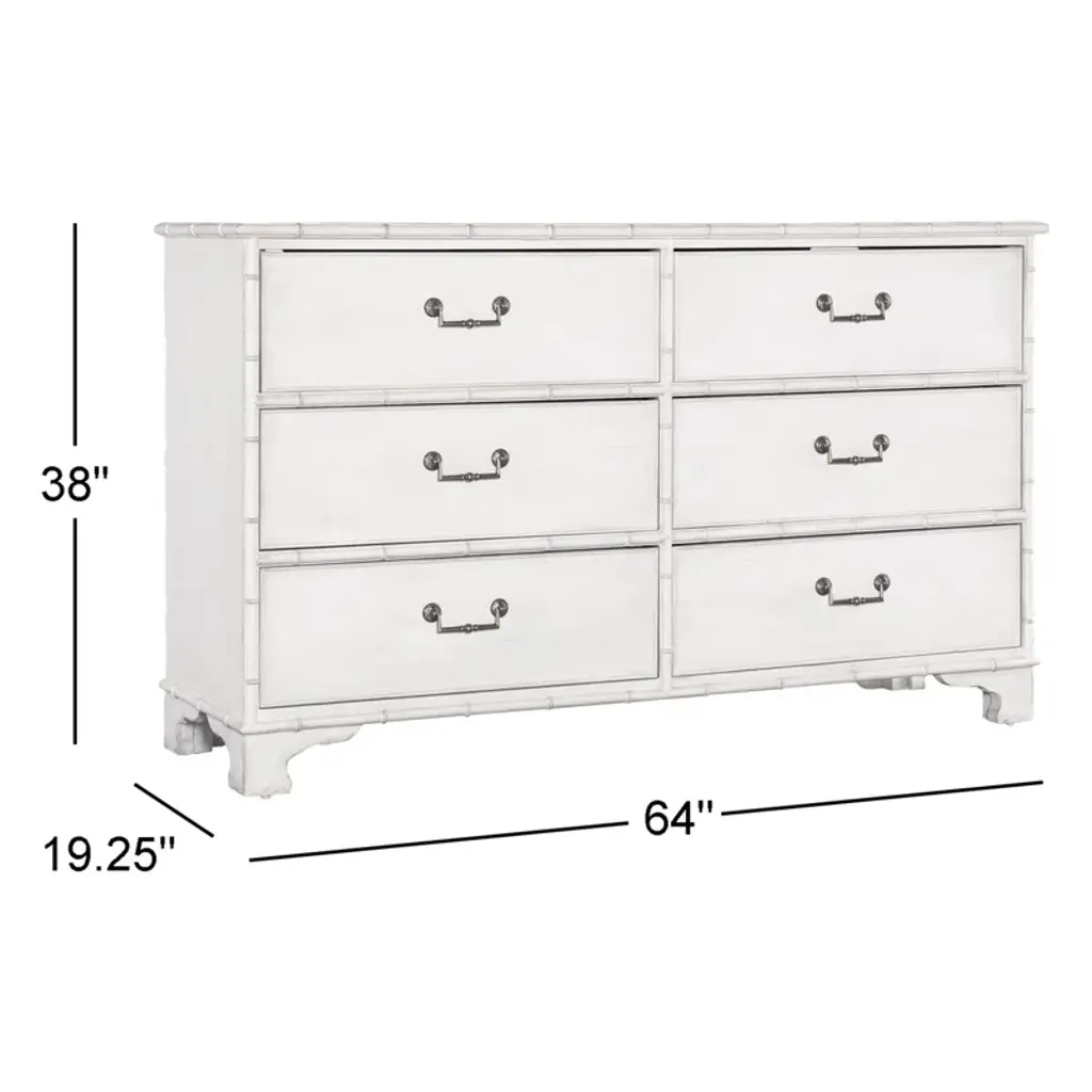 Upgrade your bedroom storage with this six-drawer dresser that's both functional and fashionable. With a horizontal orientation and a blend of engineered wood and solid rubberwood, it's a versatile addition to your space. The antique pewter drawer pulls add a touch of elegance, while the full-extension glides ensure easy access to your belongings. Safety stops and a tipover restraint device provide peace of mind for you and your family. Remember to keep it away from direct sunlight and simply wipe clean with a dry or damp cloth for easy care.