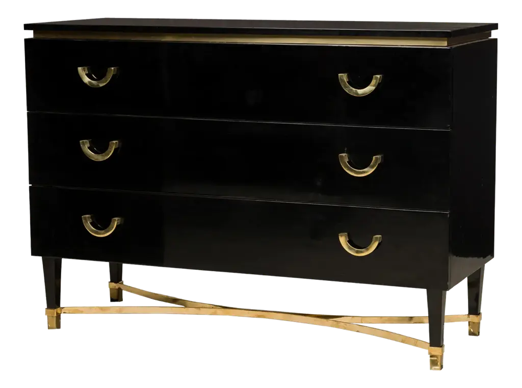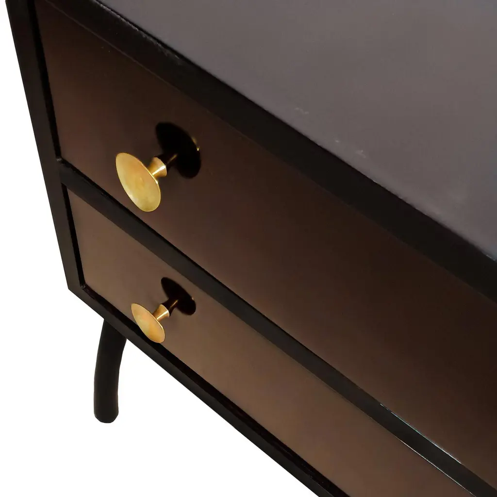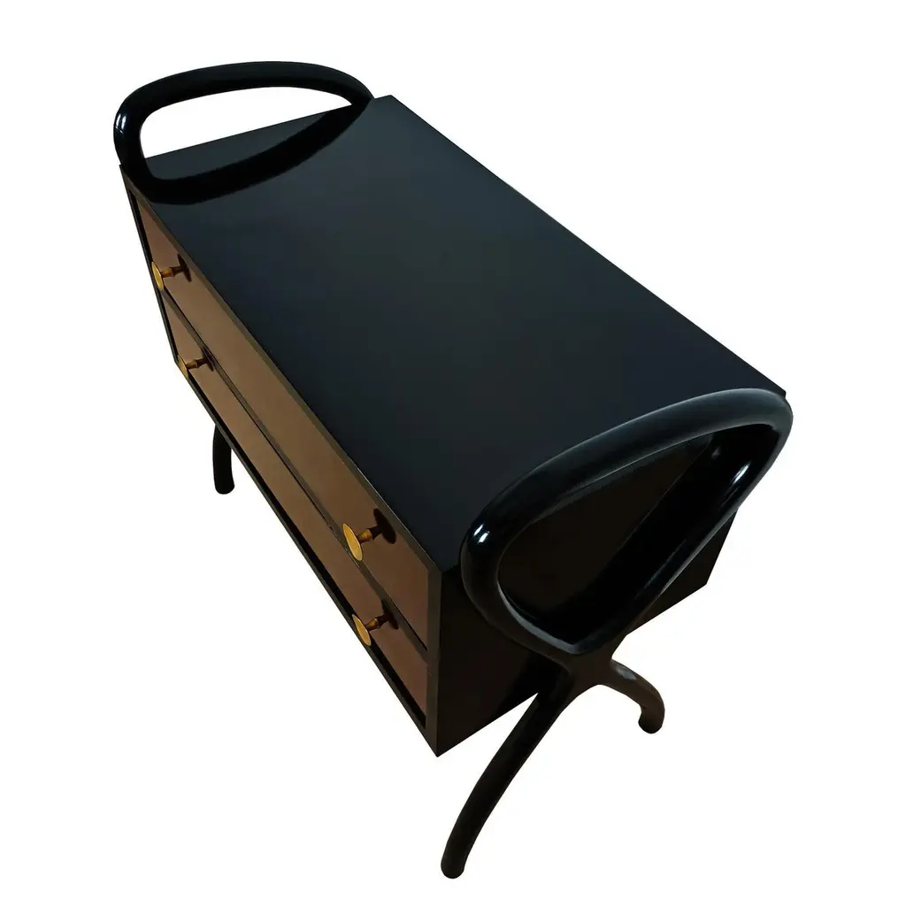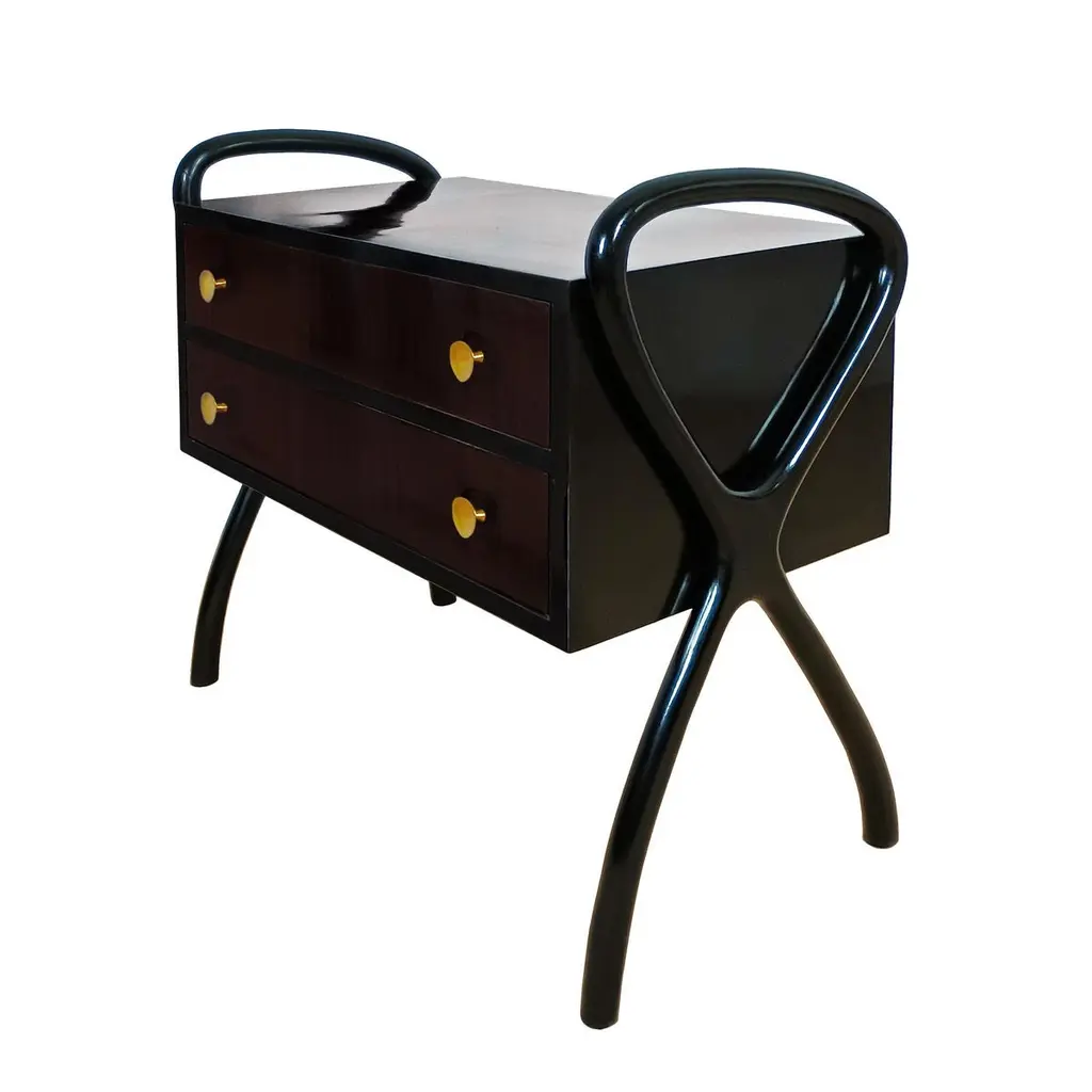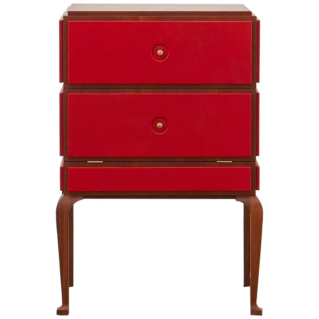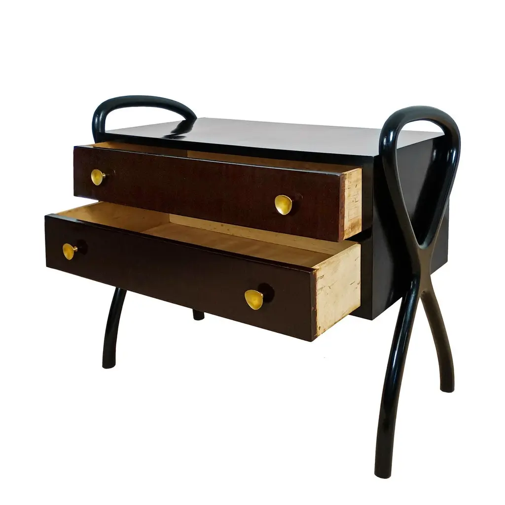 Charming little chest of drawers in dark-stained Sapelli veneer for the body and a little lighter for the drawers. French polish. Brass handles.Spain circa 1960Dimensions cm 81/87 (with stands) x 43/45 (with handles) x 70/80 (with stands)inches 31.89/34.25 (with stands) x 16.93/17.72 (with handles) x 27.56/31.50 (with stands)