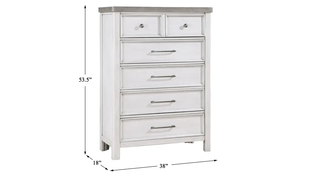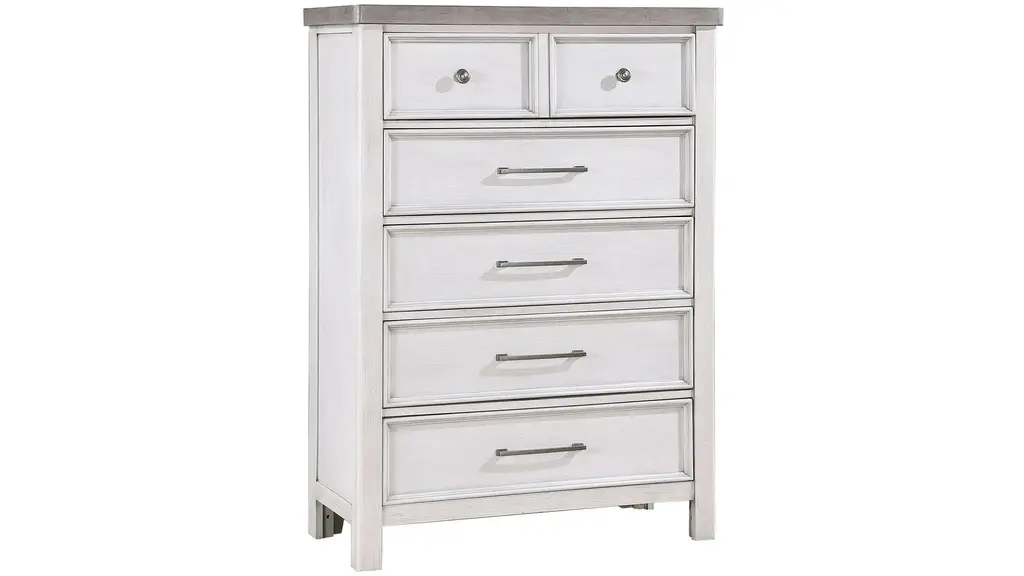 Hints of rustic styling permeate the transitional design of the Chesky Chest, each subtle accent building to create a classic look for your bedroom. Antique white and gray finishes highlight the acacia veneer, their hues providing perfect complement to each other. The bar and knob hardware that fronts the drawers of the chest are finished in antique pewter.