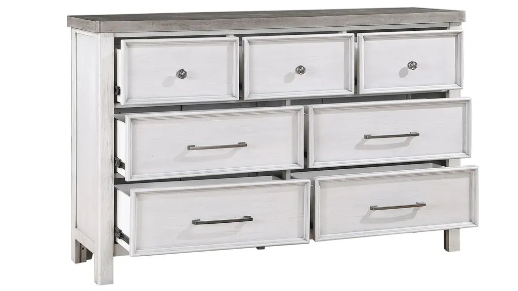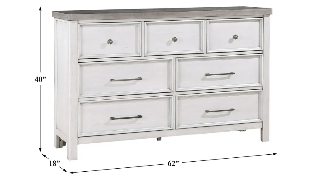 Hints of rustic styling permeate the transitional design of the Chesky Dresser, each subtle accent building to create a classic look for your bedroom. Antique white and gray finishes highlight the acacia veneer, their hues providing perfect complement to each other. The bar and knob hardware that fronts the drawers of the dresser are finished in antique pewter.