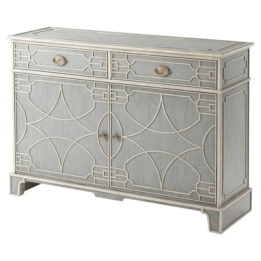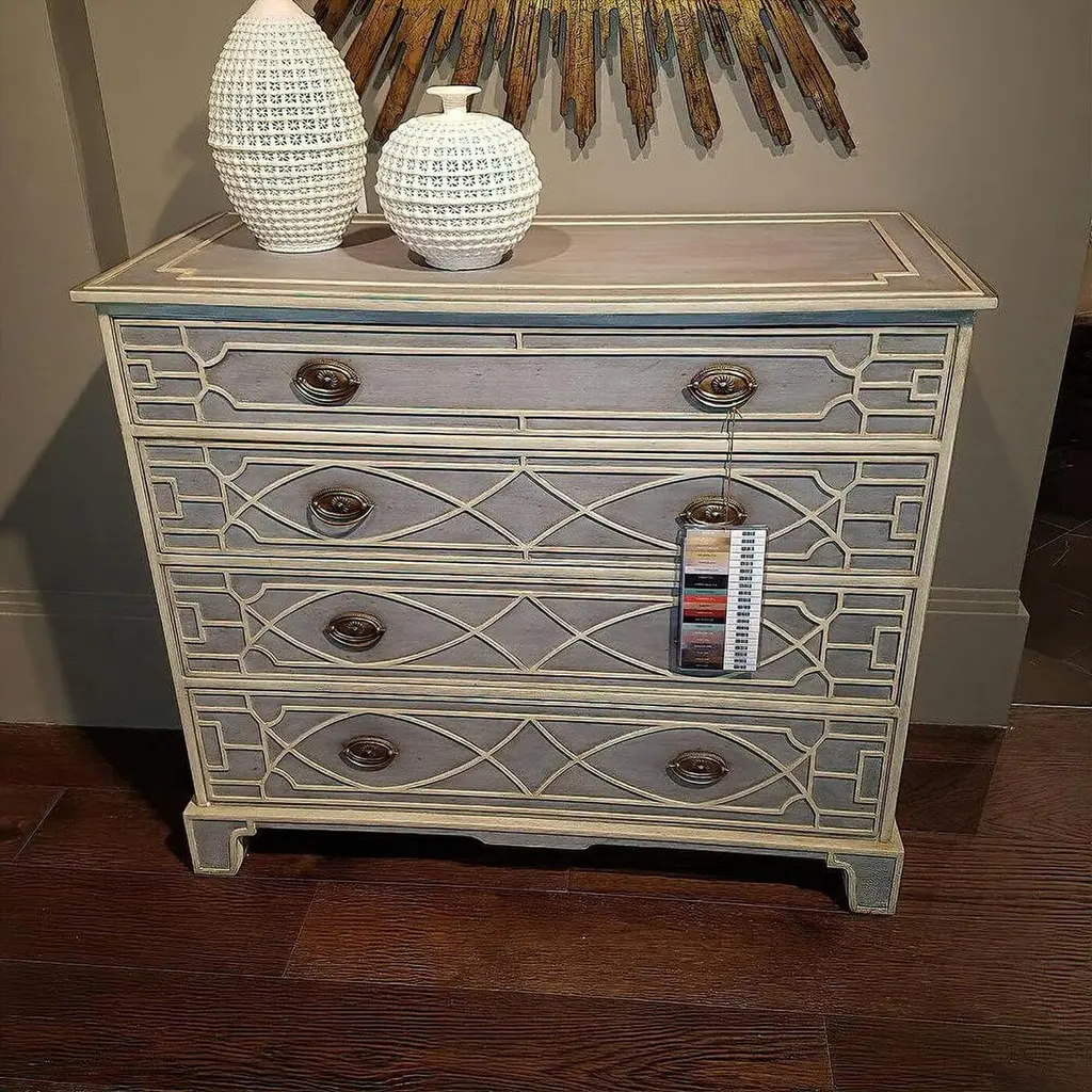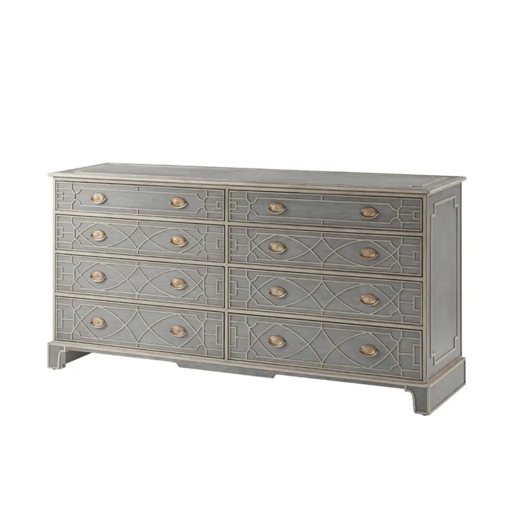 A Chinese Chippendale style painted chest of drawers, the rectangular paneled top, and sides above four blind fret paneled drawers, on similar bracket feet. Inspired by a George III original.Dimensions: 42" W x 20" D x 36" H