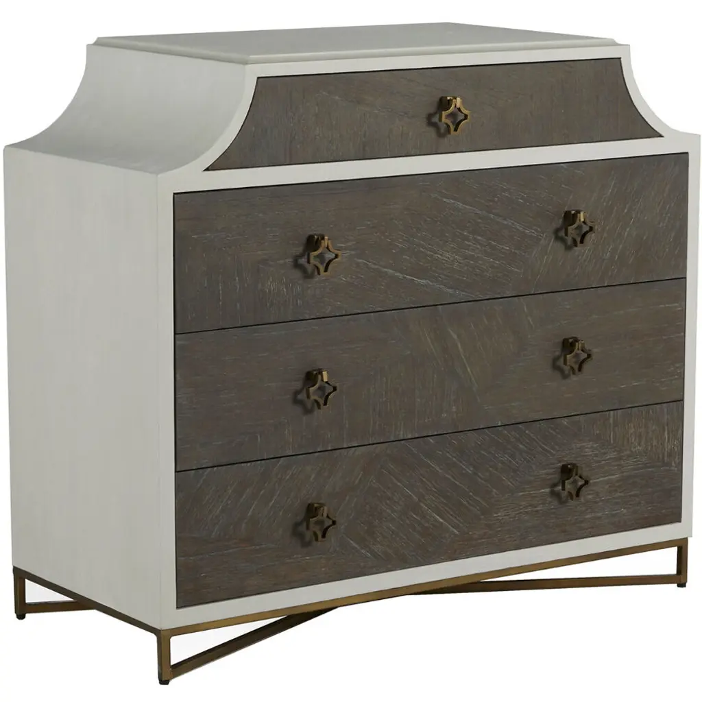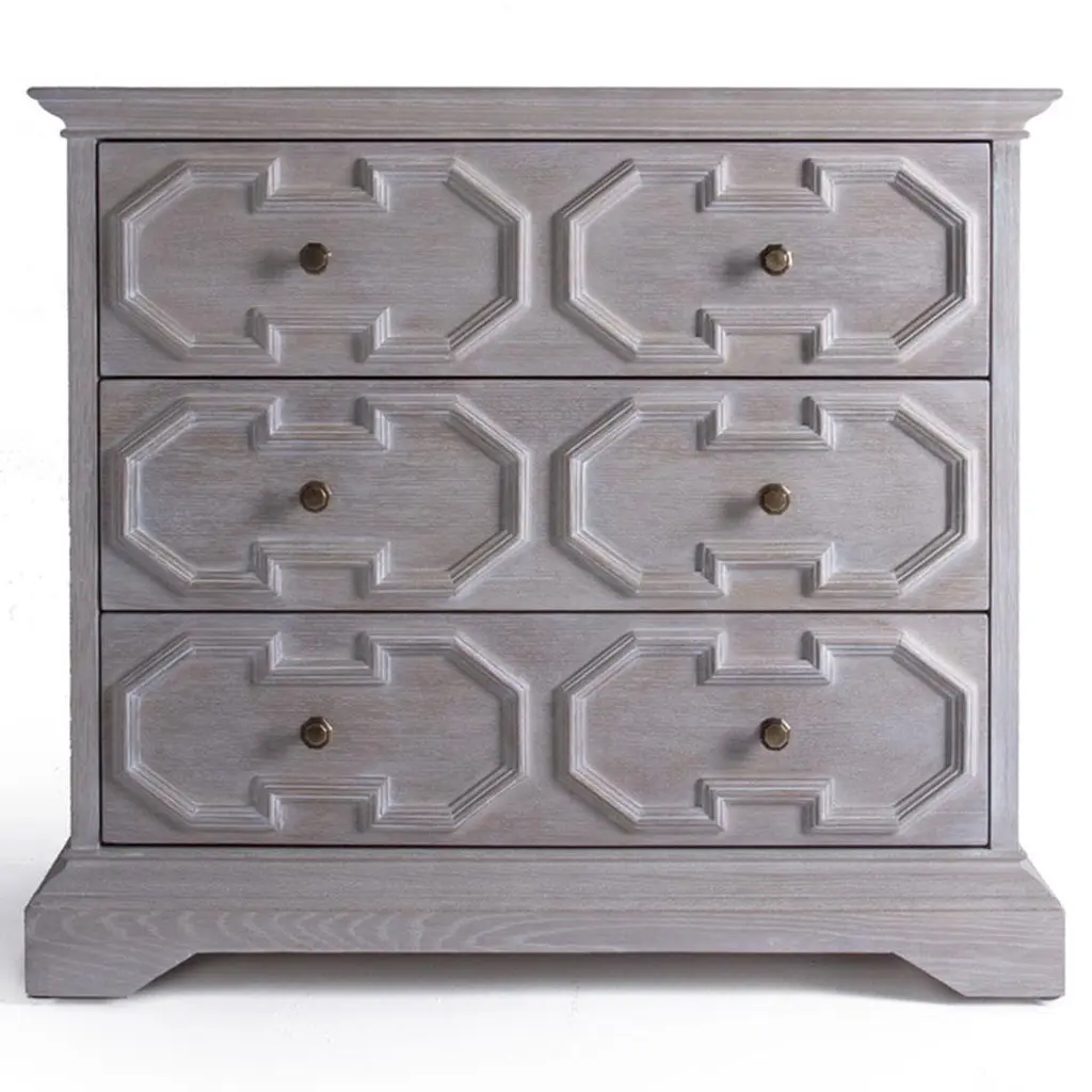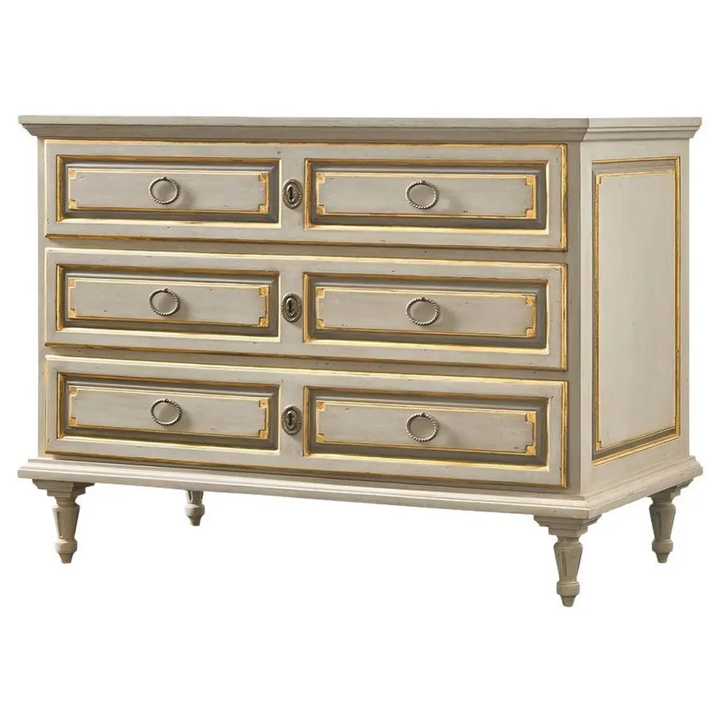 A Chinese Chippendale style painted chest of drawers, the rectangular paneled top, and sides above four blind fret paneled drawers, on similar bracket feet. Inspired by a George III original.Dimensions: 42" W x 20" D x 36" H