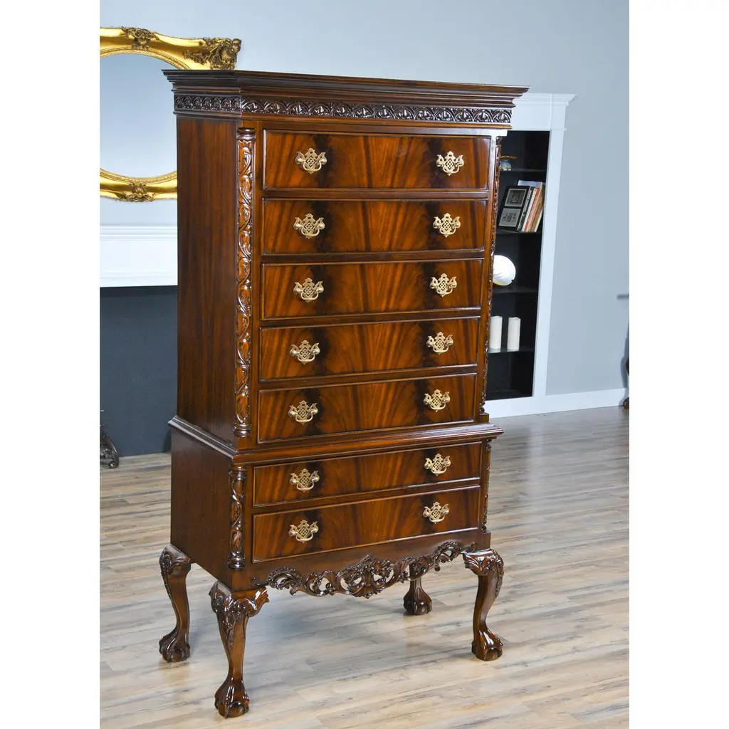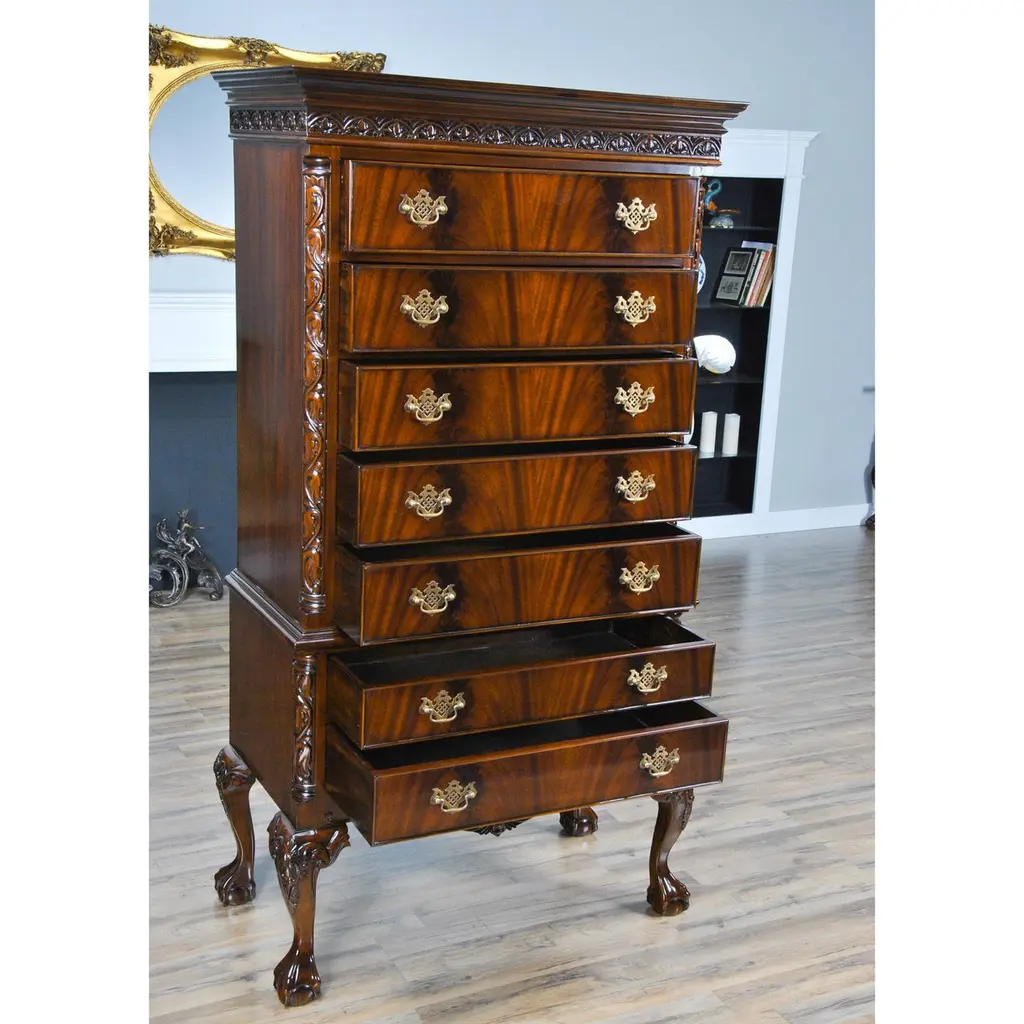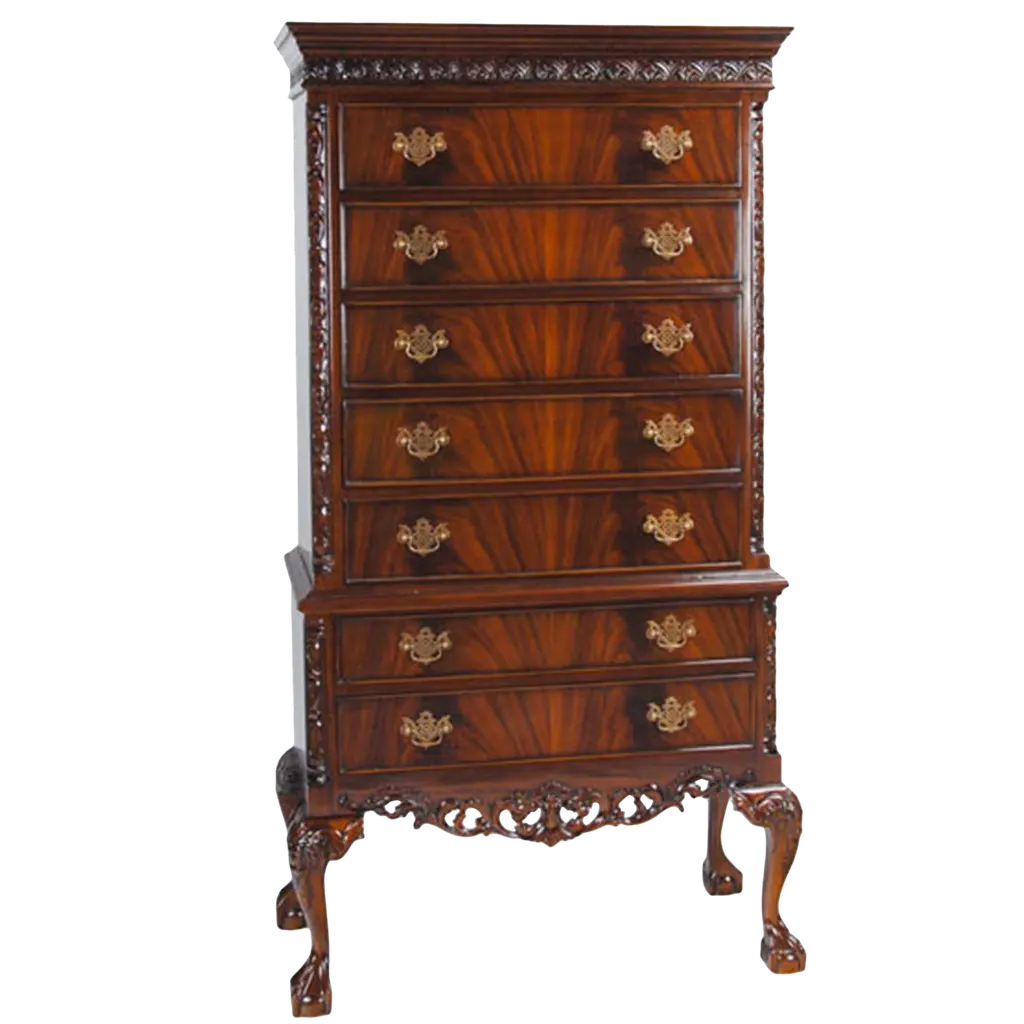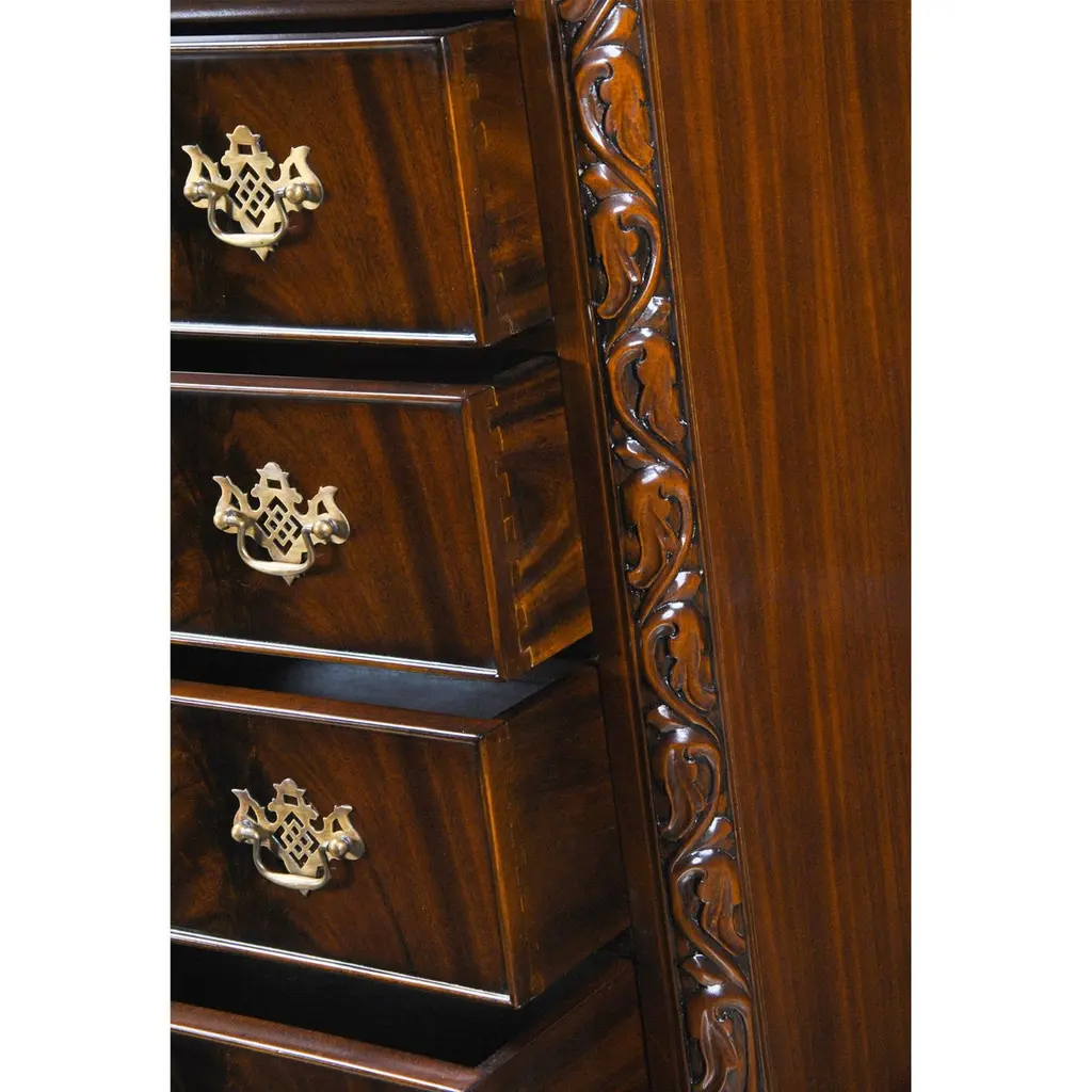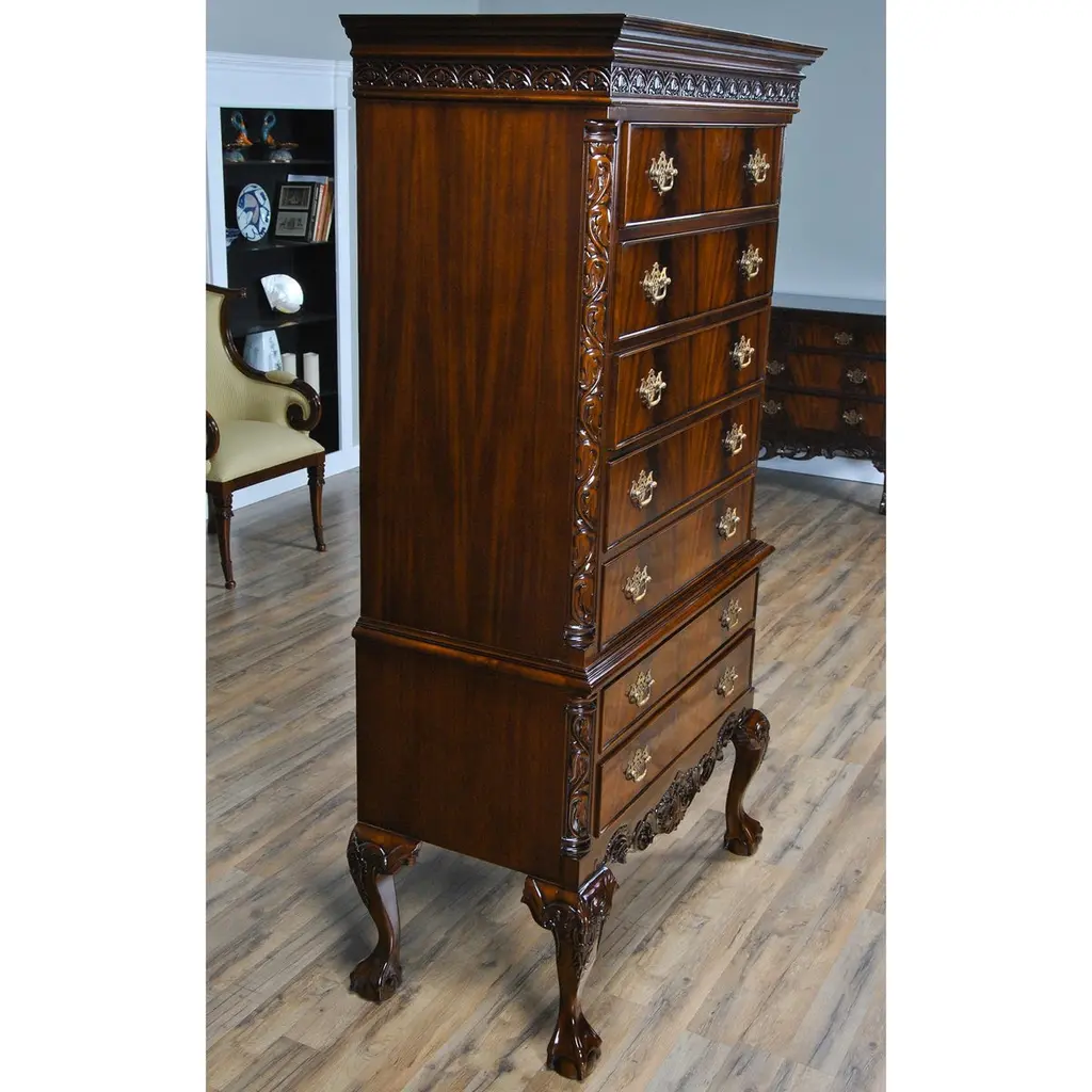 This Chippendale Mahogany High Chest will be the focal point of any room. Originally designed for the bedroom the practical storage space provided by this chest would be welcome anywhere in the home. Two part construction makes for easy handling and set up, seven generous sized drawers over beautifully proportioned ball and claw, hand carved solid mahogany cabriole legs give it a timeless appearance. The attractive mahogany veneers on the drawer fronts and high quality hardware are mesmerizing. The Chippendale Mahogany High Chest matches a number of other items in our collection for ideas on creating your own stunning bedroom.Measures 39 W x 21 D x 74 H. metric: 99 x 53 x 187.