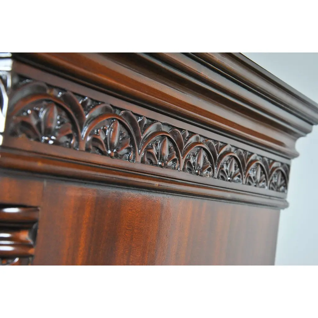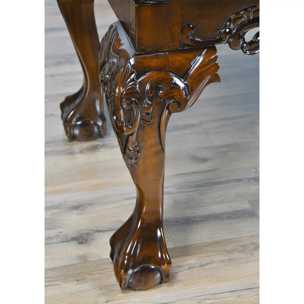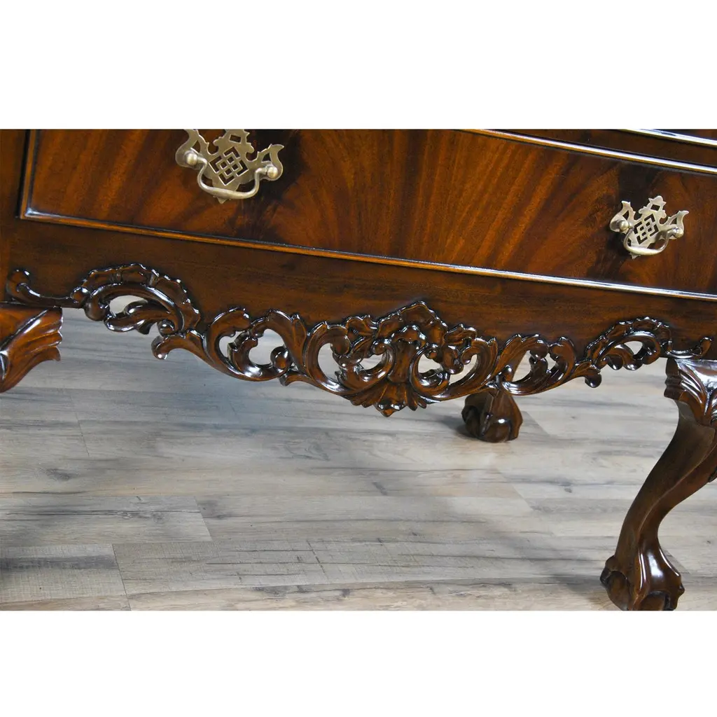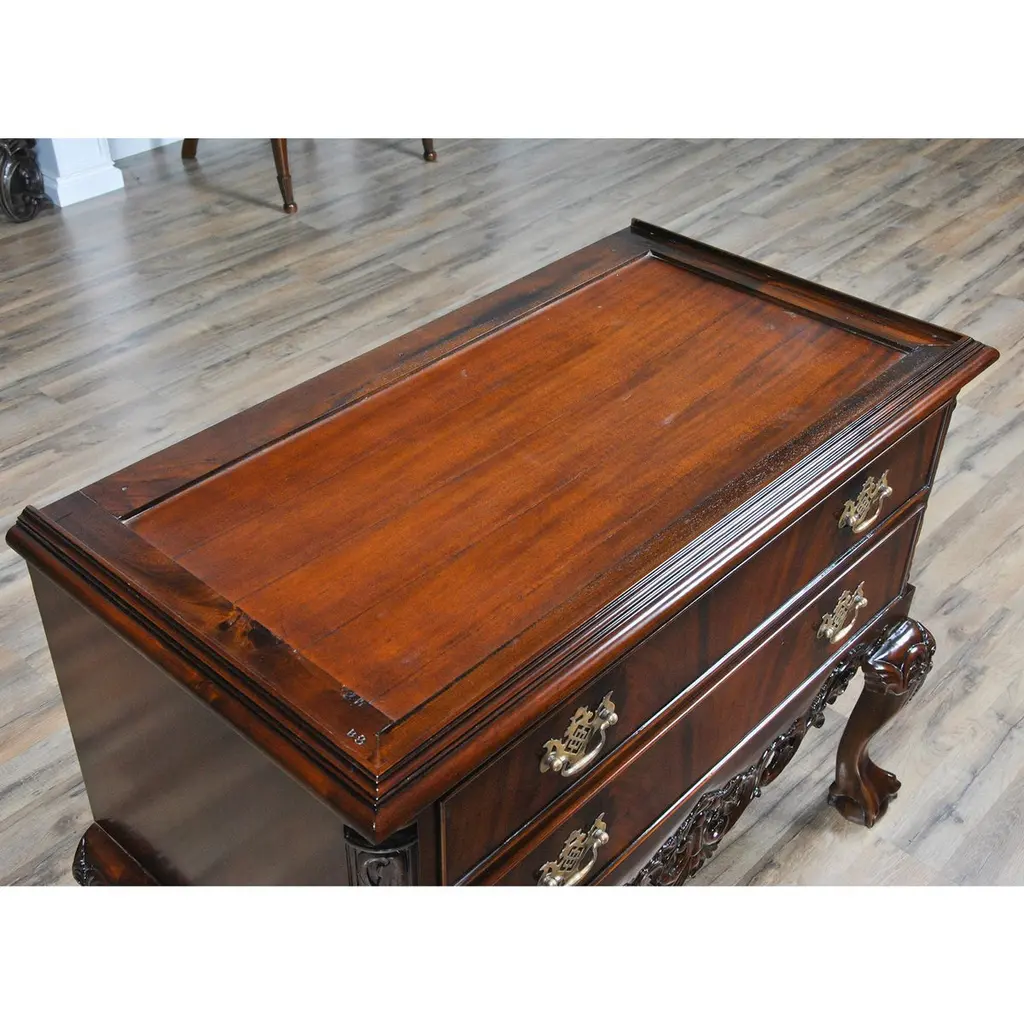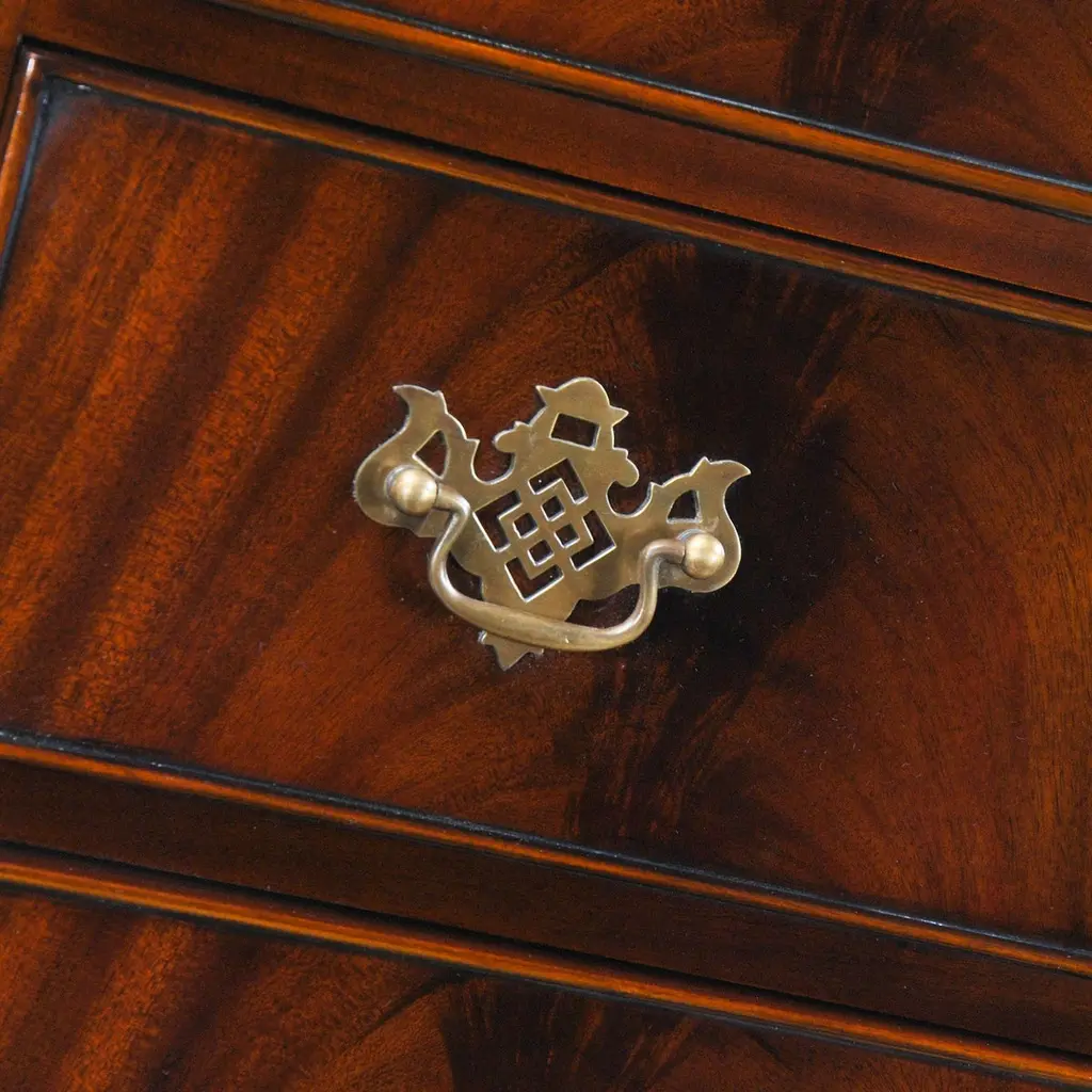 This Chippendale Mahogany High Chest will be the focal point of any room. Originally designed for the bedroom the practical storage space provided by this chest would be welcome anywhere in the home. Two part construction makes for easy handling and set up, seven generous sized drawers over beautifully proportioned ball and claw, hand carved solid mahogany cabriole legs give it a timeless appearance. The attractive mahogany veneers on the drawer fronts and high quality hardware are mesmerizing. The Chippendale Mahogany High Chest matches a number of other items in our collection for ideas on creating your own stunning bedroom.Measures 39 W x 21 D x 74 H. metric: 99 x 53 x 187.