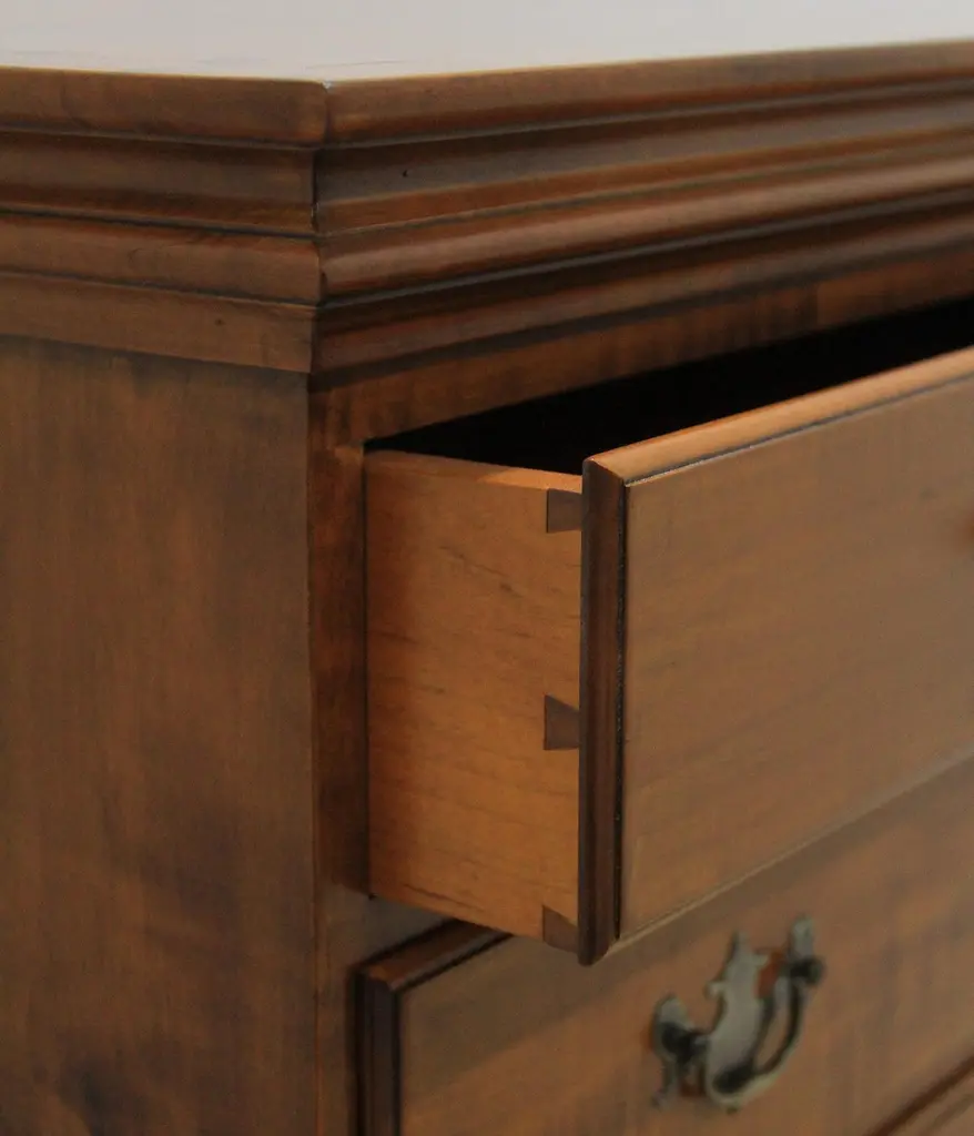 Our Chippendale tiger maple six drawer dresser is shown in our traditional stain with dovetailed drawer cases and top, OG bracket feet and Chippendale brass pulls available polished or antiqued with matching escutcheons. Custom sizes, wood types and finishes available.