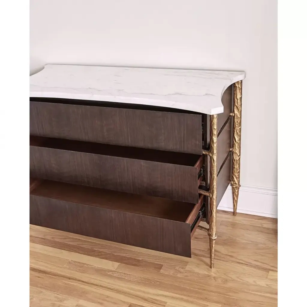 Made of solid mahogany and Mahogany veneer with a dark walnut satin finish. Chiseled metal frame is finished with gold metal leaf. Three extra wide drawers have full extension metal glides. Top is made of Carrera white marble.