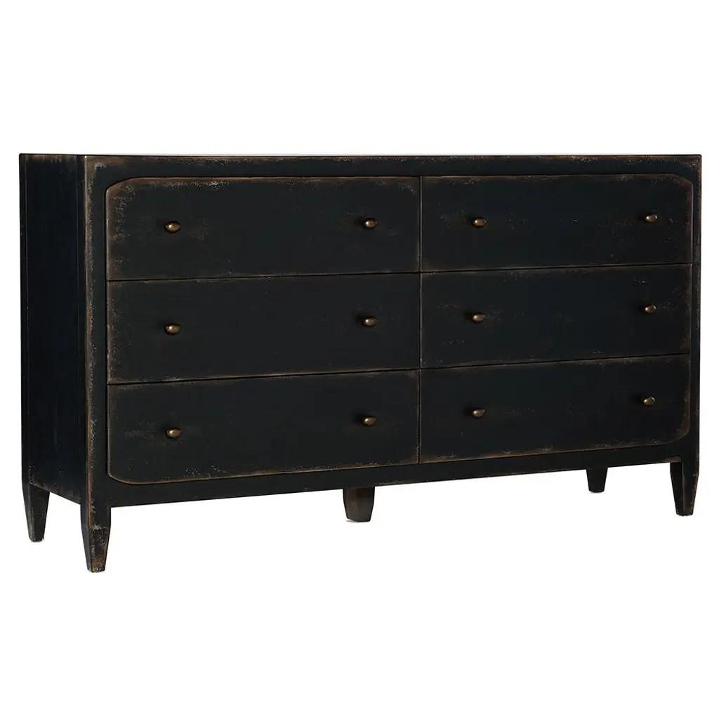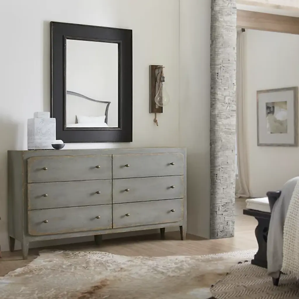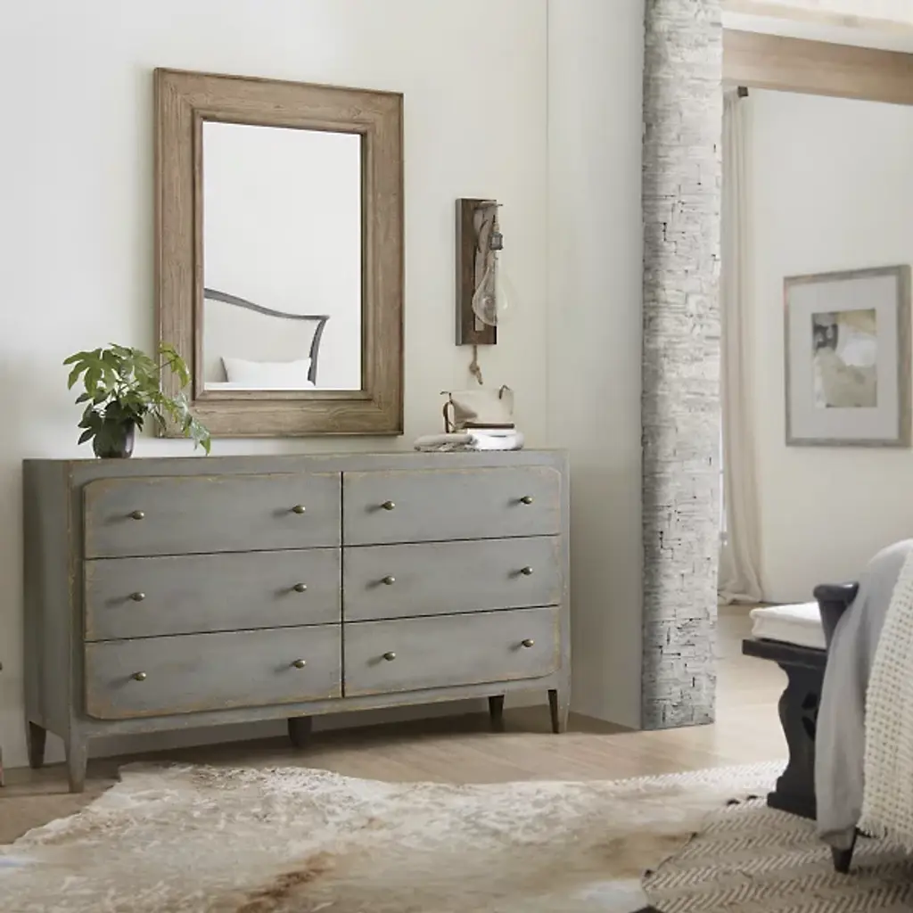 The Ciao Bella 6 Drawer Dresser by Hooker Furniture brings timeless charm and rustic elegance to any room. Inspired by well-loved European farmhouses passed down through generations, its multi-layered, rubbed finish gives it a beautifully aged look, and thoughtful details like the burnished brass hardware add both function and vintage flair. With its warm character and heirloom-quality craftsmanship, this dresser is designed to be as enduring as it is lovely, perfect to enjoy now and pass on later.