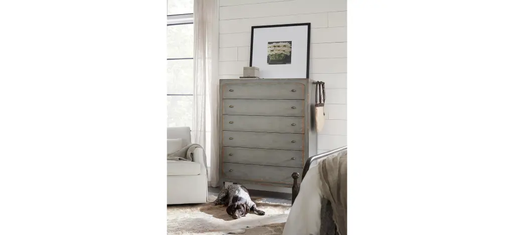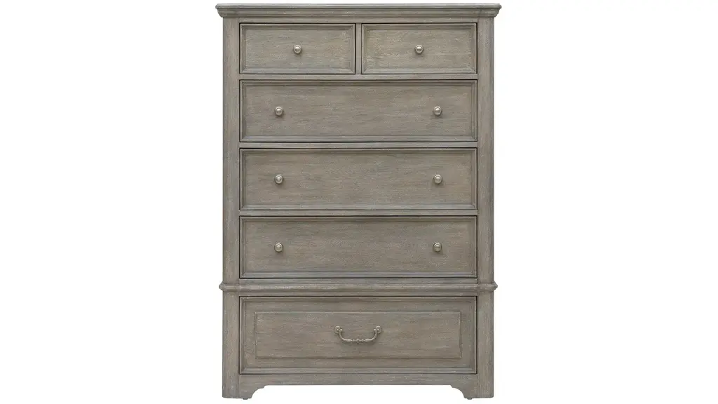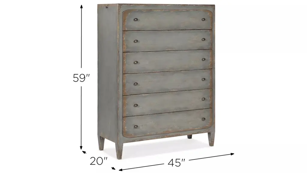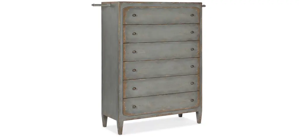 Inspired by European farmhouses, the 6-drawer Ciao Bella Chest reflects a simpler lifestyle. The Time Worn gray finish with multi-layer rub-through makes the chest look like it is been passed down through generations. A pull-out garment rod on either side of the case just above the top drawer provides a convenient space to hang frequently-used items or to lay out your clothes for early-morning departures. There is a drop-in felt liner in the top drawer, and the bottom drawer is cedar lined. Burnished brass hardware adds the finishing touch of style.