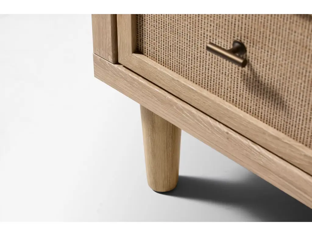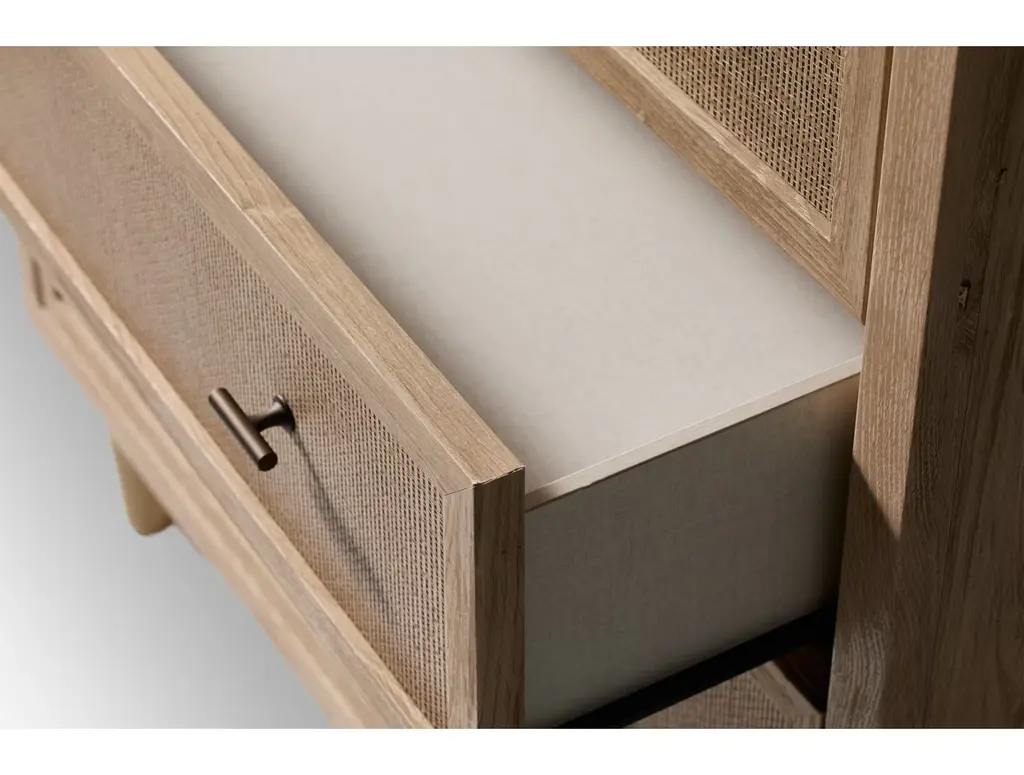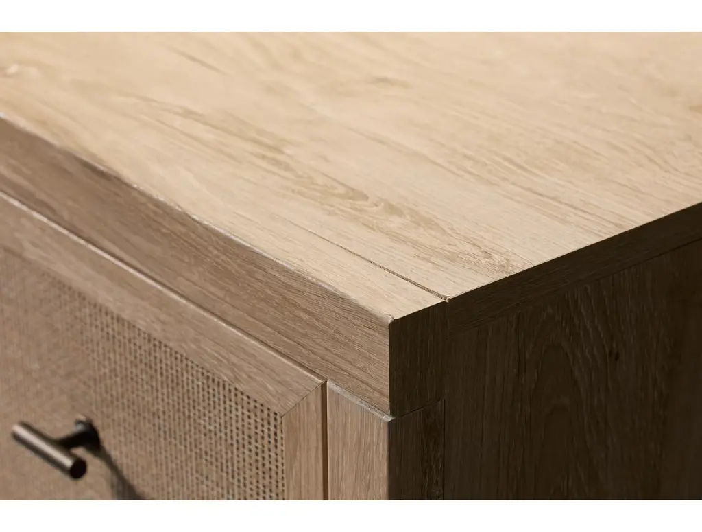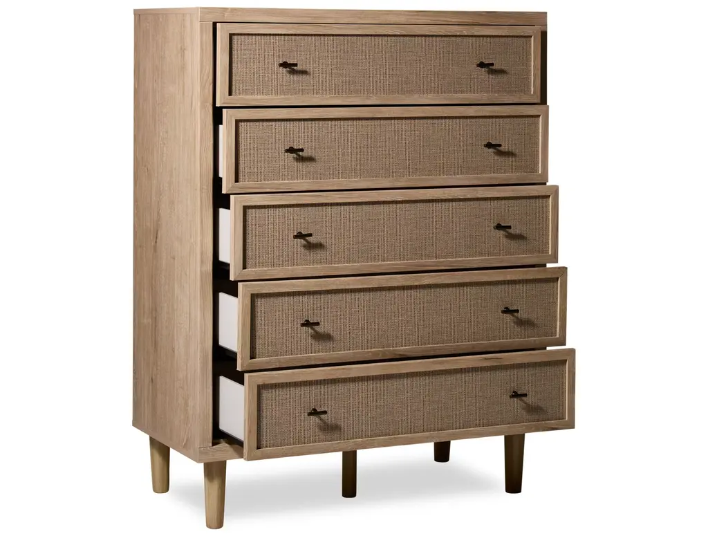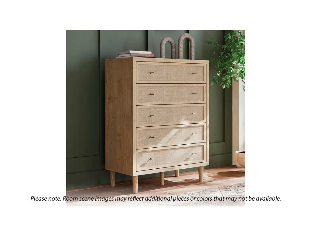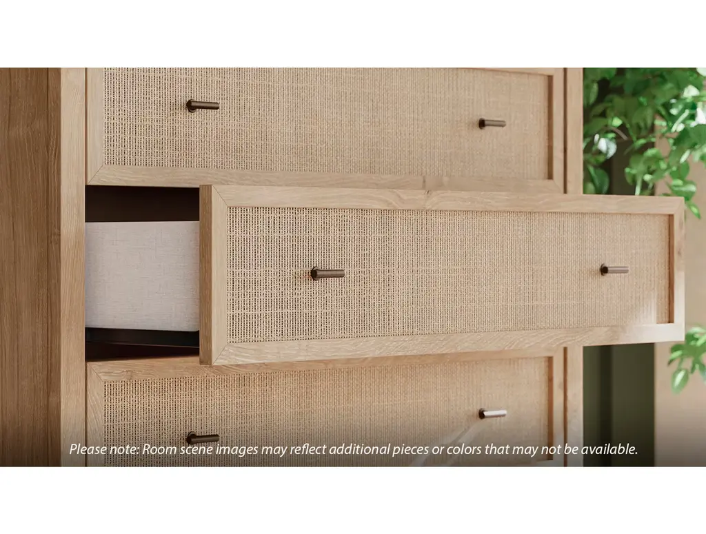 Brighten up your bedroom and add welcome storage with the Ashley Cielden 5 Drawer Chest. This contemporary-style chest features clean lines with five framed drawers that showcase cane-look fronts accented with bronze-finish hardware. The spacious drawer interiors are lined in faux linen for a fresh, finished look. Gently tapered legs, including a center support leg, complete the style of this versatile chest.