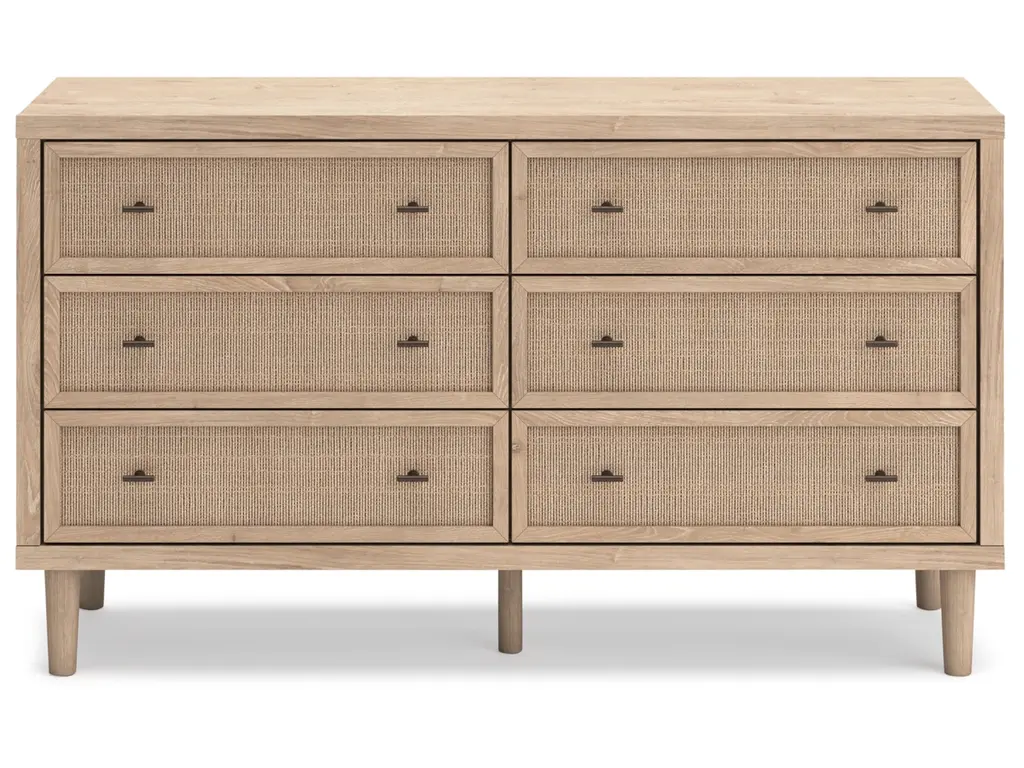 Clean-lined and contemporary—but far from stark—the Cielden dresser is a fresh style awakening. Pairing a light finish with replicated oak grain and textured beige details that replicate the look of cane, its mixed materials bring a naturally versatile vibe to your bedroom. Sleek, simple hardware plays perfectly with the modern aesthetic. Prepare to have your mind blown by the vast universe of possibilities that await within the spacious drawers.