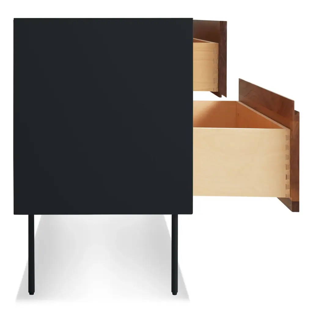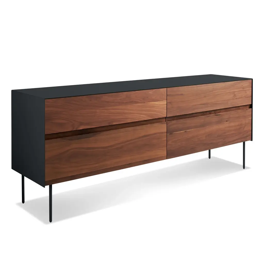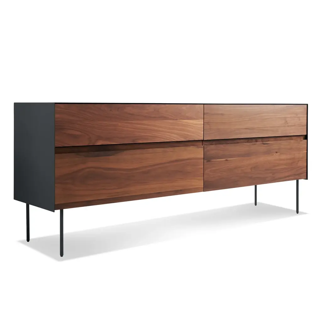 Sometimes we fall hard for a good mix of materials. Like beautiful, warm wood meeting the cool, smooth toughness of steel. This design marries 4 wood drawers with a powder-coated steel side, top and legs to form an alluring union. Integrated groove pulls and soft closure mechanisms on all 4 drawers.