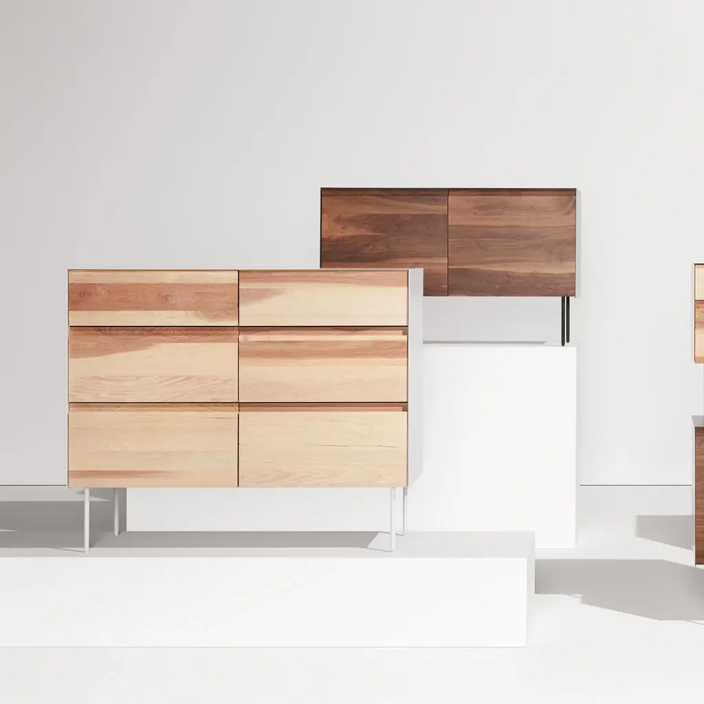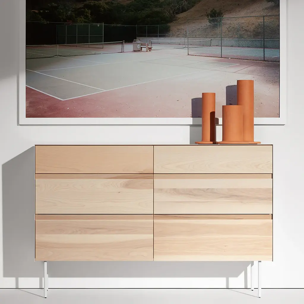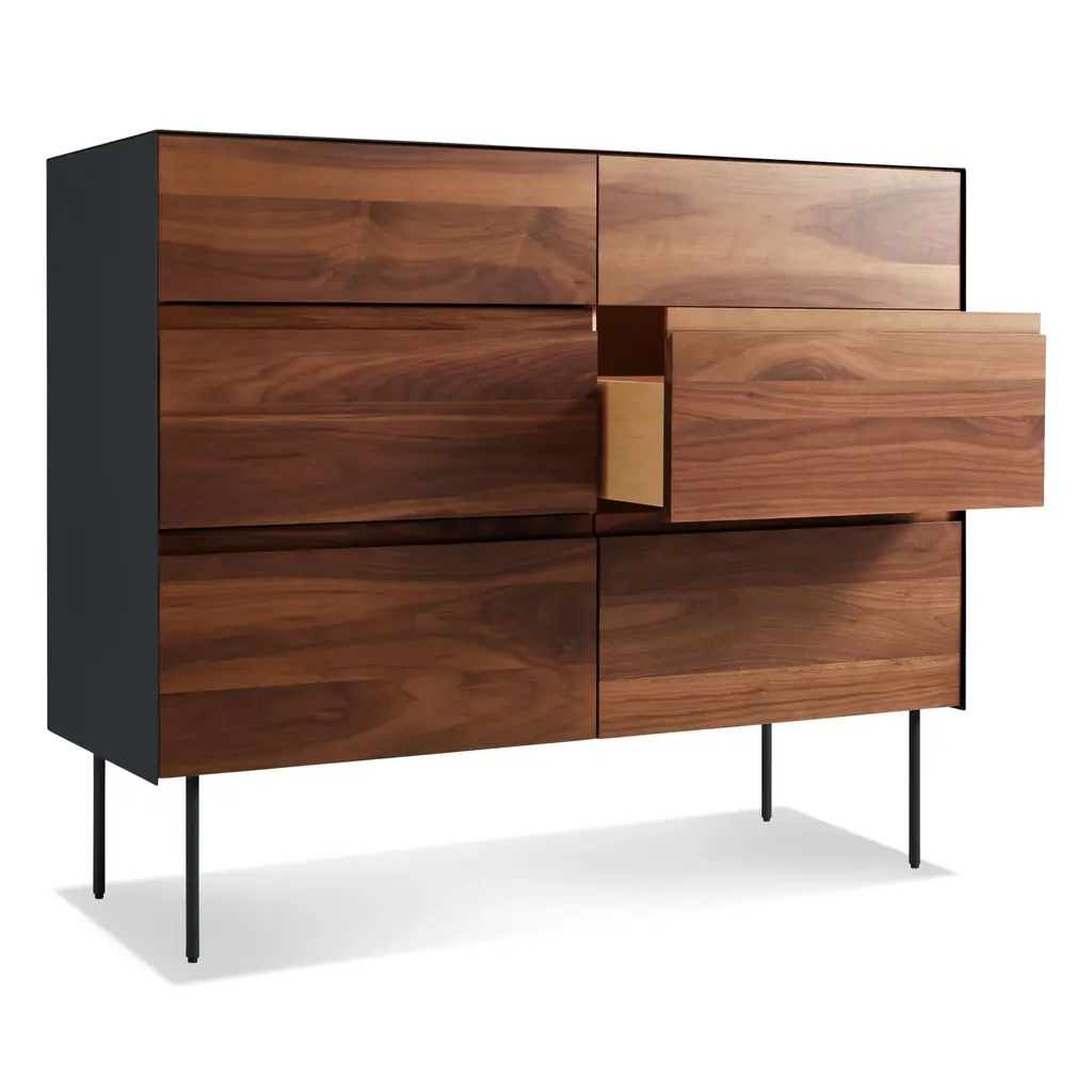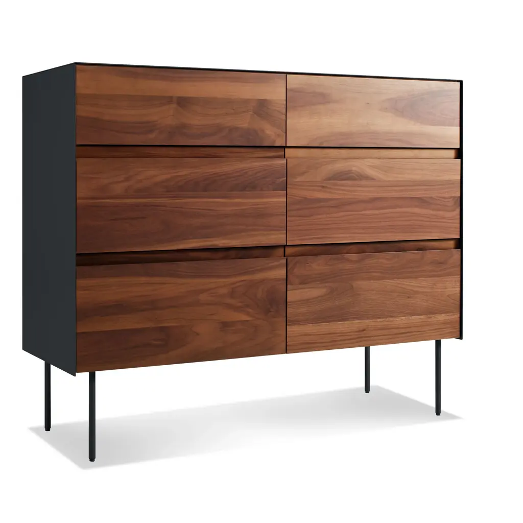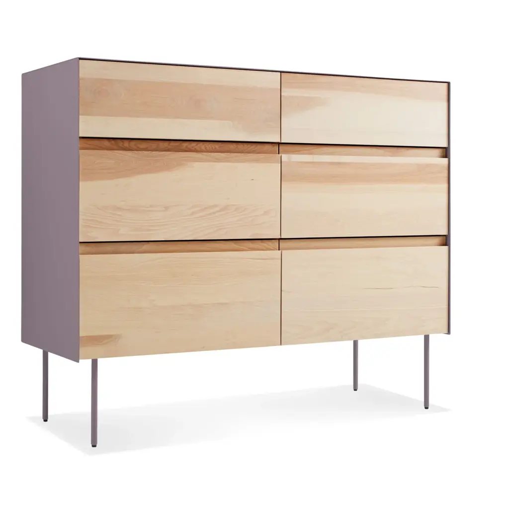 A minimalist's dream, the Clad 6 Drawer Dresser from Blu Dot offers clean-lines and quality construction for endless appeal. Showcasing an elegant, geometric design combining the beauty of wood and the durability of steel, this refined modern nightstand features solid wood drawers, neatly encased in a thin powder-coated steel skin, with integrated groove pulls that eliminates any visible hardware. Equipped with soft closure mechanisms on all drawers, neutral finish options elevate Clad's handsome silhouette making it the perfect storage piece for any master suite or guest bedroom set up. Highlights