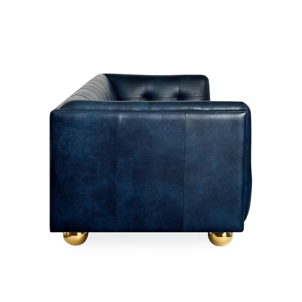 21st Century comfort. Our spin on the Classic Chesterfield. We took the original profile—clubby comfort, tailored tufting—and made it modern with a pared down silhouette. The finishing touch: oversized (and ultra-glam) brass orbs in place of traditional wooden bun feet. The perfect balance of formal and fresh, its loungey depth and neutral colorways (moody navy velvet or fresh stone linen) makes it a must-have for any abode.Specs:Brogue navy leather upholstery (100% Full Grain Leather)Brass plated ball feetProfessional cleaning recommended.