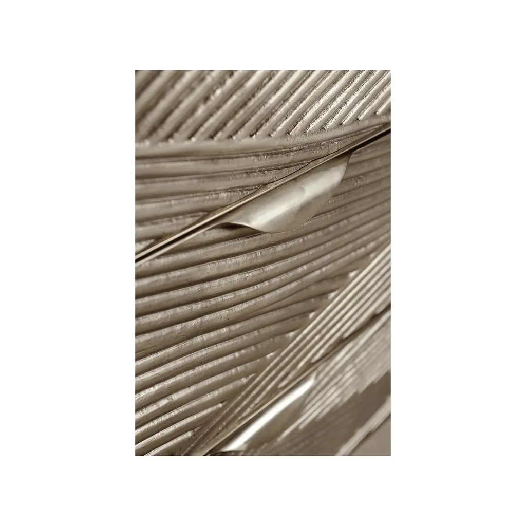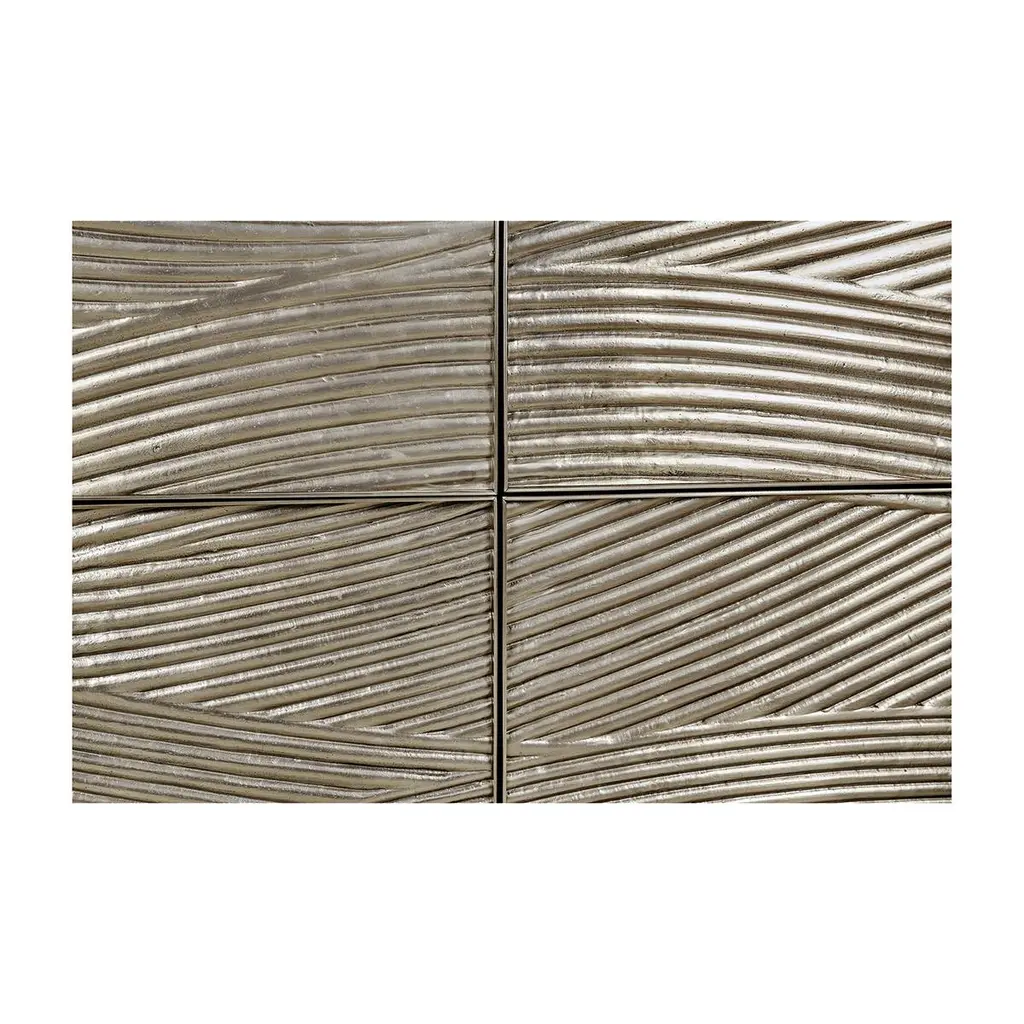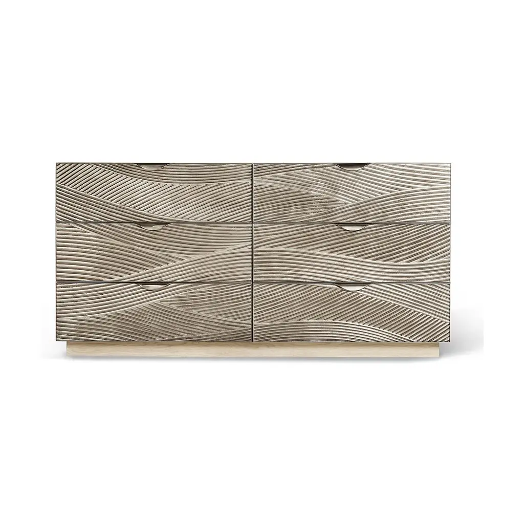 Coastal Modern Double Dresser, the cast metal texture double dresser features sculptural metal drawer fronts with a hand carved wave motif in satin white brass that shimmers against a bleached oak case.Understated functional elements such as masterfully shaped stainless steel pulls custom and a recessed hardwood pedestal blend seamlessly into its alluring forms.Dimensions: 72" W x 20" D x 36" H