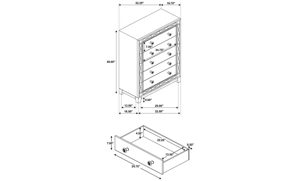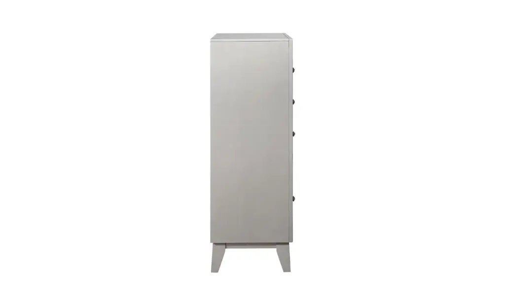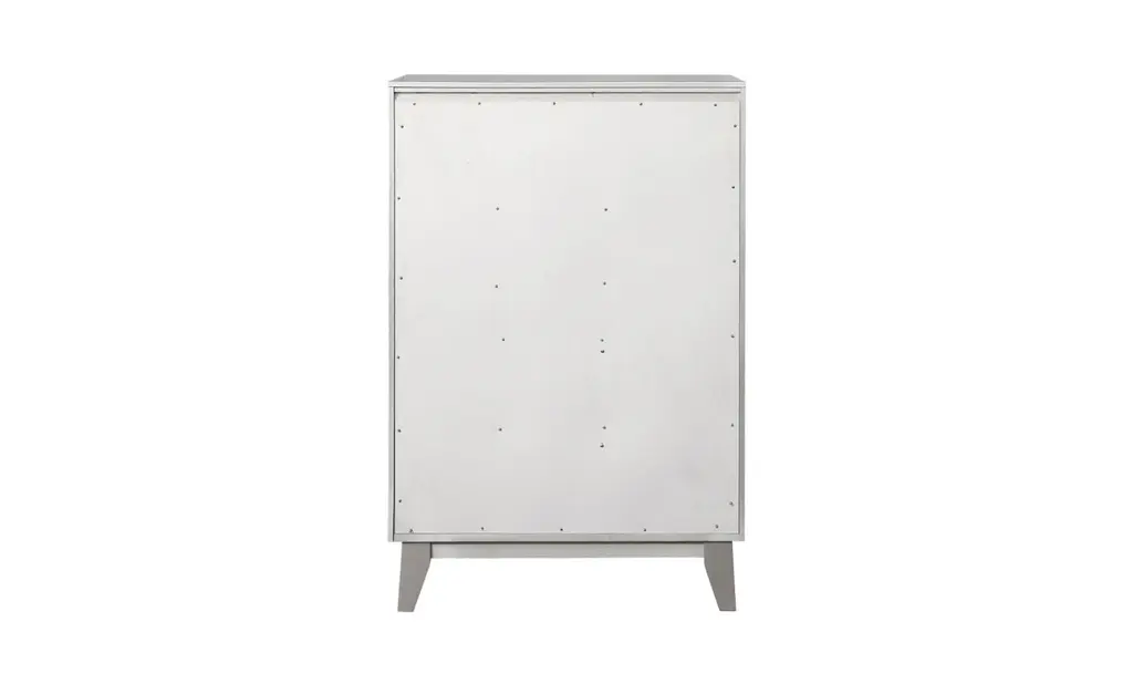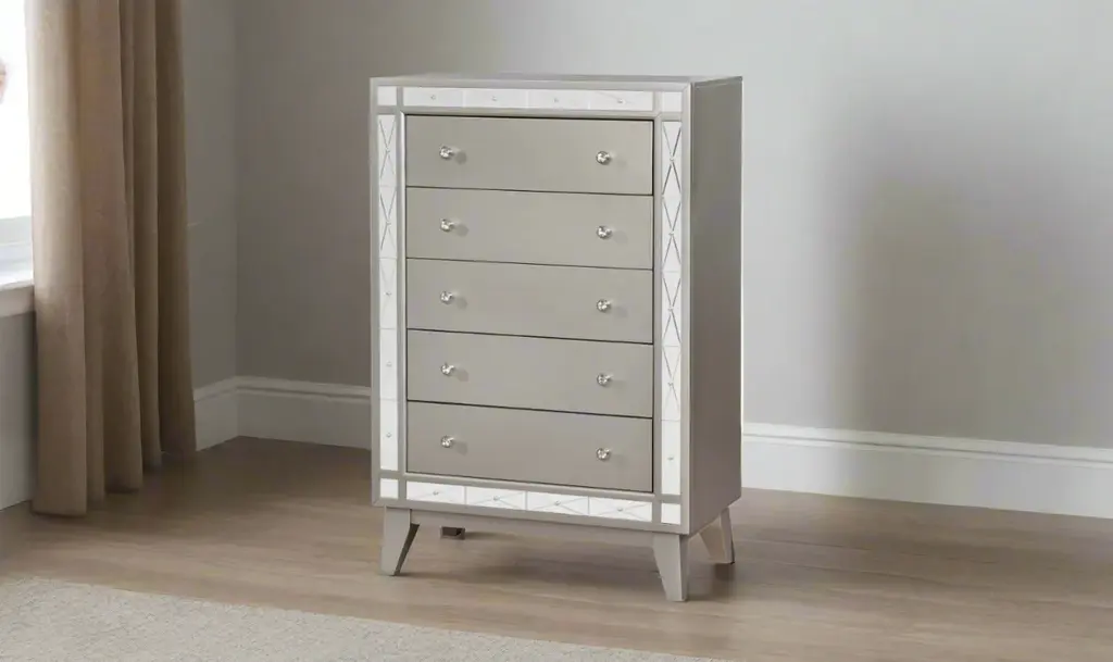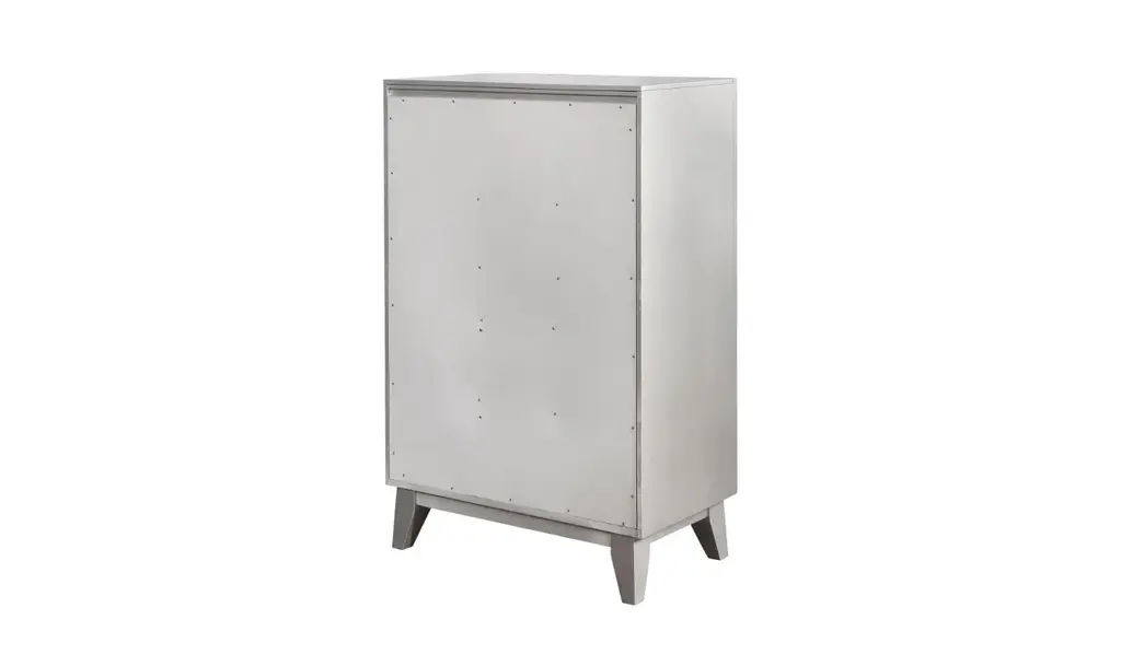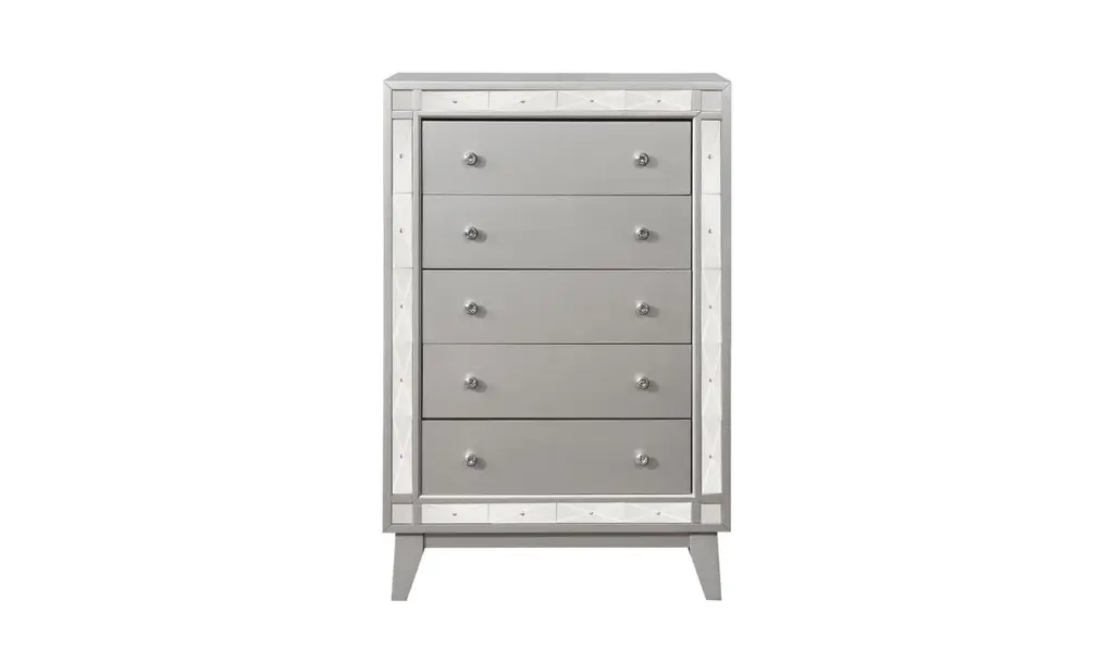 With brilliant, mirror-like accents, this chest adds a touch of shimmer to any bedroom. Jewel-like drawer handles lend an additional touch of shine. Its upgraded, metallic finish is reminiscent of sparkling mercury. Five large drawers offer plenty of convenient space for storage. With a glamorous, transitional design, this stunning chest really stands out.