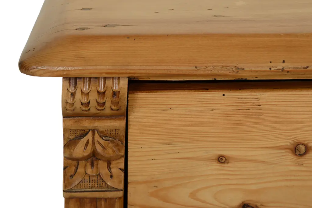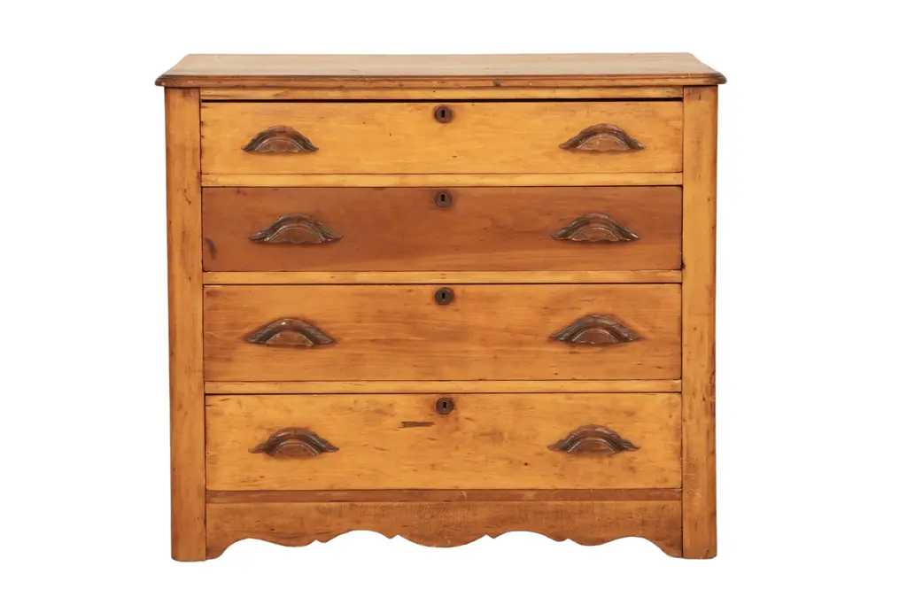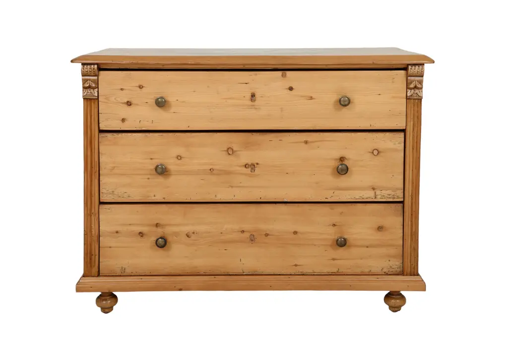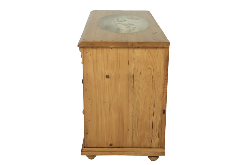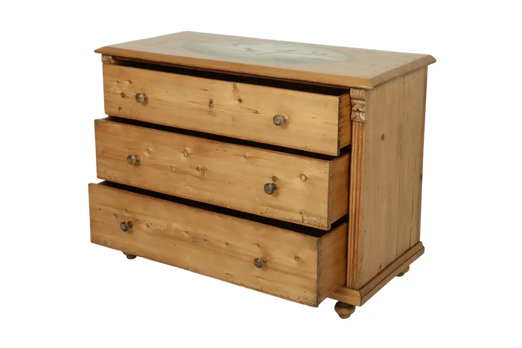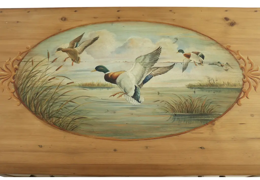 A colonial style dresser made of knotty pine. The dresser is hand painted on top with an idyllic oval scene of four mallard ducks landing on a lake with cattails beneath a fair weather sky. Fluted columns at each side, topped with simply carved capitals, flank three dovetailed drawers that open with mushroom knob handles. The piece is raised up on four turnip feet.