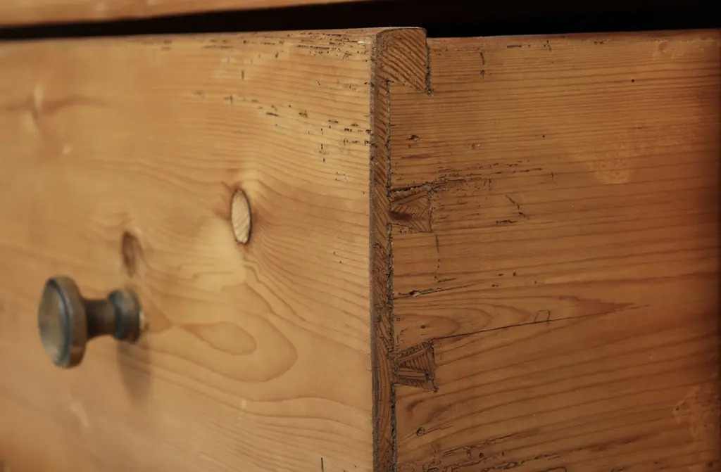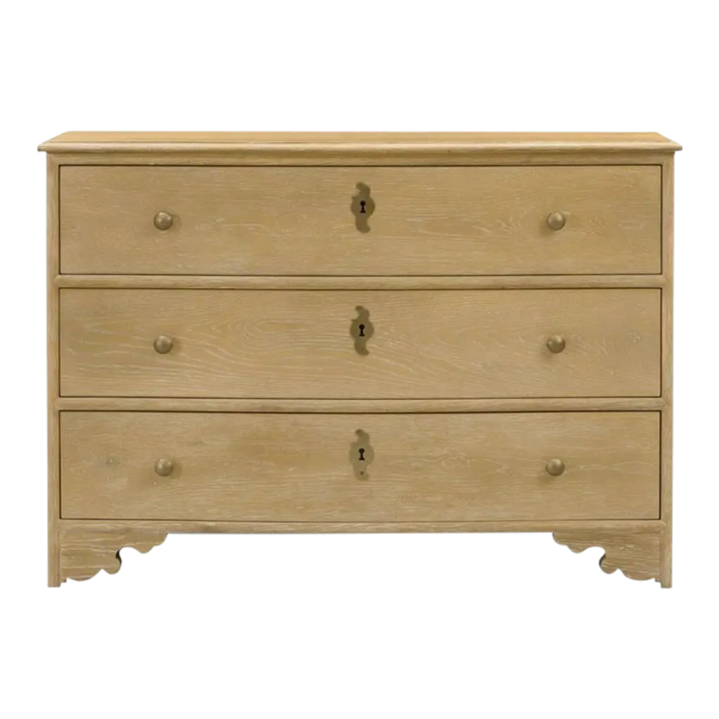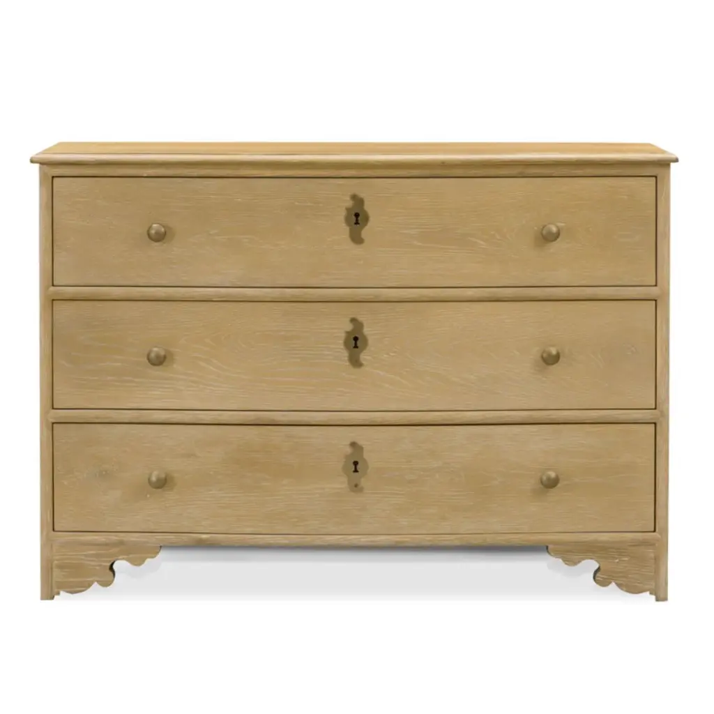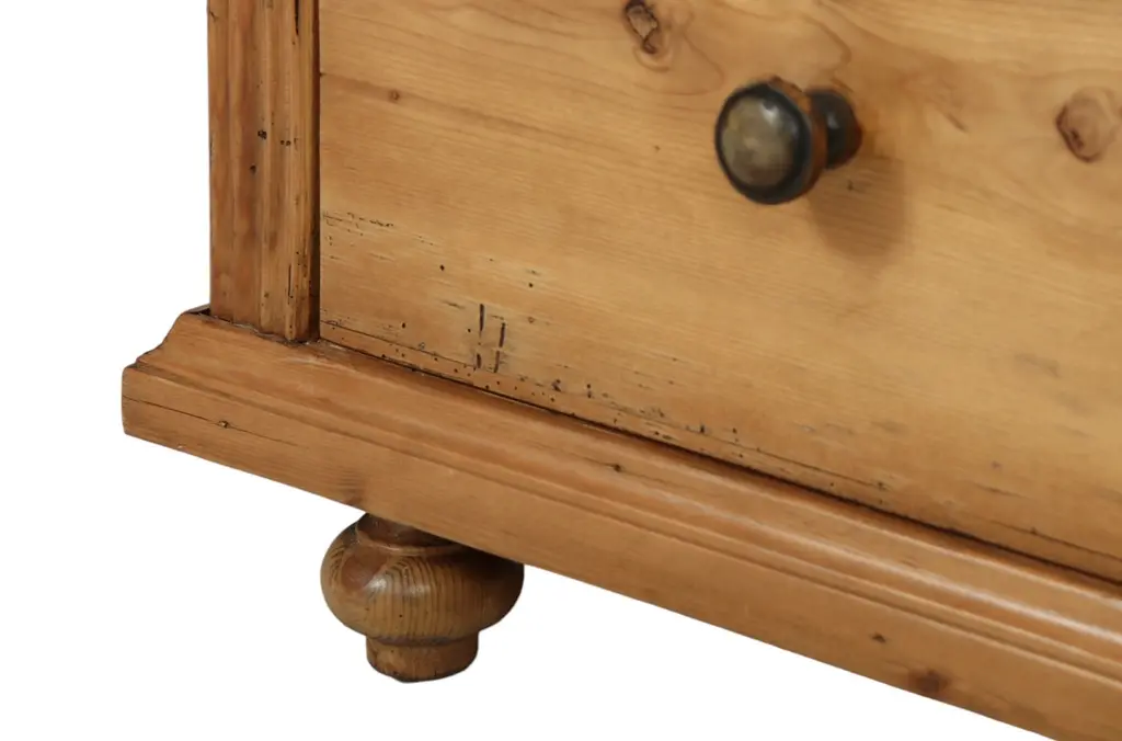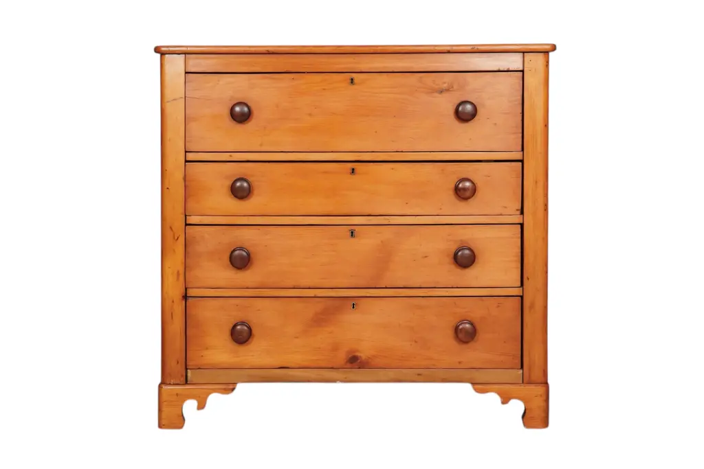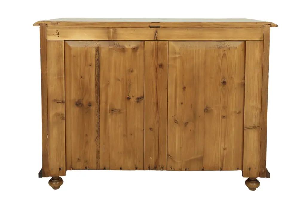 A colonial style dresser made of knotty pine. The dresser is hand painted on top with an idyllic oval scene of four mallard ducks landing on a lake with cattails beneath a fair weather sky. Fluted columns at each side, topped with simply carved capitals, flank three dovetailed drawers that open with mushroom knob handles. The piece is raised up on four turnip feet.