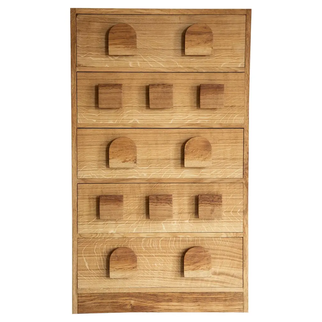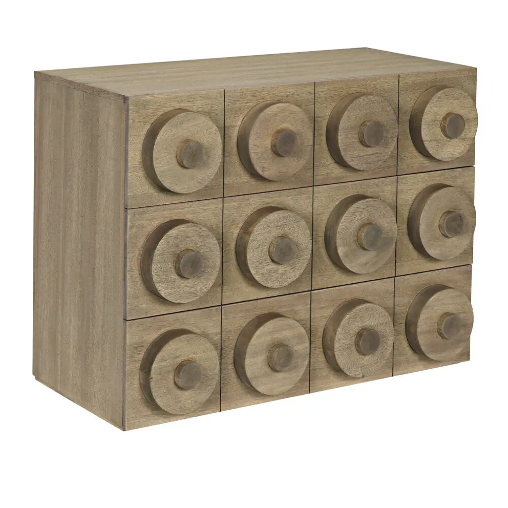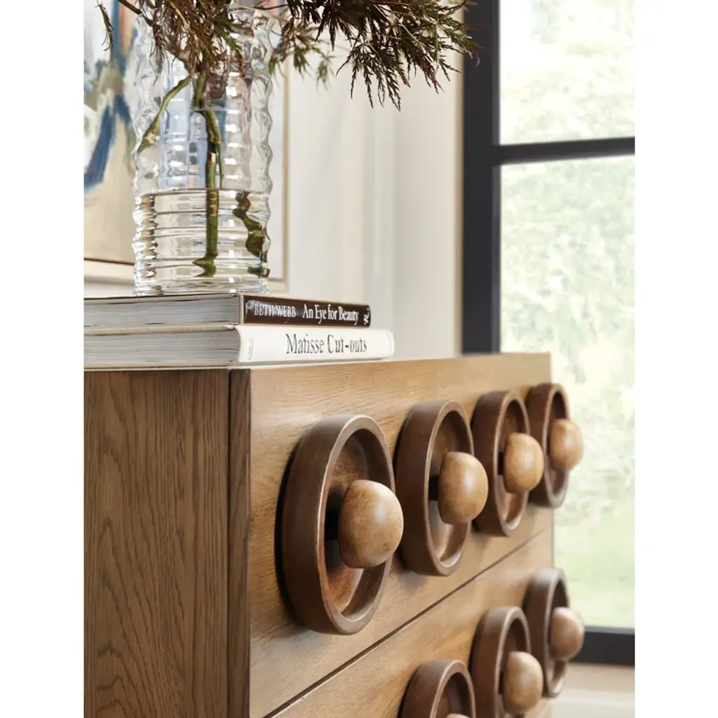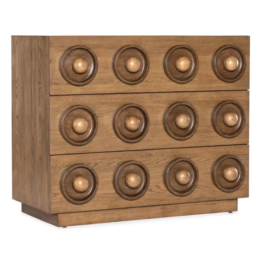 With a chic Bohemian flair, the knobby 3 - drawer accent chest has round contrasting dark wood backplates and large round wood knobs across each of the three drawers. Crafted of white oak in a light wood finish, it has a plinth base.
