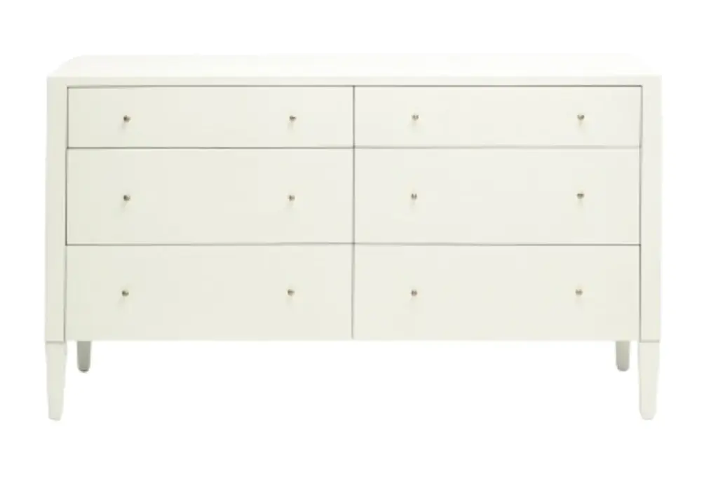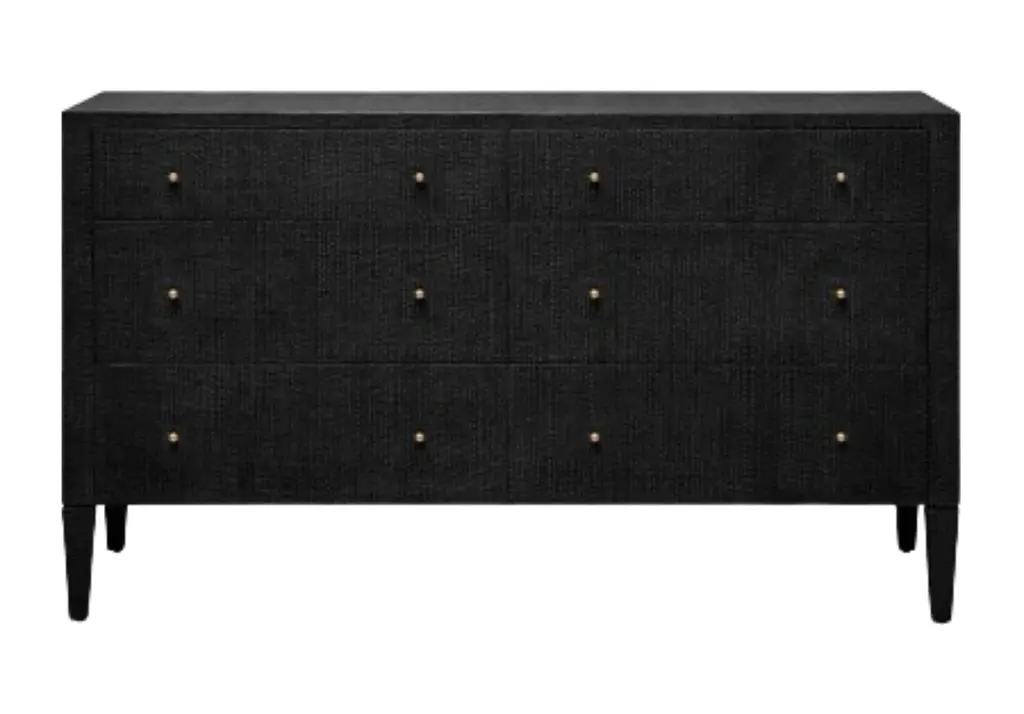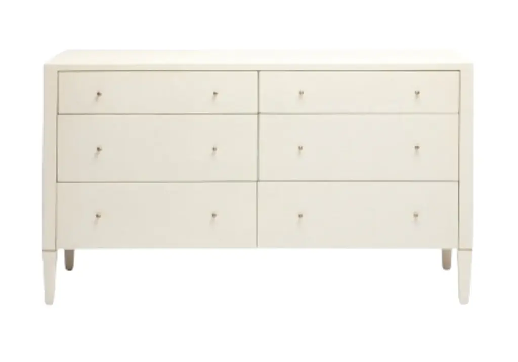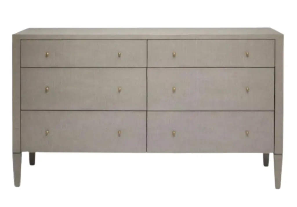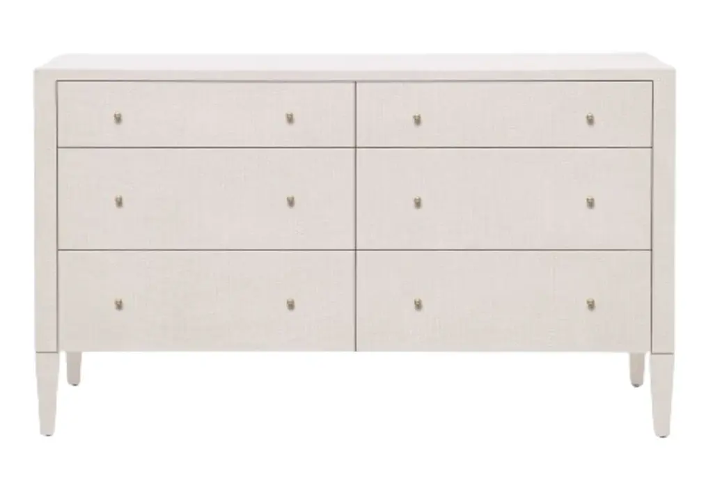 This dresser boasts a streamlined form complemented by a beautiful faux raffia finish. Available in a variety of colors, it easily styles into any bedroom. Petite ball hardware lends an elegant touch, adorning the six spacious drawers. Tapered feet further elevate its sophisticated design, creating a beautiful addition.