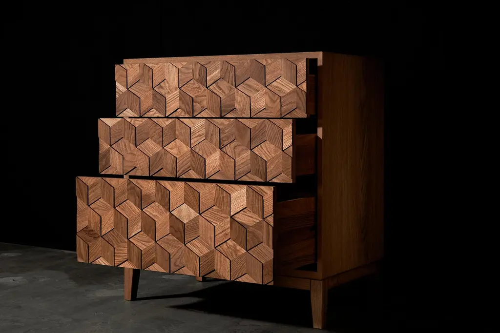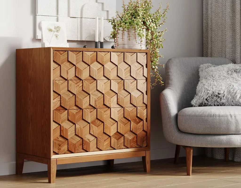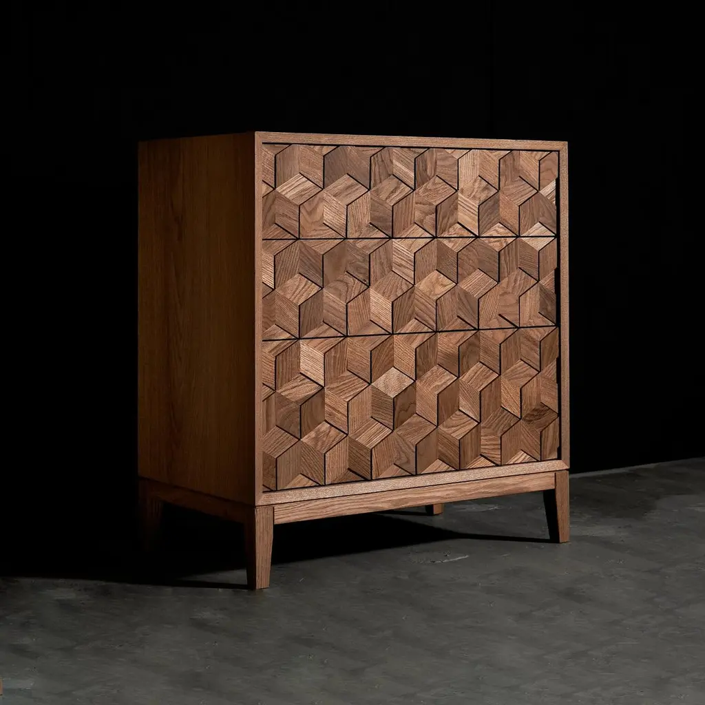 !! If you need a 3D model, just let us know !!A stylish Hexagon chest of drawers will effectively fit into a modern interior. The fonts are made of textured, 3D wooden panels in the hexagon shape, which give the chest of drawers volume and facilitate its construction. The luxurious texture of oak is emphasized by the unique pattern of each diamond. The chest of drawers will create a pleasant accent and harmoniously fit into the interior of minimalism, loft, eco, scandi, etc.The chest of drawers is made of MDF wood and lined with natural oak veneer. This allows you to enjoy the beauty of the wood texture and not worry about the stability of the structure.Each of our products is an example of high-class handmade with wood and other materialsThe use of dovetail joints is a tribute to the centuries-old history of furniture makers and an aesthetically beautiful design element for drawers.The combination of solid solid oak, natural oak veneer, mosaics of voluminous oak honeycombs and high-quality MDF wood allows you to reveal the beauty of the texture of natural wood and ensures the durability of the product.One-touch opening system by the Austrian brand Blum is reliable and comfortable.Wood furniture finishing with natural eco-friendly oils preserves the structure of the wood and fills the room with a pleasant woody aroma.