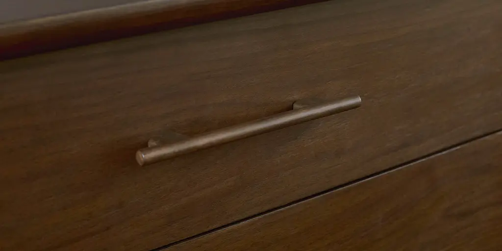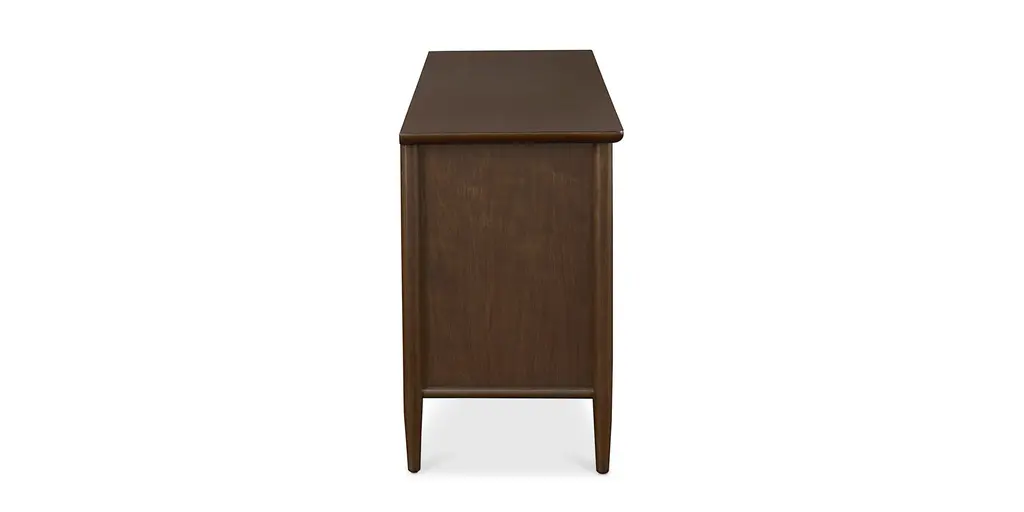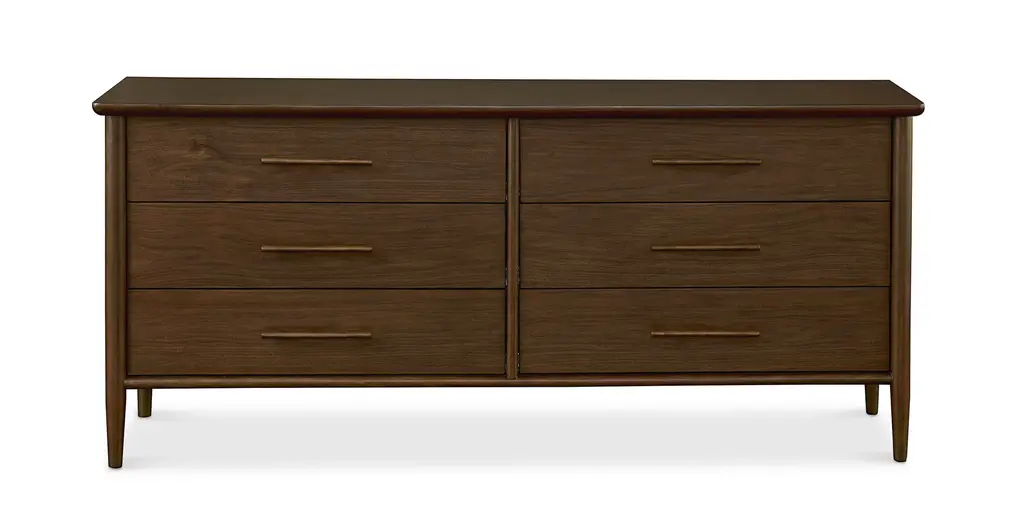 Coordinate clean lines and Danish mid-century mood into a bedroom of classic serenity with our Copenhagen 6 Drawer Dresser. The balanced symmetry of 3 half drawers on each side allows the strong yet subtle statement of the dresser's warm walnut veneer to claim your focus. The drawer boxes are crafted from sustainably grown solid hardwoods, while the simple yet elegant pulls are rendered from solid beech wood. Perched on its rounded wood legs, this Copenhagen dresser will help you stake a quiet claim to modern casual zen and quietude. See the rest of the Copenhagen collection for grouping pieces and melding them with those you already own.