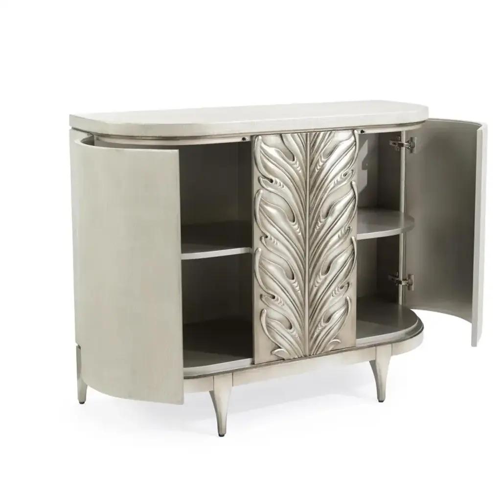 An ode to the timeless elegance of Ancient Greek architecture, the Corinthian Chest features two push-latched doors with a beautiful acanthus leaf in Burnished Pewter adorning the center. The body of beech wood is enveloped in exquisite white linen, delicately accented with shades of silver along the top and bottom. This regal, sophisticated piece unlocks the true potential of your interior space through a tasteful combination of historic inspiration and modern design sensibilities.