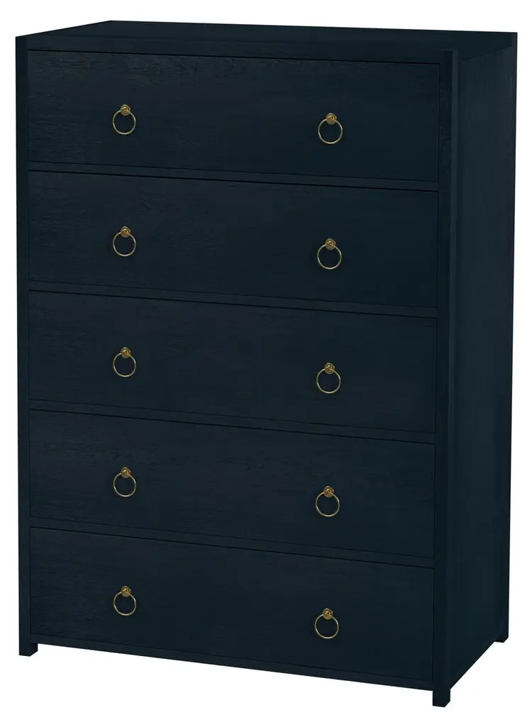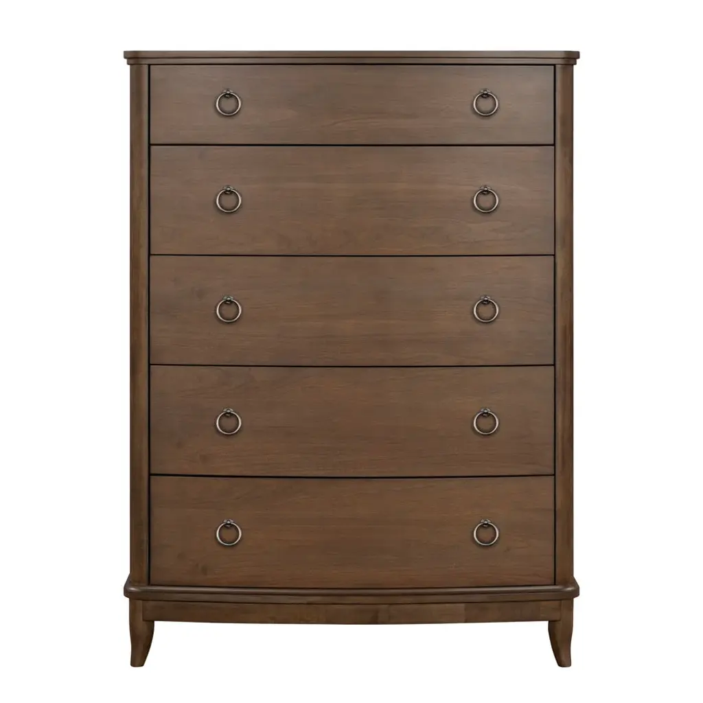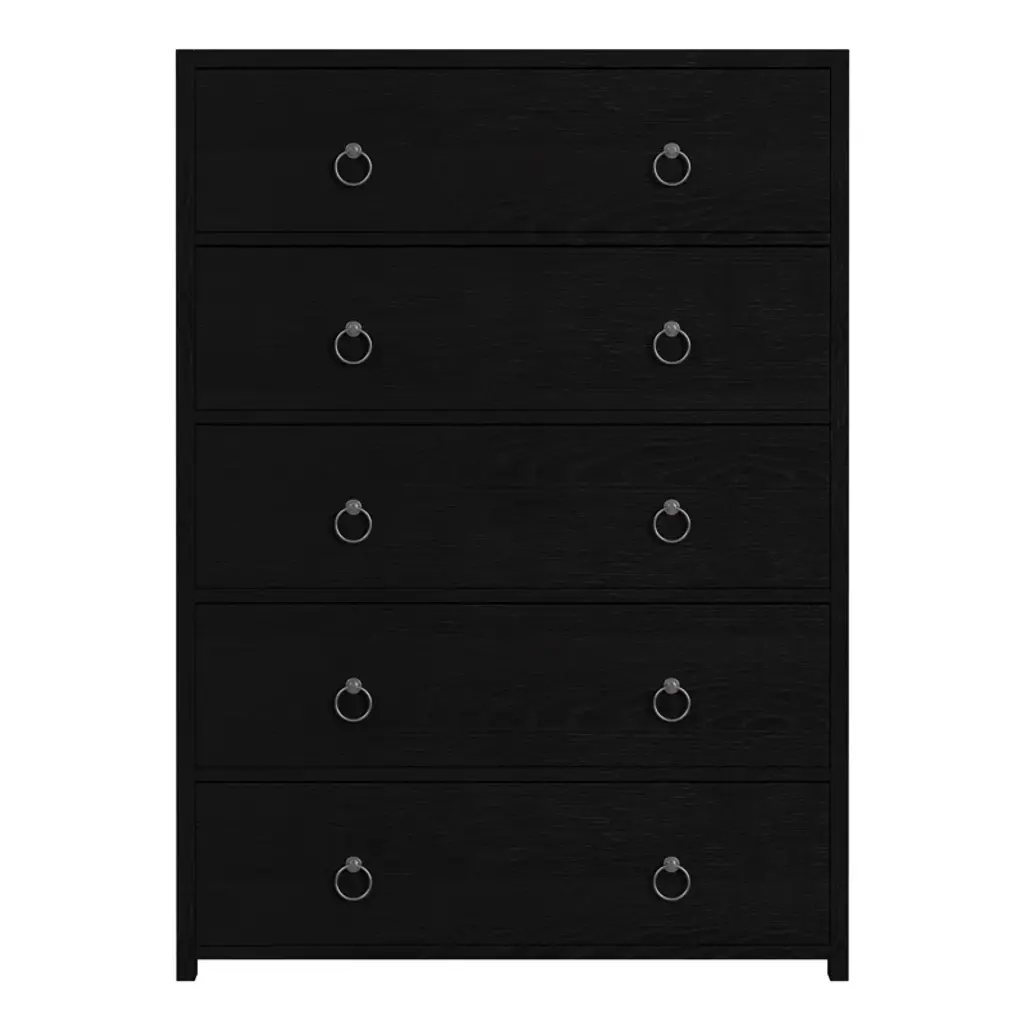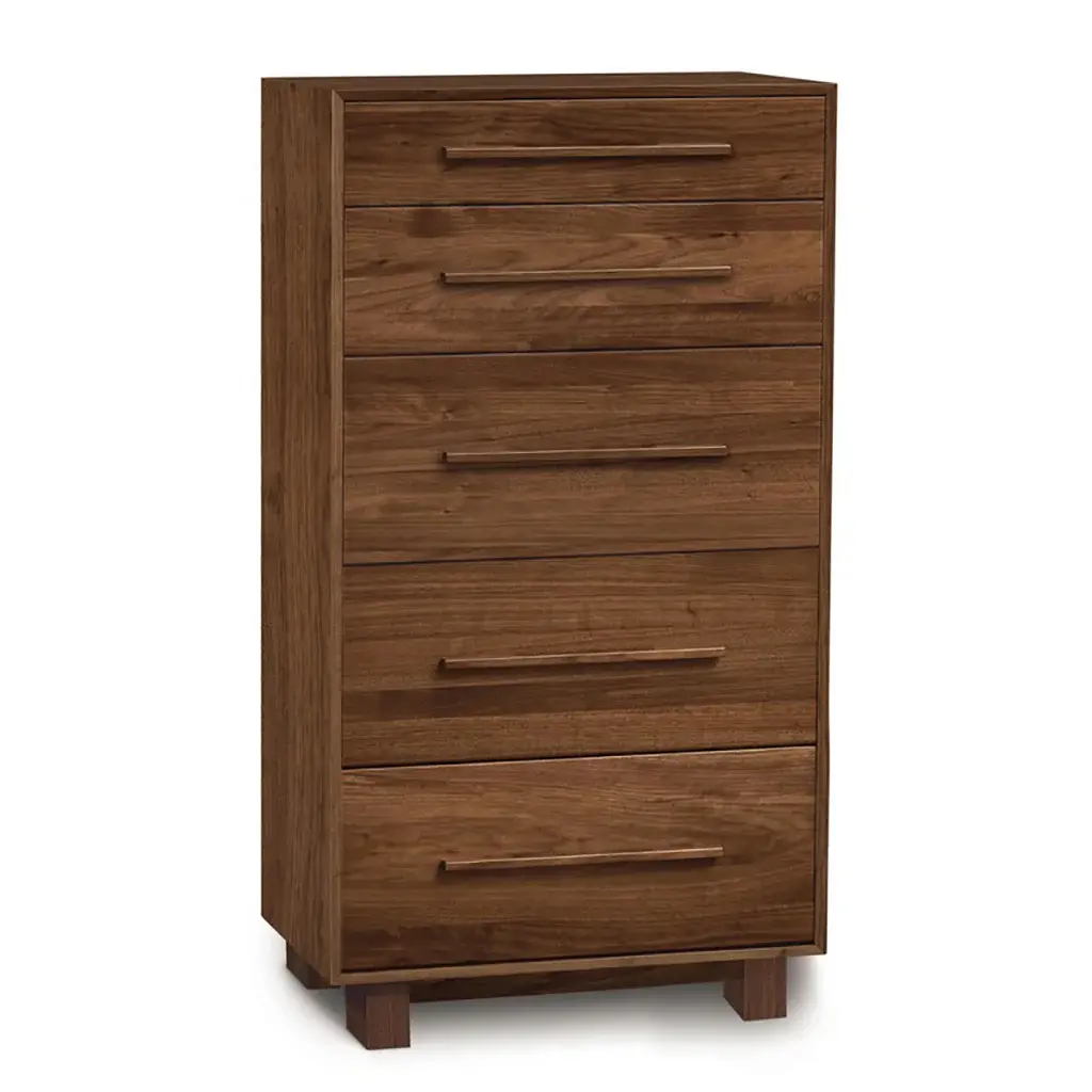 The Carmen five-drawer chest is a striking piece of furniture that combines modern design with functional storage. Its tall silhouette, accented by distinctive vertical wood detailing, creates a sense of contemporary elegance. The five spacious drawers offer ample storage, while the rich finish adds a touch of sophistication. This versatile piece is a captivating addition to any bedroom.